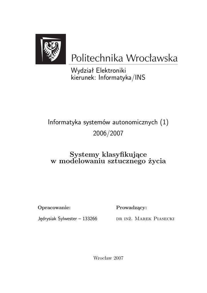 Wydział Elektroniki kierunek: Informatyka/INS Informatyka systemów autonomicznych (1) 2006/2007 Systemy klasyfikujące w modelowaniu sztucznego życia Opracowanie: Prowadzący: Jędrysiak Sylwester – 133266 dr inż. Marek Piasecki Wrocław 2007 SPIS TREŚCI Informatyka systemów autonomicznych Spis treści 1 System klasyfikujący 3 1.1 Definicja . . . . . . . . . . . . . . . . . . . . . . . . . . . . . . . . . . . . . 3 1.2 Składniki systemu klasyfikującego . . . . . . . . . . . . . . . . . . . . . . . 3 2 Sztuczne życie 4 3 Historia 5 3.1 Gra w życie . . . . . . . . . . . . . . . . . . . . . . . . . . . . . . . . . . . 5 3.2 Animki . . . . . . . . . . . . . . . . . . . . . . . . . . . . . . . . . . . . . . 5 4 Kiedy gonić listonosza 7 Literatura 9 Politechnika Wrocławska 2 1 System klasyfikujący 1 Informatyka systemów autonomicznych System klasyfikujący 1.1 Definicja System klasyfikujący jest to system, który uczy się prostych syntaktycznie reguł (zwanych klasyfikatorami ), w celu koordynacji swoich działań w dowolnym środowisku. Jest to specjalizowana aplikacja na bazie algorytmów genetycznych czasami nazywana agentem adaptacyjnym. Jedynym sposobem na stworzenie działającego systemu klasyfikującego jest sklasyfikowanie środowiska, w którym ma działać i efektywne wykorzystanie reguł. Jest to bardzo ludzki sposób obserwacji świata. Ludzie zawszę obserwują środowisko, dzielą je na kategorie, podkategorie. Gdy napotykamy jakąś nieznaną sytuację, próbujemy użyć metody, która wydaje się być najodpowiedniejsza w danym momencie. Systemy klasyfikujące mają zdolność do kategoryzowania swojego środowiska i dynamicznego tworzenia reguł, dzięki czemu mogą przystosowywać się do zmiennych warunków. 1.2 Składniki systemu klasyfikującego Podstawowymi elementami systemu klasyfikującego są: 1. środowisko wysyłające komunikaty, 2. dane wejściowe, 3. reguły, 4. algorytm genetyczny. Układ przetwarzania komunikatów w systemie klasyfikującym stanowi szczególny przypadek systemu produkcji. Choć rozmaite warianty systemów produkcji różnią się szczegółami składniowymi, ogólnie biorąc produkcje mają w nich następującą postać: jeśli < warunek > to < akcja > Na pierwszy rzut oka ograniczenie się do tak prostego mechanizmu reprezentacji wiedzy wydaje się zbyt restrykcyjne. Jednakże dowiedziono, że systemy produkcji są systemami uniwersalnymi obliczeniowo. Co więcej są one dogodne w aspekcie algorytmicznym. Systemy klasyfikujące dopuszczają jedynie reguły mające reprezentacje o stałej długości. Takie ograniczenie ma dwie zalety. Po pierwsze wszystkie ciągi symboli określonego Politechnika Wrocławska 3 2 Sztuczne życie Informatyka systemów autonomicznych alfabetu są poprawnymi syntaktycznie regułami. Po drugie, reprezentacja w postaci słów o ustalonej długości umożliwia zastosowanie operacji typu genetycznego. Dzięki temu powstaje możliwość wykorzystania algorytmu genetycznego do poszukiwań w przestrzeni dopuszczalnych reguł. W tradycyjnych systemach doradczych wartość określonej reguły w stosunku do innych reguł zostaje ustalona przez programistę na podstawie ocen eksperta lub grupy ekspertów, których dany system ma emulować. W systemie uczącym się reguł nie ma miejsca na taki luksus. Względna wartość różnych reguł jest właśnie jedną z podstawowych rzeczy, których trzeba się wyuczyć. W celu wspomagania tego typu uczenia się systemy klasyfikujące zmuszają klasyfikatory do koegzystencji w ramach „rynku usług informacyjnych”. Klasyfikatory konkurują ze sobą o prawo do reakcji na komunikaty, przyznawane tym spośród nich, które składają najkorzystniejsze oferty, przy czym opłaty ponoszone z tego tytułu służą jako źródło przychodu dla nadawców, których komunikaty zostały pomyślnie odebrane. W ten sposób tworzy się łańcuch pośredników między producentem (detektory) a konsumentem (akcje). 2 Sztuczne życie Pojęcie „sztuczne życie” wydaje się mieć w sobie coś sztucznego. Jest to dość niefor- tunne określenie. Przecież życie nie może być sztuczne. Życie z samego swojego założenia jest „żywe” i nie można mówić o sztuczności. A jeśli coś jest sztuczne nie ma mowy o istnieniu życia. Pojęcie to sugeruje, że człowiek w swoim twórczym pędzie zabiera się do stworzenia życia. Życie w każdym swoim przejawie i na każdej płaszczyźnie opiera się na prostych interakcjach pomiędzy poszczególnymi jednostkami, które wzajemnie na siebie wpływają. Widać tu bardzo silną analogię do systemów klasyfikujących. Ta prosta zasada obowiązuje w niezwykle złożonym i różnorodnym świecie żywych organizmów. Podobne zasady wykorzystał w 1968 roku brytyjski matematyk John Conway, tworząc Grę w Życie (Game of Life). Politechnika Wrocławska 4 3 Historia 3 Informatyka systemów autonomicznych Historia 3.1 Gra w życie Gra ta polega na stosowaniu określonych reguł (pojęcie reguły pojawia się po raz kolejny) dla każdego kwadratu reprezentującego komórkę w pewnej siatce. Te reguły to: • Każdy czarny kwadracik (komórka) jest żywy. Każda biała komórka jest martwa. • Każda komórka ma ośmiu sąsiadów. • Każda komórka może jako żywa przejść do następnej generacji, jeżeli jej dwóch lub trzech sąsiadów to żywe komórki. • Jeśli więcej niż trzy (zatłoczenie) lub mniej niż dwie (izolacja) sąsiednie komórki są żywe, to komórka umiera. • Każda martwa komórka może zostać ożywiona, jeżeli jej trzech sąsiadów to żywe komórki. Stosowanie tych reguł za każdym razem dla każdej komórki jest równoznaczne z przechodzeniem z jednego pokolenia do drugiego. Kolejne generacje charakteryzują się zmianami wzorów powstających przy wizualizacji tego procesu. Po rozpoczęciu działania algorytmu od jakiegoś początkowego schematu komórek (losowego lub konkretnego) można się spodzie