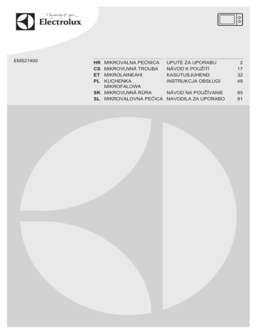 EMS21400 HR CS ET PL MIKROVALNA PEĆNICA MIKROVLNNÁ TROUBA MIKROLAINEAHI KUCHENKA MIKROFALOWA SK MIKROVLNNÁ RÚRA SL MIKROVALOVNA PEČICA UPUTE ZA UPORABU NÁVOD K POUŽITÍ KASUTUSJUHEND INSTRUKCJA OBSŁUGI 2 17 32 48 NÁVOD NA POUŽÍVANIE NAVODILA ZA UPORABO 65 81 2 www.electrolux.com SADRŽAJ 1. INFORMACIJE O SIGURNOSTI........................................................................ 3 2. SIGURNOSNE UPUTE...................................................................................... 5 3. OPIS PROIZVODA............................................................................................. 7 4. PRIJE PRVE UPORABE.................................................................................... 8 5. SVAKODNEVNA UPORABA..............................................................................9 6. KORIŠTENJE PRIBORA.................................................................................. 12 7. DODATNE FUNKCIJE......................................................................................13 8. SAVJETI........................................................................................................... 13 9. ČIŠĆENJE I ODRŽAVANJE.............................................................................14 10. RJEŠAVANJE PROBLEMA............................................................................15 11. POSTAVLJANJE............................................................................................ 16 MISLIMO NA VAS Hvala vam što ste kupili Electrolux uređaj. Izabrali ste proizvod koji sa sobom donosi desetljeća profesionalnog iskustva i inovacija. Domišljat i elegantan, projektiran je misleći na vas. Stoga, uvijek kada ga koristite, možete biti sigurni znajući da ćete svaki put dobiti izvrsne rezultate. Dobrodošli u Electrolux. Posjetite našu internetsku stranicu za: Dobivanje savjeta o korištenju, prospekata, rješavanju problema, servisnim informacija: www.electrolux.com Registriranje vašeg proizvoda za bolji servis: www.registerelectrolux.com Kupovinu dodatne opreme, potrošnog materijala i originalnih rezervnih dijelova za vaš uređaj: www.electrolux.com/shop BRIGA O KUPCIMA I SERVIS Preporučujemo uporabu originalnih rezervnih dijelova. Prilikom kontaktiranja ovlaštenog servisnog centra, provjerite da su vam dostupni sljedeći podaci: Model, PNC, serijski broj. Informacije možete pronaći na nazivnoj pločici. Upozorenje / Oprez - sigurnosne informacije Opće informacije i savjeti Ekološke informacije Zadržava se pravo na izmjene. HRVATSKI 1. 3 INFORMACIJE O SIGURNOSTI Prije postavljanja i korištenja uređaja, pažljivo pročitajte isporučene upute. Proizvođač nije odgovoran ako nepravilno postavljanje i uporaba uređaja uzrokuje ozljede i oštećenja. Upute uvijek čuvajte s uređajem, za buduće potrebe. 1.1 Sigurnost djece i slabijih osoba UPOZORENJE! Opasnost od gušenja, ozljede ili trajne nesposobnosti. • • • • • • • Ovaj uređaj mogu koristiti djeca od 8 godina pa na više i osobe smanjenih tjelesnih, osjetilnih ili mentalnih mogućnosti ili osobe koje ne raspolažu iskustvom ili znanjem ako su pod nadzorom osobe odgovorne za njihovu sigurnost i rade po uputama koje se odnose na sigurno korištenje uređaja te razumiju uključene opasnosti. Ne dozvolite djeci da se igraju s uređajem. Djeca mlađa od 3 godine ne smiju se ostaviti bez nadzora u blizini uređaja. Svu ambalažu čuvajte izvan dohvata djece. Djeci i kućnim ljubimcima ne dozvoljavajte približavanje uređaju dok je u radu ili dok se hladi. Dostupni dijelovi su vrući. Ako je uređaj opremljen sigurnosnom blokadom za djecu, preporučujemo da je uključite. Čišćenje i održavanje uređaja ne smiju obavljati djeca bez nadzora. Čuvajte uređaj i njegov kabel izvan dohvata djece mlađe od 8 godina. 1.2 Opća sigurnost • Ovaj uređaj namijenjen je za upotrebu u kućanstvu i za slične namjene kao što su: 4 www.electrolux.com Farme, čajne kuhinje koje upotrebljavaju zaposleni u prodavaonicama, uredima i drugim radnim prostorima; – Klijenti hotela, motela, bed&breakfast ustanova i drugih vrsta smještaja Unutrašnjost uređaja se zagrijava dok je u radu. Ne dodirujte grijače u uređaju. Prilikom vađenja ili stavljanja pribora ili posuđa obavezno koristite rukavice za pećnicu. Za čišćenje uređaja ne upotrebljavajte uređaje za parno čišćenje. Prije održavanja, uređaj isključite i utikač izvucite iz utičnice mrežnog napajanja. Ako su vrata ili brtve na vratima oštećene, uređaj se ne smije koristiti dok ga ne popravi kvalificirana osoba. Ako je kabel za napajanje oštećen, proizvođač ili ovlašteni servisni centar ili slična kvalificirana osoba mora ga zamijeniti kako bi se izbjegla opasnost. Samo kvalificirana osoba smije obavljati servisiranje ili popravak koji uključuje skidanje poklopca koji sprječava izlaganje energiji mikrovalova. Ne upravljajte uređajem pomoću vanjskog uređaja za podešavanja vremena ili preko odvojenog sustava za daljinsko upravljanje. Ne zagrijavajte tekućine ili druge namirnice u čvrsto zatvorenim spremnicima. Mogli bi eksplodirati. Koristite isključivo posuđe koje je prikladno za upotrebu u mikrovalnim pećnicama. Kada zagrijavate namirnice u plastičnim ili papirnatim spremnicima pazite dok se nalaze u uređaju zbog mogućnosti zapaljenja. Uređaj je namijenjen za zagrijavanje namirnica i napitaka. Sušenje hrane ili odjeće te zagrijavanje termofora, papuča, spužvi, vlažne odjeće ili sličnih predmeta može izazvati ozljeđivanje, zapaljenje ili požar. – • • • • • • • • • • • HRVATSKI • • • • • • • • • • Ako se pojavi dim, isključite uređaj ili izvucite utikač i držite vrata zatvorena kako biste prigušili mogući plamen. Zagrijavanje napitaka u mikrovalnoj pećnici može dovesti do odgođenog žestokog vrenja. Stoga pazite prilikom rukovanja spremnikom. Sadržaj dječjih bočica i staklenki s dje