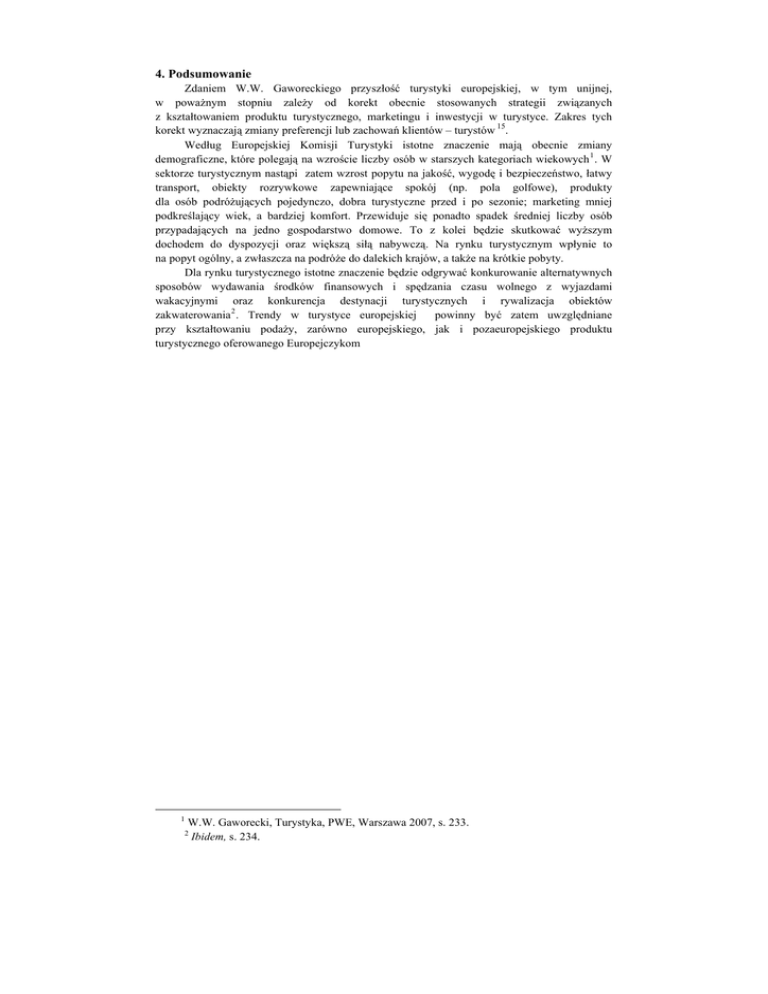 4. Podsumowanie Zdaniem W.W. Gaworeckiego przyszłość turystyki europejskiej, w tym unijnej, w poważnym stopniu zależy od korekt obecnie stosowanych strategii związanych z kształtowaniem produktu turystycznego, marketingu i inwestycji w turystyce. Zakres tych korekt wyznaczają zmiany preferencji lub zachowań klientów – turystów 15. Według Europejskiej Komisji Turystyki istotne znaczenie mają obecnie zmiany demograficzne, które polegają na wzroście liczby osób w starszych kategoriach wiekowych 1 . W sektorze turystycznym nastąpi zatem wzrost popytu na jakość, wygodę i bezpieczeństwo, łatwy transport, obiekty rozrywkowe zapewniające spokój (np. pola golfowe), produkty dla osób podróżujących pojedynczo, dobra turystyczne przed i po sezonie; marketing mniej podkreślający wiek, a bardziej komfort. Przewiduje się ponadto spadek średniej liczby osób przypadających na jedno gospodarstwo domowe. To z kolei będzie skutkować wyższym dochodem do dyspozycji oraz większą siłą nabywczą. Na rynku turystycznym wpłynie to na popyt ogólny, a zwłaszcza na podróże do dalekich krajów, a także na krótkie pobyty. Dla rynku turystycznego istotne znaczenie będzie odgrywać konkurowanie alternatywnych sposobów wydawania środków finansowych i spędzania czasu wolnego z wyjazdami wakacyjnymi oraz konkurencja destynacji turystycznych i rywalizacja obiektów zakwaterowania 2 . Trendy w turystyce europejskiej powinny być zatem uwzględniane przy kształtowaniu podaży, zarówno europejskiego, jak i pozaeuropejskiego produktu turystycznego oferowanego Europejczykom 1 W.W. Gaworecki, Turystyka, PWE, Warszawa 2007, s. 233. Ibidem, s. 234. 2