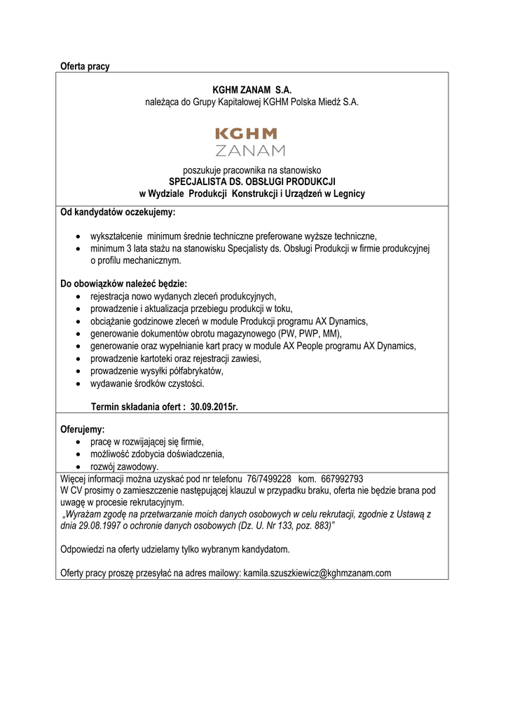 Oferta pracy KGHM ZANAM S.A. należąca do Grupy Kapitałowej KGHM Polska Miedź S.A. poszukuje pracownika na stanowisko SPECJALISTA DS. OBSŁUGI PRODUKCJI w Wydziale Produkcji Konstrukcji i Urządzeń w Legnicy Od kandydatów oczekujemy: wykształcenie minimum średnie techniczne preferowane wyższe techniczne, minimum 3 lata stażu na stanowisku Specjalisty ds. Obsługi Produkcji w firmie produkcyjnej o profilu mechanicznym. Do obowiązków należeć będzie: rejestracja nowo wydanych zleceń produkcyjnych, prowadzenie i aktualizacja przebiegu produkcji w toku, obciążanie godzinowe zleceń w module Produkcji programu AX Dynamics, generowanie dokumentów obrotu magazynowego (PW, PWP, MM), generowanie oraz wypełnianie kart pracy w module AX People programu AX Dynamics, prowadzenie kartoteki oraz rejestracji zawiesi, prowadzenie wysyłki półfabrykatów, wydawanie środków czystości. Termin składania ofert : 30.09.2015r. Oferujemy: pracę w rozwijającej się firmie, możliwość zdobycia doświadczenia, rozwój zawodowy. Więcej informacji można uzyskać pod nr telefonu 76/7499228 kom. 667992793 W CV prosimy o zamieszczenie następującej klauzul w przypadku braku, oferta nie będzie brana pod uwagę w procesie rekrutacyjnym. „Wyrażam zgodę na przetwarzanie moich danych osobowych w celu rekrutacji, zgodnie z Ustawą z dnia 29.08.1997 o ochronie danych osobowych (Dz. U. Nr 133, poz. 883)” Odpowiedzi na oferty udzielamy tylko wybranym kandydatom. Oferty pracy proszę przesyłać na adres mailowy: [email protected]