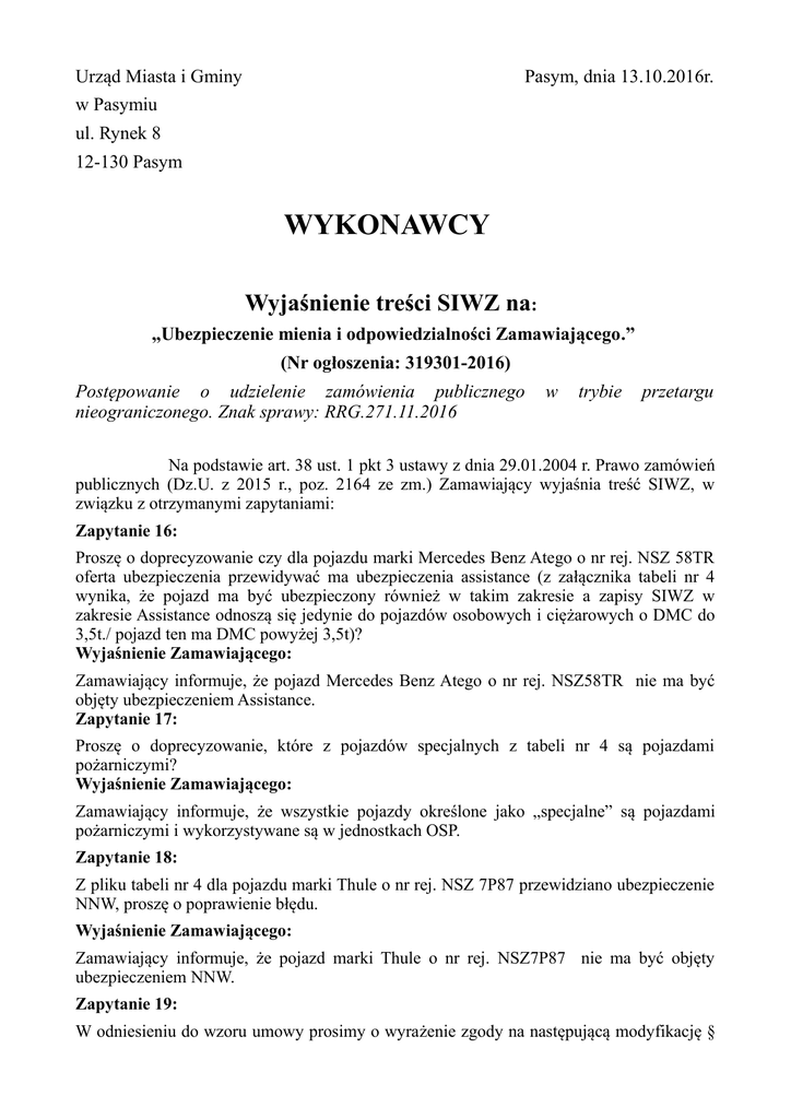 Urząd Miasta i Gminy Pasym, dnia 13.10.2016r. w Pasymiu ul. Rynek 8 12-130 Pasym WYKONAWCY Wyjaśnienie treści SIWZ na: „Ubezpieczenie mienia i odpowiedzialności Zamawiającego.” (Nr ogłoszenia: 319301-2016) Postępowanie o udzielenie zamówienia publicznego nieograniczonego. Znak sprawy: RRG.271.11.2016 w trybie przetargu Na podstawie art. 38 ust. 1 pkt 3 ustawy z dnia 29.01.2004 r. Prawo zamówień publicznych (Dz.U. z 2015 r., poz. 2164 ze zm.) Zamawiający wyjaśnia treść SIWZ, w związku z otrzymanymi zapytaniami: Zapytanie 16: Proszę o doprecyzowanie czy dla pojazdu marki Mercedes Benz Atego o nr rej. NSZ 58TR oferta ubezpieczenia przewidywać ma ubezpieczenia assistance (z załącznika tabeli nr 4 wynika, że pojazd ma być ubezpieczony również w takim zakresie a zapisy SIWZ w zakresie Assistance odnoszą się jedynie do pojazdów osobowych i ciężarowych o DMC do 3,5t./ pojazd ten ma DMC powyżej 3,5t)? Wyjaśnienie Zamawiającego: Zamawiający informuje, że pojazd Mercedes Benz Atego o nr rej. NSZ58TR nie ma być objęty ubezpieczeniem Assistance. Zapytanie 17: Proszę o doprecyzowanie, które z pojazdów specjalnych z tabeli nr 4 są pojazdami pożarniczymi? Wyjaśnienie Zamawiającego: Zamawiający informuje, że wszystkie pojazdy określone jako „specjalne” są pojazdami pożarniczymi i wykorzystywane są w jednostkach OSP. Zapytanie 18: Z pliku tabeli nr 4 dla pojazdu marki Thule o nr rej. NSZ 7P87 przewidziano ubezpieczenie NNW, proszę o poprawienie błędu. Wyjaśnienie Zamawiającego: Zamawiający informuje, że pojazd marki Thule o nr rej. NSZ7P87 nie ma być objęty ubezpieczeniem NNW. Zapytanie 19: W odniesieniu do wzoru umowy prosimy o wyrażenie zgody na następującą modyfikację § 13 pkt 3: „zmiany wysokości składki lub raty składki w ubezpieczeniu odpowiedzialności cywilnej i ubezpieczeniach na zawartych w systemie na pierwsze ryzyko w wyniku podwyższenia wysokości sumy gwarancyjnej i zmiany limitów odpowiedzialności po uprzedniej zgodzie Wykonawcy. Składka będzie rozliczana zgodnie z, określonymi w specyfikacji, zapisami klauzuli warunków i taryf” Wyjaśnienie Zamawiającego: Zamawiający wyraża zgodę na proponowany powyżej zapis. Zapytanie 20: W odniesieniu do części I Zamówienia- wzoru umowy prosimy o wyrażenie zgody na następującą modyfikację § 13 pkt 4: „zmiany wysokości składki w ubezpieczeniu mienia od ognia i innych zdarzeń losowych w przypadku zmiany sumy ubezpieczenia budynków i budowli – w przypadku zmiany rodzaju wartości budynku/budowli (np. z wartości księgowej brutto na wartość odtworzeniową) po uprzedniej zgodzie Wykonawcy. Składka będzie rozliczana zgodnie z, określonymi w specyfikacji, zapisami klauzuli warunków i taryf” Wyjaśnienie Zamawiającego: Zamawiający nie wyraża zgody na wprowadzenie proponowanej wyżej modyfikacji. Zapytanie 21: Czy na terenach, gdzie znajdują się lokalizacje Zamawiającego wystąpiły zdarzenia w postaci powodzi lub podtopień w okresie ostatnich 20 lat? Wyjaśnienie Zamawiającego: Pytanie zadane zostało już wcześniej – patrz Zapytanie nr 10 Zapytanie 22: Prosimy o wprowadzenie podlimitu odpowiedzialności dla szkód powstałych w wyniku rozszczelnienia pod wpływem działania mrozu (zamarzania wody) – proponujemy 100.000 zł na jedno i wszystkie zdarzenia w okresie ubezpieczenia lub inny akceptowalny dla Zamawiającego. Wyjaśnienie Zamawiającego: Zamawiający nie wyraża zgody na wprowadzenie limitu. Zapytanie 23: W odniesieniu do nieużytkowanej wieży ciśnień prosimy o informację czy budynek nadal spełnia swoją funkcję. Wyjaśnienie Zamawiającego: Nie. Funkcję wieży ciśnień przejęła stacja uzdatniania wody w Pasymiu. Zapytanie 24: W odniesieniu do budynku nieużytkowanego prosimy o ograniczenie zakresu ochrony do FLEXA. Wyjaśnienie Zamawiającego: Zamawiający nie wyraża zgody na zmianę zakresu ochrony czasowo nieużytkowanych budynków Zapytanie 25: Czy Zamawiający planuje w okresie trwania umowy ubezpieczenia wyłączyć z eksploatacji jakiekolwiek budynki/budowle? Jeśli tak, prosimy o wskazanie które i o jakiej wartości? Wyjaśnienie Zamawiającego: Zamawiający informuje, że na ten moment nie posiada wiedzy o wyłączeniu z eksploatacji budynków lub budowli w przyszłości. Jednak informuje również, że ze względu na specyfikę funkcjonowania samorządu terytorialnego nie może wykluczyć takiego działania. Zapytanie 26: Prosimy o potwierdzenie, że żaden ze zgłoszonych do ubezpieczenia budynków nie jest przeznaczony do rozbiórki. Wyjaśnienie Zamawiającego: Zamawiający potwierdza powyższe. Zapytanie 27: Prosimy o potwierdzenie, że wszystkie budynki zgłoszone do ubezpieczenia posiadają pozwolenie na użytkowanie stosownie do aktualnego przeznaczenia; w przeciwnym wypadku prosimy o wskazanie budynków nieposiadających takiego pozwolenia wraz z określeniem przyczyny . Wyjaśnienie Zamawiającego: Zamawiający potwierdza, że budynki wskazane w SIWZ posiadają stosowne pozwolenia na użytkowanie Zapytanie 28: Prosimy o potwierdzenie, że wszystkie budynki zgłoszone do ubezpieczenia i ich instalacje poddawane są regularnym przeglądom wynikającym z przepisów prawa, co potwierdzone jest każdorazowo pisemnym protokołami; w przeciwnym wypadku prosimy o wskazanie budynków niespełniających powyższego warunku wraz z określeniem przyczyny. Wyjaśnienie Zamawiającego: Zamawiający informuje, że wskazane w SIWZ budynki posiadają przeglądy zgodnie z przepisani ppoż. Zapytanie 29: Prosimy o potwierdzenie, że do ubezpieczenia od ognia i innych zdarzeń losowych Zamawiający nie zgłasza budowli w postaci mostów, tuneli, wiaduktów itp. Wyjaśnienie Zamawiającego: Pytanie zadawane zostało już wcześniej – patrz Zapytanie nr 5 Zapytanie 30: W odniesieniu do danych zamieszczonych w Załączniku nr 4 - Budynki, prosimy o informację czy w budynkach, których wiek przekracza 50 lat wykonan