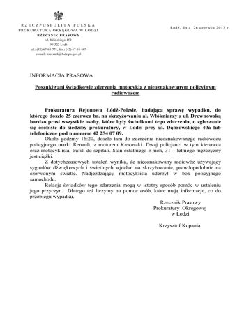 RZECZPOSPOLITA POLSKA PROKURATURA OKRĘGOWA W ŁODZI Łódź, dnia 26 czerwca 2013 r. RZE CZNIK P RASOWY ul. Kilińskiego 152 90-322 Łódź tel.: (42) 67-68-771, fax.: (42) 67-68-607 e-mail : [email protected] INFORMACJA PRASOWA Poszukiwani świadkowie zderzenia motocykla z nieoznakowanym policyjnym radiowozem Prokuratura Rejonowa Łódź-Polesie, badająca sprawę wypadku, do którego doszło 25 czerwca br. na skrzyżowaniu al. Włókniarzy z ul. Drewnowską bardzo prosi wszystkie osoby, które były świadkami tego zdarzenia, o zgłaszanie się osobiste do siedziby prokuratury, w Łodzi przy ul. Dąbrowskiego 40a lub telefoniczne pod numerem 42 254 07 09. Około godziny 16:20, doszło tam do zderzenia nieoznakowanego radiowozu policyjnego marki Renault, z motorem Kawasaki. Dwaj policjanci w tym kierowca oraz motocyklista, trafili do szpitali. Stan ostatniego z nich, 31 – letniego mężczyzny jest ciężki. Z dotychczasowych ustaleń wynika, że nieoznakowany radiowóz używający sygnałów dźwiękowych i świetlnych wjechał na skrzyżowanie, prawdopodobnie na czerwonym świetle. Nadjeżdżający motocyklista uderzył w bok policyjnego samochodu. Relacje świadków tego zdarzenia mogą w istotny sposób pomóc w ustaleniu jego przyczyn. Dlatego też liczymy na pomoc osób, które mają informacje, co do przebiegu wypadku. Rzecznik Prasowy Prokuratury Okręgowej w Łodzi Krzysztof Kopania