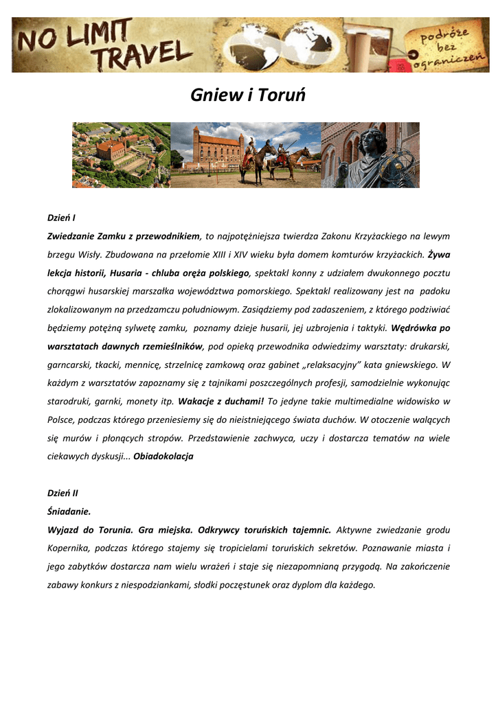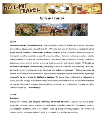 Gniew i Toruń Dzień I Zwiedzanie Zamku z przewodnikiem, to najpotężniejsza twierdza Zakonu Krzyżackiego na lewym brzegu Wisły. Zbudowana na przełomie XIII i XIV wieku była domem komturów krzyżackich. Żywa lekcja historii, Husaria - chluba oręża polskiego, spektakl konny z udziałem dwukonnego pocztu chorągwi husarskiej marszałka województwa pomorskiego. Spektakl realizowany jest na padoku zlokalizowanym na przedzamczu południowym. Zasiądziemy pod zadaszeniem, z którego podziwiać będziemy potężną sylwetę zamku, poznamy dzieje husarii, jej uzbrojenia i taktyki. Wędrówka po warsztatach dawnych rzemieślników, pod opieką przewodnika odwiedzimy warsztaty: drukarski, garncarski, tkacki, mennicę, strzelnicę zamkową oraz gabinet „relaksacyjny” kata gniewskiego. W każdym z warsztatów zapoznamy się z tajnikami poszczególnych profesji, samodzielnie wykonując starodruki, garnki, monety itp. Wakacje z duchami! To jedyne takie multimedialne widowisko w Polsce, podczas którego przeniesiemy się do nieistniejącego świata duchów. W otoczenie walących się murów i płonących stropów. Przedstawienie zachwyca, uczy i dostarcza tematów na wiele ciekawych dyskusji... Obiadokolacja Dzień II Śniadanie. Wyjazd do Torunia. Gra miejska. Odkrywcy toruńskich tajemnic. Aktywne zwiedzanie grodu Kopernika, podczas którego stajemy się tropicielami toruńskich sekretów. Poznawanie miasta i jego zabytków dostarcza nam wielu wrażeń i staje się niezapomnianą przygodą. Na zakończenie zabawy konkurs z niespodziankami, słodki poczęstunek oraz dyplom dla każdego. Planetarium – np. seans „Wirująca Ziemia”. Podstawowe informacje związane z ruchem wirowym oraz obiegowym Ziemi: zjawisko dnia i nocy oraz następstwo pór roku. W przystępny sposób tłumaczymy, jak zmienia się wygląd nieba i układ gwiazdozbiorów w ciągu roku, jaką rolę pełni Gwiazda Polarna oraz skąd biorą się fazy Księżyca. Sprawdzamy, jak długo trwa doba oraz rok na innych planetach, prezentując wybrane różnice między Ziemią a innymi planetami Układu Słonecznego. Warsztaty z pieczenia piernika. Uczestniczymy w procesie powstawania pierników z których wyrobu od wieków słynie Toruń. Termin do uzgodnienia Cena dla grupy 44 uczniów + 4 opiekunów: 250zł Cena dla grupy 40 uczniów + 4 opiekunów: 265zł Cena zawiera: transport, nocleg, wyżywienie, opiekę licencjonowanego pilota, wszystkie wstępy, usługi miejscowego przewodnika, ubezpieczenie NNW, Biuro Podróży No Limit Travel & Marideo s.c. ul. Czerska 8, 86-005 Białe Błota, tel. 509 684 222, [email protected], w w w . n o l i m i t - t r a v e l . p l Jedna podróż – setki wspomnień!