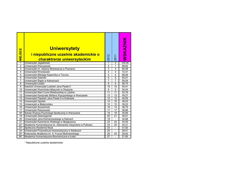 2012 2011 WSKAŹNIK MIEJSCE 1 2 3 4 5 6 7 8 9 10 11 12 13 14 15 16 17 18* 19 20 21 22* 23* 24 25* 26* 1 2 3 4 5 6 7 8 10 9 11 13 12 14 15 16 17 18 20 19 22 24 23 25 26 27 2 1 3 4 5 8 7 6 10 9 11 13 12 16 15 14 17 19 21 22 20 25 - 100,00 99,92 80,08 72,31 66,06 63,01 59,29 58,74 54,41 54,24 53,76 49,27 46,59 39,25 39,22 38,75 36,86 35,66 35,01 34,68 34,50 34,31 31,92 29,51 26,82 21,95 Uniwersytety i niepubliczne uczelnie akademickie o charaktrerze uniwersyteckim Uniwersytet Jagielloński Uniwersytet Warszawski Uniwersytet im. Adama Mickiewicza w Poznaniu Uniwersytet Wrocławski Uniwersytet Mikołaja Kopernika w Toruniu Uniwersytet Gdański Uniwersytet Śląski w Katowicach Uniwersytet Łódzki Katolicki Uniwersytet Lubelski Jana Pawła II Uniwersytet Warmińsko-Mazurski w Olsztynie Uniwersytet Marii Curie-Skłodowskiej w Lublinie Uniwersytet Kardynała Stefana Wyszyńskiego w Warszawie Uniwersytet Papieski Jana Pawła II w Krakowie Uniwersytet Opolski Uniwersytet w Białymstoku Uniwersytet Szczeciński Uniwersytet Rzeszowski Szkoła Wyższa Psychologii Społecznej w Warszawie Uniwersytet Zielonogórski Uniwersytet Jana Kochanowskiego w Kielcach Uniwersytet Kazimierza Wielkiego w Bydgoszczy Akademia Humanistyczna im. Aleksandra Gieysztora w Pułtusku Społeczna Akademia Nauk Uniwersytet Przyrodniczo-Humanistyczny w Siedlcach Krakowska Akademia im. A. Frycza Modrzewskiego Akademia Humanistyczno-Ekonomiczna w Łodzi * Niepubliczne uczelnie akademickie * Niepubliczna uczelnia akademickia 2011 WSKAŹNIK Uczelnie techniczne Politechnika Warszawska Akademia Górniczo-Hutnicza im. Stanisława Staszica w Krakowie Politechnika Wrocławska Politechnika Łódzka Politechnika Śląska w Gliwicach Politechnika Poznańska Politechnika Gdańska Wojskowa Akademia Techniczna im. Jarosława Dąbrowskiego w Warszawie Politechnika Krakowska im. Tadeusza Kościuszki Zachodniopomorski Uniwersytet Technologiczny w Szczecinie Polsko-Japońska Wyższa Szkoła Technik Komputerowych w Warszawie Politechnika Częstochowska Politechnika Opolska Politechnika Rzeszowska im. Ignacego Łukasiewicza Politechnika Lubelska Politechnika Białostocka Uniwersytet Technologiczno-Przyrodniczy im. J. i J. Śniadeckich w Bydgoszczy Politechnika Świętokrzyska w Kielcach Politechnika Koszalińska Uniwersytet Technologiczno-Humanistyczny im. Kazimierza Pułaskiego w Radomiu (d. PR) Akademia Techniczno-Humanistyczna w Bielsku-Białej Akademia Morska w Szczecinie Akademia Morska w Gdyni 2012 MIEJSCE 1 2 3 4 5 6 7 8 9 10 11* 12 13 14 15 16 17 18 19 20 21 22 23 1 3 2 4 5 7 6 8 10 9 11 12 13 15 16 14 18 17 19 21 20 23 22 1 3 2 4 6 7 5 8 10 9 12 11 13 18 15 17 16 14 19 20 22 23 21 100,00 94,18 92,85 80,75 75,87 74,38 71,89 61,85 56,19 54,37 53,49 53,23 49,91 48,84 47,63 46,44 46,23 44,57 41,27 35,89 34,22 33,57 32,35 2011 WSKAŹNIK Uczelnie pedagogiczne Uniwersytet Pedagogiczny im. Komisji Edukacji Narodowej w Krakowie Akademia im. Jana Długosza w Częstochowie Akademia Pedagogiki Specjalnej im. Marii Grzegorzewskiej w Warszawie Akademia Pomorska w Słupsku Dolnośląska Szkoła Wyższa we Wrocławiu Akademia Ignatianum w Krakowie 2012 MIEJSCE 1 2 3 4 5 6 1 3 2 5 4 6 1 4 6 5 9 7 100,00 74,80 71,28 71,23 63,41 56,48 2011 WSKAŹNIK Uczelnie rolnicze Szkoła Główna Gospodarstwa Wiejskiego w Warszawie Uniwersytet Przyrodniczy we Wrocławiu Uniwersytet Przyrodniczy w Poznaniu Uniwersytet Rolniczy im. Hugona Kołłątaja w Krakowie 2012 MIEJSCE 1 2 3 4 1 2 4 3 1 2 3 4 100,00 88,66 88,46 85,35 * Niepubliczna uczelnia akademickia 2011 WSKAŹNIK Uczelnie ekonomiczne Szkoła Główna Handlowa w Warszawie Akademia Leona Koźmińskiego w Warszawie Uniwersytet Ekonomiczny w Poznaniu Uniwersytet Ekonomiczny we Wrocławiu Uniwersytet Ekonomiczny w Krakowie Uniwersytet Ekonomiczny w Katowicach 2012 MIEJSCE 1 2* 3 4 5 6 2 1 3 4 5 6 1 2 3 4 5 6 100,00 92,27 89,57 72,61 65,31 65,05 2011 WSKAŹNIK Akademie wychowania fizycznego Akademia Wychowania Fizycznego we Wrocławiu Akademia Wychowania Fizycznego im. Bronisława Czecha w Krakowie Akademia Wychowania Fizycznego Józefa Piłsudskiego w Warszawie Akademia Wychowania Fizycznego im. Eugeniusza Piaseckiego w Poznaniu Akademia Wychowania Fizycznego i Sportu im. Jędrzeja Śniadeckiego w Gdańsku 2012 MIEJSCE 1 2 3 4 5 1 2 3 4 5 3 1 2 4 5 100,00 97,33 93,61 84,36 67,47 2011 WSKAŹNIK Uczelnie medyczne Collegium Medicum Uniwersytetu Jagiellońskiego Uniwersytet Medyczny im. Karola Marcinkowskiego w Poznaniu Warszawski Uniwersytet Medyczny Gdański Uniwersytet Medyczny Uniwersytet Medyczny w Łodzi Uniwersytet Medyczny im. Piastów Śląskich we Wrocławiu Uniwersytet Medyczny w Białymstoku Śląski Uniwersytet Medyczny w Katowicach Uniwersytet Medyczny w Lublinie Pomorski Uniwersytet Medyczny w Szczecinie Collegium Medicum UMK im. Ludwika Rydygiera w Bydgoszczy 2012 MIEJSCE 1 2 3 4 5 6 7 8 9 10 11 1 2 4 6 3 7 5 8 9 10 11 3 1 4 5 7 10 2 9 6 8 11 100,00 94,95 91,16 91,01 85,48 85,21 83,46 79,85 79,31 72,17 61,62 Uwaga: Collegium Medicum UJ oraz Collegium Medicum UMK nie występują osobno w tabli głównej uczelni akademickich, ponieważ zostały potraktowane jako integralne części tych uczelni.