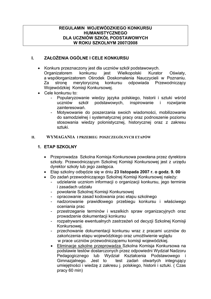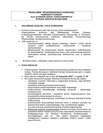 REGULAMIN WOJEWÓDZKIEGO KONKURSU HUMANISTYCZNEGO DLA UCZNIÓW SZKÓŁ PODSTAWOWYCH W ROKU SZKOLNYM 2007/2008 I. ZAŁOŻENIA OGÓLNE I CELE KONKURSU • Konkurs przeznaczony jest dla uczniów szkół podstawowych. Organizatorem konkursu jest Wielkopolski Kurator Oświaty, a współorganizatorem Ośrodek Doskomalenia Nauczycieli w Poznaniu. Za stronę merytoryczną konkursu odpowiada Przewodniczący Wojewódzkiej Komisji Konkursowej. • Cele konkursu to: - Popularyzowanie wiedzy języka polskiego, historii i sztuki wśród uczniów szkół podstawowych, inspirowanie i rozwijanie zainteresowań. - Motywowanie do poszerzania swoich wiadomości, mobilizowanie do samodzielnej i systematycznej pracy oraz podnoszenie poziomu stosowania wiedzy polonistycznej, historycznej oraz z zakresu sztuki. WYMAGANIA I PRZEBIEG POSZCZEGÓLNYCH ETAPÓW II. 1. ETAP SZKOLNY • • • Przeprowadza Szkolna Komisja Konkursowa powołana przez dyrektora szkoły. Przewodniczącym Szkolnej Komisji Konkursowej jest z urzędu dyrektor szkoły lub jego zastępca. Etap szkolny odbędzie się w dniu 23 listopada 2007 r. o godz. 9. 00 Do zadań przewodniczącego Szkolnej Komisji Konkursowej należy: - udzielanie uczniom informacji o organizacji konkursu, jego terminie i zasadach udziału - powołanie Szkolnej Komisji Konkursowej - opracowanie zasad kodowania prac etapu szkolnego - nadzorowanie prawidłowego przebiegu konkursu i właściwego oceniania prac - przestrzeganie terminów i wszelkich spraw organizacyjnych oraz prowadzenie dokumentacji konkursu - rozpatrywanie ewentualnych zastrzeżeń od decyzji Szkolnej Komisji Konkursowej. - przechowanie dokumentacji konkursu wraz z pracami uczniów do zakończenia etapu wojewódzkiego oraz umożliwienie wglądu w prace uczniów przewodniczącemu komisji wojewódzkiej. • Eliminacje szkolne przeprowadza Szkolna Komisja Konkursowa na podstawie testów dostarczonych przez odpowiedni Wydział Nadzoru Pedagogicznego lub Wydział Kształcenia Podstawowego i Gimnazjalnego. Jest to test zadań otwartych integrujący umiejętności i wiedzę z zakresu j. polskiego, historii i sztuki. ( Czas pracy 60 min) • Każda praca powinna być sprawdzona, oceniona i podpisana przez członka komisji sprawdzającego daną pracę. • Do etapu rejonowego kwalifikuje się uczestnik, który otrzyma minimum 85 procent ogólnej liczby punktów możliwych do uzyskania w etapie szkolnym. • Protokół z eliminacji szkolnych (na załączonym wzorze protokołu stanowiącym załącznik nr 2 do Zarządzenia nr 66/07 z dnia 24 września 2007r. Wielkopolskiego Kuratora Oświaty w sprawie organizacji konkursów interdyscyplinarnych, przedmiotowych i tematycznych w szkołach podstawowych i gimnazjach w roku szkolnym 2007/2008), ostemplowany pieczęcią szkoły, podpisany przez dyrektora szkoły i członków Komisji Szkolnej szkoły przesyłają do 5 grudnia 2007 r. na adres właściwych wydziałów nadzoru pedagogicznego: - Wydział Nadzoru Pedagogicznego w Kaliszu; 62-800 Kalisz, ul. Kordeckiego 19 - Wydział Nadzoru Pedagogicznego w Koninie; 62-510 Konin, ul. Sosnowa 10 - Wydział Nadzoru Pedagogicznego w Lesznie; 64-100 Leszno, Pl. Kościuszki 4 - Wydział Nadzoru Pedagogicznego w Pile; 64-920 Piła, Al. Niepodległości 33 - Wydział Kształcenia Podstawowego i Gimnazjalnego Kuratorium Oświaty w Poznaniu, ul. Kościuszki 93, 61-716 Poznań W protokole z przebiegu eliminacji szkolnych należy zamieścić wykaz uczestników, którzy zakwalifikowali się do konkursu na szczeblu rejonu, wraz z danymi osobowymi nauczycieli ich przygotowujących. Wykaz ten powinien zawierać imię, nazwisko, klasę, datę i miejsce urodzenia uczestników (dane niezbędne do wypełnienia zaświadczenia laureata). Protokoły należy wypełnić pismem komputerowym lub maszynowym. 2. ETAP REJONOWY • • Etap rejonowy odbędzie się w dniu: 12 stycznia 2007 r. o godz. 1000 w szkołach wyznaczonych przez Dyrektorów Wydziałów Nadzoru Pedagogicznego w Kaliszu, Koninie, Lesznie i Pile oraz przez Dyrektora Wydziału Kształcenia Ogólnego i Specjalnego Kuratorium Oświaty w Poznaniu. Za organizację i przeprowadzenie etapu rejonowego odpowiadają Rejonowe Komisje Konkursowe powołane przez Dyrektorów Wydziałów Nadzoru Pedagogicznego w Kaliszu, Koninie, Lesznie i Pile oraz przez Dyrektora Wydziału Kształcenia Ogólnego i Specjalnego Kuratorium Oświaty w Poznaniu. Do zadań przewodniczącego Rejonowej Komisji Konkursowej należy: - nadzorowanie prawidłowego przebiegu konkursu i właściwego oceniania prac - opracowanie zasad kodowania prac - • • • przestrzeganie terminów i wszelkich spraw organizacyjnych oraz prowadzenie dokumentacji konkursu - rozpatrywanie ewentualnych odwołań od decyzji Rejonowej Komisji Konkursowej - przechowanie dokumentacji konkursu wraz z pracami uczniów do zakończenia etapu wojewódzkiego oraz umożliwienie wglądu w prace przewodniczącej komisji wojewódzkiej. - w przypadku zakwalifikowania do finału przesłanie prac uczniów wraz z protokołem do Kuratorium Oświaty w Poznaniu. • Na etapie rejonowym uczeń pisze wypracowanie z wykorzystaniem lektury konkursowej ( Czas pracy 60 min) • Każda praca powinna być sprawdzona, oceniona i podpisana przez członka komisji sprawdzającego daną pracę. Do finału wojewódzkiego kwalifikują się uczestnicy, którzy uzyskają minimum 90% możliwych do uzyskania punktów. Protokół komisji z przebiegu eliminacji rejonowych uwzględnienia liczbę uczestników, wykaz szkół przygotowujących uczniów do konkursu rejonowego, wykaz uczestników, którzy zakwalifikowali się do finału wraz z danymi osobowymi nauczycieli ich przygotowujących. Wykaz ten powinien zawierać imię nazwisko, klasę, datę i miejsce urodzenia uczestnika( dane niezbędne do wypełnienia zaświadczenia laureata ) oraz nazwisko opiekuna. Protokoły Rejonowe Komisje Konkursowe przesyłają do 21 stycznia 2008 r. na adres: - Ośrodek Doskonalenia Nauczycieli al. Niepodleg