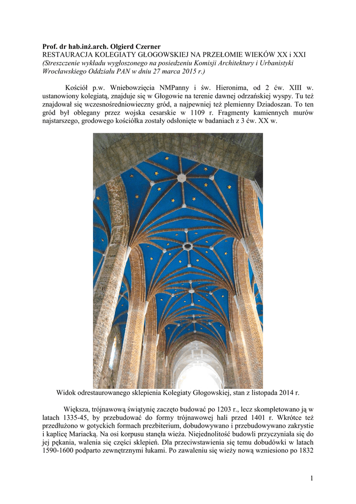 Prof. dr hab.inż.arch. Olgierd Czerner RESTAURACJA KOLEGIATY GŁOGOWSKIEJ NA PRZEŁOMIE WIEKÓW XX i XXI (Streszczenie wykładu wygłoszonego na posiedzeniu Komisji Architektury i Urbanistyki Wrocławskiego Oddziału PAN w dniu 27 marca 2015 r.) Kościół p.w. Wniebowzięcia NMPanny i św. Hieronima, od 2 ćw. XIII w. ustanowiony kolegiatą, znajduje się w Głogowie na terenie dawnej odrzańskiej wyspy. Tu też znajdował się wczesnośredniowieczny gród, a najpewniej też plemienny Dziadoszan. To ten gród był oblegany przez wojska cesarskie w 1109 r. Fragmenty kamiennych murów najstarszego, grodowego kościółka zostały odsłonięte w badaniach z 3 ćw. XX w. Widok odrestaurowanego sklepienia Kolegiaty Głogowskiej, stan z listopada 2014 r. Większa, trójnawową świątynię zaczęto budować po 1203 r., lecz skompletowano ją w latach 1335-45, by przebudować do formy trójnawowej hali przed 1401 r. Wkrótce też przedłużono w gotyckich formach prezbiterium, dobudowywano i przebudowywano zakrystie i kaplicę Mariacką. Na osi korpusu stanęła wieża. Niejednolitość budowli przyczyniała się do jej pękania, walenia się części sklepień. Dla przeciwstawienia się temu dobudówki w latach 1590-1600 podparto zewnętrznymi łukami. Po zawaleniu się wieży nową wzniesiono po 1832 1 r. odsuwając ją nieco na zachód. We wnętrzu wprowadzono wiele elementów barokowego wyposażenia (ambonę, nastawy ołtarzowe, stalle, konfesjonały, a także naścienne malowidła pędzla J.Kretchmera). Nowożytne fortyfikacje otoczyły nie tylko miasto ale także kolegiatę na wyspie Tumskiej. Głogów stał się mocną twierdzą i pozostawał nią do 1945 r. Konieczność jej zdobycia przez wojska sowieckie spowodowała wielkie zniszczenia, które również dotknęły kolegiatę. Spłonęły dachy, runęły wszystkie sklepienia, częściowo mury kapitalne, przede wszystkim wieloboku prezbiterium, a także większość filarów międzynawowych. Zostały zniszczone kamienne maswerki okienne. Spłonęło drewniane wyposażenie wnętrza. Ruiny kolegiaty znalazły się na części Głogowa słabo zaludnionej, a wobec tego poza zainteresowaniami Kościoła. Konieczność opieki nad nimi przejęły władze konserwatorskie zamierzając utrwalić je jako „trwałą ruinę”. Różni uczeni (archeolodzy, architekci, historycy sztuki) podjęli badania kościoła, wykonano inwentaryzację murów i ostatecznie Pracownie Konserwacji Zabytków ze Szczecina podjęły prace zabezpieczające. Wobec niedostatecznego rozeznania murów w trakcie tych prac popełniono sporo błędów, a nawet częściowo powiększono zniszczenia. Konstrukcją stalową starano się utrwalić dwa zachowane filary międzynawowe i łączące je wielki łęki. Wprowadzono balkon widokowy na północny mur prezbiterium. Uzupełniono na wysokość ok. 4 m mury wieloboku apsydy. W 1987 r. przyjąłem obowiązki głównego konserwatora kolegiaty na prośbę przedstawiciela Kurii Biskupiej Zielonogórsko-Gorzowskiej X Ryszarda Dobrołowicza. Kuria uzyskała prawo własności do kolegiaty. Skompletowałem zespół inwentaryzujący, pomiarowy i projektowy. Zaczęliśmy sprawdzać uzyskaną wcześniejszą inwentaryzację, uzupełniać ją, częściowo fotogrametrycznie. Wykonano wykopy dla sprawdzenia fundamentowania, konstruktorzy wykonali ocenę stanu konstrukcyjnego murów. P. Lech Engel przygotował dokumentację ich skotwienia. Wobec trudności w dostępie do dokumentacji wykonanych wcześniej badań murów najstarszego kościółka musieliśmy je ponownie odsłonić. Teraz sami przebadaliśmy wszystkie mury pod kątem okresów ich powstawania. Mogliśmy się pokusić na zrobienie dokumentacji opisowej i rysunkowej przemian budowli. To pozwoliło, po dyskusjach w inwestorem, przygotować wstępny projekt konserwatorsko-budowlany restauracji kolegiaty. Został on w dniach 21.lipca i 4 sierpnia 1989 r. rozpatrzony i zaakceptowany przez Główną Komisję Konserwatorską w Ministerstwie Kultury i Sztuki i generalnie zaakceptowany. Projektowi towarzyszyło obszerne studium historyczno-konserwatorskie. Nad kolegiatą górowała od zachodu bardzo nadwątlona ostrzałem artyleryjskim wieża. Groziła upadkiem i mimo, że do celów kultowych jej odbudowa nie była pilnie potrzebna, to jednak od tego trzeba było zacząć. Równolegle kotwiono stalowymi ściągami mury całej budowli w latach 1994-95. W części korpusu zaproponowaliśmy zbudowanie krypty dla ochrony i pokazu murów najstarszego kościółka. Już założone szalowania pod żelbetowy strop wymyły wody Odry w czasie powodzi 1997 r. Dopiero po ich opadnięciu można było ten strop wykonać. Równolegle wykonywano fundamenty pod nowe, częściowo żelbetowe filary międzynawowe, co jednak zostało poprzedzone skomplikowanymi pracami przy uratowaniu i wyprostowaniu dwóch zachowanych filarów zachodnich rzędu północnego. Przeprowadził to bardzo delikatnie, lecz skutecznie zespół p. Leszka Linka, architekta. Żelbetowe jądra nowych filarów wraz z rusztem miały przenieść stalową więźbę dachową. Zaczęto ją stawiać w konstrukcji stalowej od wschodniej strony prezbiterium od X.1998 r. i trwało jeszcze w 2000 r. Więźbą stalową nakryto także dwie przybudówki, północną mieszczącą Kaplicę Mariacką i archiwum i południową, mieszczącą zakrystie i (być może) bibliotekę. Trzeba też przypomnieć, że sukcesywnie od 2000 r. uzupełniano kamienne maswerki we wszystkich oknach. Dachy kolegiaty zostały pokryte blachą miedzianą. 2 Pierwszy wiek następnego stulecia to lata rekonstrukcji sklepień. Wykonywano je, na żądanie władz konserwatorskich, metodą tradycyjną, poprzez murowanie. Zaczęto od sklepień z prezbiterium, gdzie jest to pseudo renesansowa kolebka pokryta sztukateriami o renesansowej ornamentyce. Oczekują one jeszcze na pomalowanie. W halowym korpusie wykonano sklepienia o formach gotyckich, krzyżowe i gwiaździste z ceglanymi 