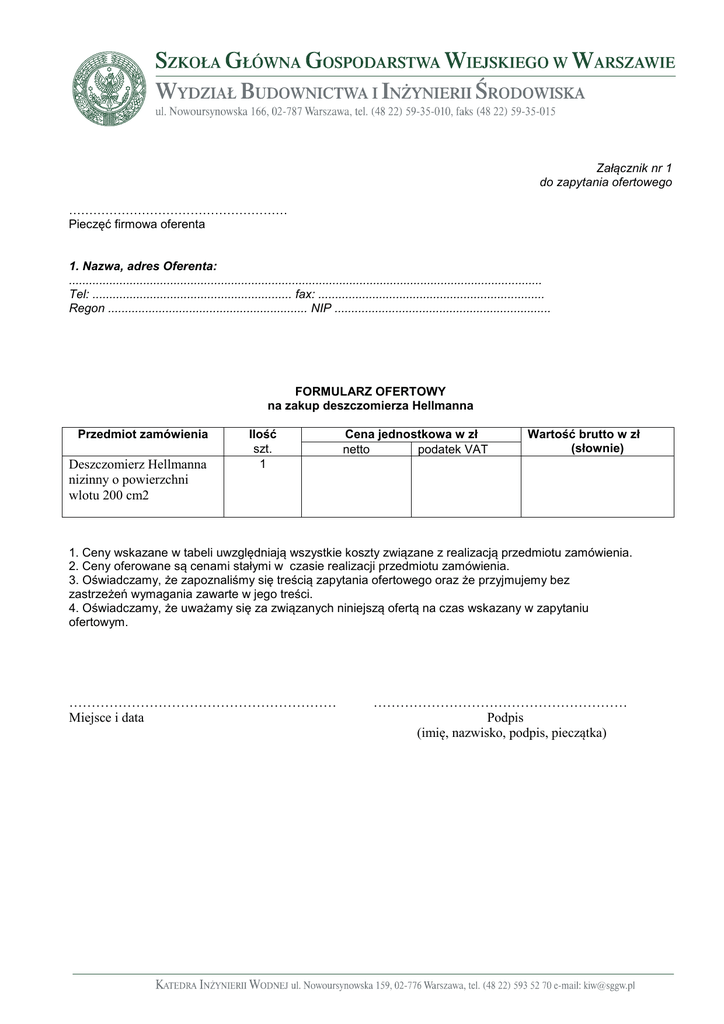 Załącznik nr 1 do zapytania ofertowego ……………………………………………… Pieczęć firmowa oferenta 1. Nazwa, adres Oferenta: ............................................................................................................................................ Tel: ........................................................... fax: ................................................................... Regon ........................................................... NIP ................................................................ FORMULARZ OFERTOWY na zakup deszczomierza Hellmanna Przedmiot zamówienia Deszczomierz Hellmanna nizinny o powierzchni wlotu 200 cm2 Ilość szt. 1 Cena jednostkowa w zł netto podatek VAT Wartość brutto w zł (słownie) 1. Ceny wskazane w tabeli uwzględniają wszystkie koszty związane z realizacją przedmiotu zamówienia. 2. Ceny oferowane są cenami stałymi w czasie realizacji przedmiotu zamówienia. 3. Oświadczamy, że zapoznaliśmy się treścią zapytania ofertowego oraz że przyjmujemy bez zastrzeżeń wymagania zawarte w jego treści. 4. Oświadczamy, że uważamy się za związanych niniejszą ofertą na czas wskazany w zapytaniu ofertowym. …………………………………………………… Miejsce i data ………………………………………………… Podpis (imię, nazwisko, podpis, pieczątka)