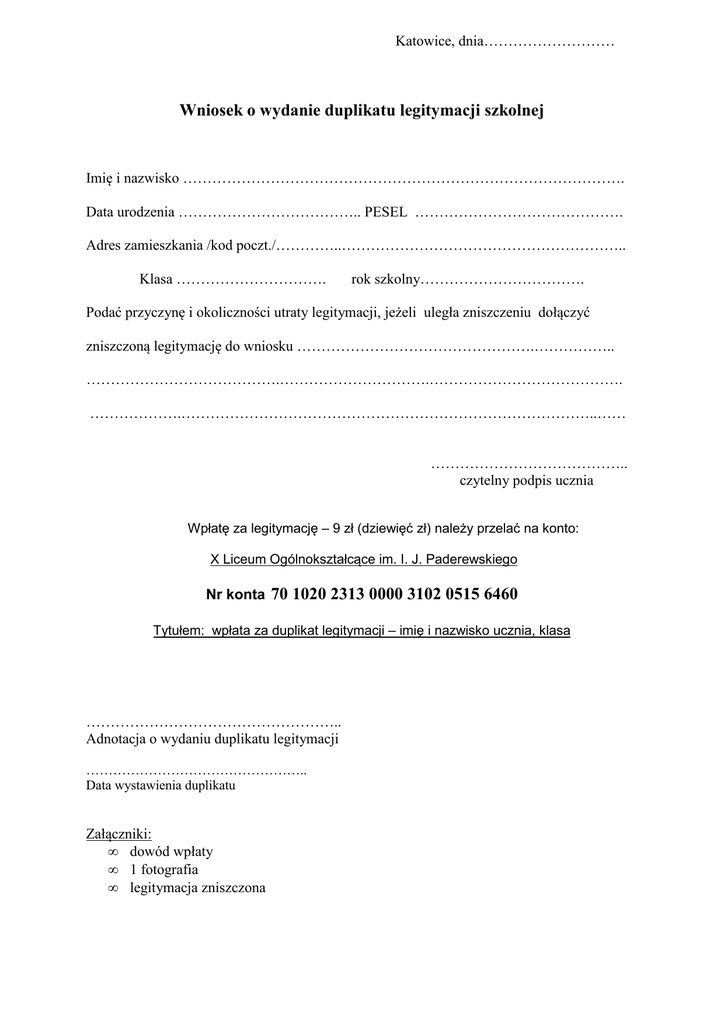 Wniosek o wydanie duplikatu legitymacji szkolnej Nr konta 70 1020
