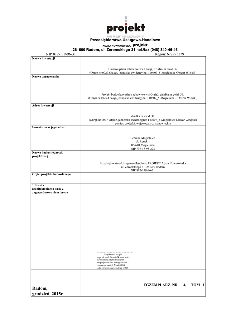 Przedsiębiorstwo Usługowo-Handlowe AGATA NOWAKOWSKA projekt 26–600 Radom, ul. Żeromskiego 31 tel./fax (048) 340-46-46 NIP 812-119-96-31 Regon: 672975379 Nazwa inwestycji Budowa placu zabaw we wsi Otaląż, działka nr ewid. 39 (Obręb nr 0027 Otaląż, jednostka ewidencyjna: 140607_5-Mogielnica-Obszar Wiejski) Nazwa opracowania Projekt budowlany placu zabaw we wsi Otaląż, działka nr ewid. 39, (Obręb nr 0027-Otaląż, jednostka ewidencyjna: 140607_5-Mogielnica – Obszar Wiejski) Adres inwestycji działka nr ewid. 39 (Obręb nr 0027-Otaląż, jednostka ewidencyjna: 140607_5-Mogielnica-Obszar Wiwjski) powiat: grójecki, województwo: mazowieckie Inwestor oraz jego adres Gminna Mogielnica ul. Rynek 1 05-640 Mogielnica NIP 797-18-93-228 Nazwa i adres jednostki projektowej Przedsiębiorstwo Usługowo-Handlowe PROJEKT Agata Nowakowska ul. Żeromskiego 31, 26-600 Radom NIP 812-119-96-31 Części projektu budowlanego: 1.Branża architektoniczna wraz z zagospodarowaniem terenu …………………….……….………… Projektant - podpis: mgr inż. arch. Marcin Nowakowski Specjalność: architektoniczna do projektowania bez ograniczeń Numer uprawnień: MA/053/04 Data opracowania: grudzień 2015 Radom, grudzień 2015r EGZEMPLARZ NR 4, TOM I SPIS ZAWARTOŚCI OPRACOWANIA: Numer kart: ZAŁĄCZNIKI: - Strona tytułowa................................................................................................1 - Spis zawartości opracowania.......................................................................... 2 - Dokumenty potwierdzające posiadane przez projektanta uprawnieni do projektowania wraz z aktualnym zaświadczeniem o przynależności do właściwej izby………………………………..…...........od 3 – do 4 - mapa do celów projektowych ……………..………………...…………...….5 CZĘŚĆ OPISOWA …………………………………………….....….......…od 6 – do 11 Opis techniczny do projektowanego placu zabaw …………………................od 6 – do 11 CZĘŚĆ RYSUNKOWA …………………………………………….....… od 13 – do 17 Rys. nr 1 Rys. nr 2 Rys. nr 3 Rys. nr 4 Rys. nr 5 Orientacja Projekt zagospodarowania terenu Zagospodarowanie placu zabaw Ogrodzenie przęsło typowe Ogrodzenie furtka 1:10000 1:500 1:100 1:25 1:25 12 13 14 15 16 INFORMACJA BIOZ …………………………………………………....…od 17 – do 26 2 OPIS TECHNICZNY DO PROJEKTU PLACU ZABAW. 1. Opis ogólny i dane charakterystyczne Działka położona jest we wsi Otaląż, działka nr ewid. 39 (Obręb nr 0027-Otaląż), jednostka ewidencyjna: 140607_5-Mogielnica-Obszar Wiejski), powiat: grójecki, województwo: mazowieckie 2. Plac zabaw- lokalizacja Plac zabaw zlokalizowany od strony południowej za istniejącymi budynkami należącymi do OSP . Dojazd do placu za pomocą istniejącego zjazdu z drogi (działka ewid. nr 29). Projektuje się utwardzone dojście w postaci chodnika o szerokości 1,5m wykonanego z kostki betonowej gr.6cm na podbudowie z piasku stabilizowanego cementem. Teren placu zabaw wydzielono za pomocą ogrodzenia o wysokości 150cm. Ziemia powstała przy fundamentowaniu urządzeń będzie rozplantowana na działce inwestora. Wejście na plac zabaw poprzez furtkę od strony północnej. 3 . Posadzkę placu stanowi piasek jako nawierzchnie amortyzujące Strefy bezpieczeństwa wokół urządzeń placów zabaw opisane są w Polskiej Normie PN-EN 1176-1:2009 pkt. 4.2.8.2. W powyższej normie w pkt. 4.2.8.2.5 przyjęta jest zasada ogólna „Jeżeli nie ustalono inaczej, przestrzeń upadu powinna rozciągać się co najmniej 1,5m wokół podwyższonych części urządzenia, mierzona poziomo i rozciągająca się do płaszczyzny występu pionowego poniżej urządzenia”. Projektuje się nawierzchnię amortyzującą z piasku płukanego o grubości minimum 200mm wokół urządzeń w ich strefach funkcjonowania zgodnie z oznaczeniem na projekcie zagospodarowania terenu. Pozostała powierzchnia placu zabaw pokryta będzie trawnikiem. 4. Plac zabaw wyposażony w następujące urządzenia: Zestaw zabawowy dla dzieci młodszych z dwiema zjeżdżalniami. – 1 szt Centrum zabaw dla dzieci z dwiema zjeżdżalniami. Wymiary: 6830x5420x3780mm Strefa bezpieczeństwa: 60 m2. Wiek użytkownika: powyżej 1-go roku. Max. wys. swobodnego upadku: 2200 mm. Konstrukcje nośne - słupy drewniane 95x95 mm, profil kwadratowy, zakończone od góry tworzywowymi kołpakami. Elementy skręcane zabezpieczone kołpakami. Elementy metalowe cynkowane i malowane proszkowo. Zjeżdżalnie - stal nierdzewna z jednego elementu gr. 2 mm. Burty zjeżdżalni stalowych z giętego drewna klejonego warstwowo, bez szczelin drewno-stal. Liny - plecionka stalowa zabezpieczona i pokryta plecionką perlonową. Całość montowana na stalowych wspornikach wys. 700 mm i średnicy 60 mm, wsporniki montowane na stalowych 'łapach' 380x380 mm - uwaga - elementy słupów drewnianych nośnych łączone z ze słupami metalowymi, za pomocą 4 śrub w płaszczyźnie pionowej. i 'łapy' stalowe przystosowane do betonowania w gruncie (min.20cm). Elementy wykonane z materiałów nadających się do ponownego przetworzenia. 3 Huśtawka na sprężynie – 1 szt Element ozdobny wykonany ze sklejki - korpusy wykonane z kantówki klejonej pięciowarstwowo. - uchwyty na ręce, podnóżki wykonane z plastiku. - sprężyna wykonana ze stali. Wymiary urządzenia: 0,5 x 0,7 x 0,4 m Długość prostokąta opisującej rzut z góry przestrzeni minimalnej : 3,8 x 3,2 m Piaskownica sześciokątna – 1 szt Piaskownica z palisady wykonana z drewna toczonego cylindrycznie. Impregnowana metodą ciśnieniowo – próżniową Wymiary urządzenia: 0,22 x 3,5 x 4 m Długość prostokąta opisującej rzut z góry przestrzeni minimalnej : 8,00 x 8,00 m 4 Huśtawka łańcuchowa , podwójna – 1 szt Huśtawka o wymiarach: 3770x1530x2300mm Strefa bezpieczeństwa: 27 m2 wiek użytkownika: powyże
