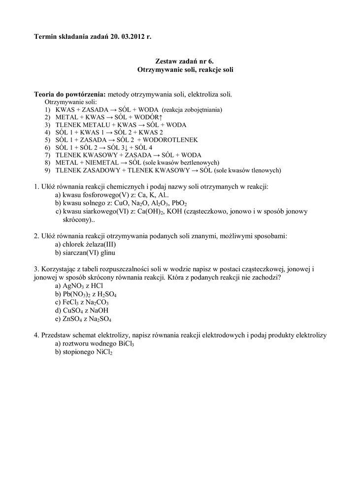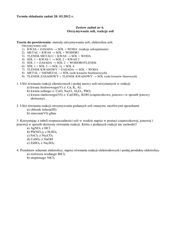 Termin składania zadań 20. 03.2012 r. Zestaw zadań nr 6. Otrzymywanie soli, reakcje soli Teoria do powtórzenia: metody otrzymywania soli, elektroliza soli. Otrzymywanie soli: 1) KWAS + ZASADA → SÓL + WODA (reakcja zobojętniania) 2) METAL + KWAS → SÓL + WODÓR↑ 3) TLENEK METALU + KWAS → SÓL + WODA 4) SÓL 1 + KWAS 1 → SÓL 2 + KWAS 2 5) SÓL 1 + ZASADA → SÓL 2 + WODOROTLENEK 6) SÓL 1 + SÓL 2 → SÓL 3↓ + SÓL 4 7) TLENEK KWASOWY + ZASADA → SÓL + WODA 8) METAL + NIEMETAL → SÓL (sole kwasów beztlenowych) 9) TLENEK ZASADOWY + TLENEK KWASOWY → SÓL (sole kwasów tlenowych) 1. Ułóż równania reakcji chemicznych i podaj nazwy soli otrzymanych w reakcji: a) kwasu fosforowego(V) z: Ca, K, Al.. b) kwasu solnego z: CuO, Na2O, Al2O3, PbO2 c) kwasu siarkowego(VI) z: Ca(OH)2, KOH (cząsteczkowo, jonowo i w sposób jonowy skrócony).. 2. Ułóż równania reakcji otrzymywania podanych soli znanymi, możliwymi sposobami: a) chlorek żelaza(III) b) siarczan(VI) glinu 3. Korzystając z tabeli rozpuszczalności soli w wodzie napisz w postaci cząsteczkowej, jonowej i jonowej w sposób skrócony równania reakcji. Która z podanych reakcji nie zachodzi? a) AgNO3 z HCl b) Pb(NO3)2 z H2SO4 c) FeCl3 z Na2CO3 d) CuSO4 z NaOH e) ZnSO4 z Na2SO4 4. Przedstaw schemat elektrolizy, napisz równania reakcji elektrodowych i podaj produkty elektrolizy a) roztworu wodnego BiCl3 b) stopionego NiCl2