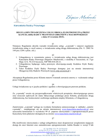 REGULAMIN ŚWIADCZENIA USŁUG DROGĄ ELEKTRONICZNĄ PRZEZ KANCELARIĘ RADCY PRAWNEGO ZBIGNIEWA MACHOWSKIEGO z dnia 23 września 2015r. §1 Niniejszy Regulamin określa warunki świadczenia usług: „e-porada” i stanowi regulamin świadczenia usług w myśl ustawy o świadczeniu usług drogą elektroniczną (Dz. U. 2002 Nr 144 poz.1204 z późn. zm.). §2 1. Usługodawcą w rozumieniu ustawy o świadczeniu usług drogą elektroniczną jest Kancelaria Radcy Prawnego Zbigniew Machowski, z siedzibą w Szczecinie, ul. 3-go Maja 12/4, 70-214 Szczecin, NIP 988-010-20-21. 2. Usługodawcę będącego radcą prawnym obowiązują zasady Kodeksu Etyki Radcy Prawnego. 3. Tekst Kodeksu Etyki Radcy Prawnego dostępny jest na stronie internetowej Okręgowej Izby Radców Prawnych (www.oirp.szczecin.pl ). §3 Akceptacja Regulaminu przez Klienta stanowi warunek zawarcia umowy o wykonanie usługi przez Usługodawcę. §4 Usługi świadczone są w języku polskim i zgodnie z obowiązującym prawem polskim. §5 Za „e-poradę” uważa się przyporządkowanie właściwych przepisów obowiązującego prawa oraz orzeczeń sądowych do stanu faktycznego podanego przez Klienta, przekazane drogą elektroniczną, bez konieczności osobistego spotkania między Klientem, a Usługodawcą. §6 Zamówienie „e-porady” polega na wysłaniu formularza umieszczonego w zakładce „zamów e-poradę”, znajdującego się na stronie internetowej www.kancelaria-machowski.pl oraz uiszczeniu honorarium w wysokości 99 zł poprzez skorzystanie z zaproponowanych przez Kancelarię form płatności dostępnych na stronie www.kancelaria-machowski.pl . §7 Dla możliwości skorzystania z usługi usługobiorca musi dysponować urządzeniem mającym dostęp do sieci Internet oraz zainstalowane oprogramowanie Adobe Reader w wersji 9 lub ul. 3-go Maja 12/4, 70- 214 Szczecin tel./fax 914 55 53 55, tel.kom. 505 44 88 45 [email protected], www.kancelaria-machowski.pl NIP: 988 010 20 21 nr rachunku bankowego: ING BANK ŚLĄSKI 49 1050 1559 1000 0090 9789 0785 nowszej oraz kompatybilny z tym oprogramowaniem system operacyjny, np. Procesor 1,3 GHz lub Mac OS. Windows §8 1. Dokonując zapłaty wynagrodzenia za wykonanie Usługi Klient wyraża zgodę na rozpoczęcie świadczenia usług przed upływem czternastodniowego terminu od zawarcia umowy. 2. W przypadku o którym mowa w ust. 1, w momencie wykonania usługi przez Kancelarię, Klient traci prawo odstąpienia od umowy, zgodnie z art. 38 pkt 1 ustawy z dnia 30 maja 2014 r. o prawach konsumenta (Dz. U. 2014 poz.827). §9 1. Wraz z poradą, na życzenie usługobiorcy może zostać przesłany wymagany prawem dokument księgowy, potwierdzający fakt dokonania zapłaty wynagrodzenia na rzecz usługodawcy. 2. Usługobiorca, któremu usługodawca zobowiązany jest wystawić fakturę wyraża zgodę na otrzymanie faktury elektronicznej. §10 Wykonanie usługi „e-porady” polegające na wysłaniu pisemnej porady prawnej na wskazany przez Klienta adres e-mail nastąpi w ciągu trzech dni roboczych od daty zaksięgowania płatności na rachunku bankowym Kancelarii, przesłania na adres e-mail Kancelarii potwierdzenia dokonania przelewu lub od dnia, w którym Klient na prośbę pracownika Kancelarii dostarczył brakujące informacje lub dokumenty niezbędne do wykonania usługi. §11 Kancelaria zastrzega sobie możliwość wydłużenia czasu potrzebnego na realizację usługi w skomplikowanych przypadkach oraz w sytuacji wystąpienia okoliczności niezależnych od Kancelarii, które uniemożliwią wykonanie usługi w terminie określonym w §9 (np. choroba, urlop i.in). O zmianie terminu realizacji usługi Kancelaria niezwłocznie poinformuje Klienta. §12 Kancelaria nie ponosi odpowiedzialności za niezgodności wynikające z niedokładnego lub błędnego przedstawienia stanu faktycznego przez Klienta. §13 1. Informacje przekazane Kancelarii w związku z zamówioną usługą on- line objęte są tajemnicą radcowską na podstawie art. 3 ustawy o radcach prawnych (Dz. U. 1982 Nr 19 poz. 145 z późn. zm.) i nie zostaną przekazane osobom trzecim. 2. Usługobiorca nie może dostarczać Usługodawcy treści o charakterze bezprawnym. §14 W przypadku zastrzeżeń do wykonania usługi przez Usługodawcę, Klient może zgłosić reklamację w formie pisemnej wysyłając ją na adres Kancelarii w terminie 7 dni od dnia realizacji usługi lub dnia, w którym miała być ona zrealizowana. §15 Kancelaria rozstrzyga reklamację w terminie 7 dni od dnia jej otrzymania i informuje Klienta pisemnie o jej wyniku. Jeżeli reklamacja zostanie uwzględniona, Kancelaria wykona usługę ponownie nie pobierając za nią dodatkowych opłat. §16 W sprawach nieuregulowanych w niniejszym regulaminie stosuje się przepisy Kodeksu Cywilnego oraz innych właściwych ustaw. §17 Postanowienia regulaminu wchodzą w życie z dniem publikacji na stronie internetowej Kancelarii.