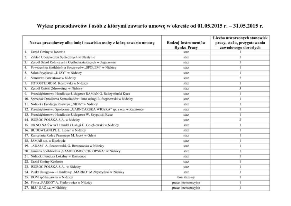 Wykaz pracodawców i osób z którymi zawarto umowę w okresie od 01.05.2015 r. – 31.05.2015 r. Nazwa pracodawcy albo imię i nazwisko osoby z którą zawarto umowę Rodzaj Instrumentów Rynku Pracy Liczba utworzonych stanowisk pracy, stażu, przygotowania zawodowego dorosłych 1. Urząd Gminy w Janowie staż 1 2. Zakład Ubezpieczeń Społecznych w Olsztynie staż 1 3. Zespół Szkół Rolniczych i Ogólnokształcących w Jagarzewie staż 1 4. Powszechna Spółdzielnia Spożywców „SPOŁEM” w Nidzicy staż 1 5. Salon Fryzjerski „U IZY” w Nidzicy staż 1 6. Starostwo Powiatowe w Nidzicy staż 2 7. FOTOSTUDIO M. Kostowski w Nidzicy staż 1 8. Zespół Opieki Zdrowotnej w Nidzicy staż 3 9. Przedsiębiorstwo Handlowo-Usługowe RAMAN G. Radzymiński Kuce staż 1 10. Sprzedaż Detaliczna Samochodów i inne usługi R. Stępnowski w Nidzicy staż 1 11. Nidzicka Fundacja Rozwoju „NIDA” w Nidzicy staż 1 12. Przedsiębiorstwo Społeczne „GARNCARSKA WIOSKA” sp. z o.o. w Kamionce staż 1 13. Przedsiębiorstwo Handlowo-Usługowe W. Szypulski Kuce staż 1 14. ISOROC POLSKA S.A. w Nidzicy staż 2 15. OKNO NA ŚWIAT Handel i Usługi G. Gołębiewski w Nidzicy staż 1 16. BUDOWLANI.PL Ł. Lipner w Nidzicy staż 1 17. Kancelaria Radcy Prawnego M. Jacek w Gdyni staż 1 18. JAMAR s.c. w Kozłowie staż 1 19. „ADAM” A. Brzozowski, G. Brzozowska w Nidzicy staż 1 20. Gminna Spółdzielnia „SAMOPOMOC CHŁOPSKA” w Nidzicy staż 1 21. Nidzicki Fundusz Lokalny w Kamionce staż 1 22. Urząd Gminy Kozłowo staż 1 23. ISOROC POLSKA S.A. w Nidzicy staż 1 24. Punkt Usługowo – Handlowy „MARKO” M.Zbyszyński w Nidzicy staż 1 bon stażowy 1 26. Firma „FARGO” A. Fiedorowicz w Nidzicy prace interwencyjne 1 27. BLU-GAZ s.c. w Nidzicy prace interwencyjne 1 25. DOM spółka jawna w Nidzicy 28. Prywatny Gabinet Stomatologiczny M. Czyżewska w Nidzicy prace interwencyjne 1 29. AGROFARMA E. Krzyżewska w Kozłowie prace interwencyjne 1 30. Polskie Stowarzyszenie na Rzecz Osób z Upośledzeniem Umysłowym Koło w Nidzicy prace interwencyjne 1 31. P.P.H.U „STOLMAKS” T. Maksymiak Piątki prace interwencyjne 1 32. Firma Handlowo-Usługowa ELEKTRO-SERWIS A. Butkiewicz w Nidzicy prace interwencyjne 1 33. Handel i Usługi Ł. Krzyżewski w Kozłowie prace interwencyjne 1 34. FOTOSTUDIO M. Kostowski w Nidzicy prace interwencyjne 1 35. Gminny Ośrodek Pomocy Społecznej w Janowie prace interwencyjne 1 36. „SWOJSKIE JADŁO” E. Rutkowska w Glinojecku prace interwencyjne 1 37. Ubój i Sprzedaż Mięsa A. Kotyla, A. Kotyla w Rozdrożu prace interwencyjne 1 38. PHU „KOŁAKOWSKI” sp. z o.o. w Nidzicy prace interwencyjne 1 39. Centrum Ogrodnicze Orzechowski Tatary prace interwencyjne 1 40. Sklep Spożywczo-Przemysłowy E. Koksa w Szczepkowie Borowym prace interwencyjne 1 41. KAMET spółka z o.o. Piątki prace interwencyjne 1 42. Zakład Usługowo – Handlowy K.Majewski Safronka prace interwencyjne 1 43. ISOROC POLSKA S.A. W Nidzicy prace interwencyjne 1 44. Wyrób i Sprzedaż Opakowań „PAKO” Z. Stanowicki Więckowo dofinansowanie wynagrodzenia 1 45. Przedsiębiorstwo Usługowe Gospodarki Komunalnej spółka z o.o. w Nidzicy dofinansowanie wynagrodzenia 1 46. Powiatowy Zarząd Dróg w Nidzicy roboty publiczne 3 47. Urząd Gminy w Janowie roboty publiczne 1 48. Urząd Gminy w Kozłowie roboty publiczne 4 Nidzica 29.05.2015r. Sporządziła: Anna Zakrzewska