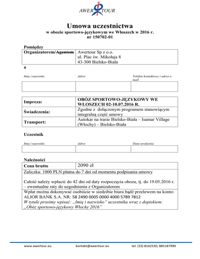 Umowa uczestnictwa w obozie sportowo-językowym we Włoszech w 2016 r. nr 150702-01 Pomiędzy Organizatorem/Agentem Awertour Sp z o.o. ul. Plac św. Mikołaja 8 43-300 Bielsko-Biała a Imię i nazwisko Impreza: Świadczenia: Transport: Adres Telefon kontaktowy i adres email OBÓZ SPORTOWO-JĘZYKOWY WE WŁOSZECH 02-10.07.2016 R. Zgodne z dołączonym programem stanowiącym integralną część umowy Autokar na trasie Bielsko-Biała – Isamar Village (Włochy) – Bielsko-Biała Uczestnik Imię i nazwisko Adres Data urodzenia Należności 2090 zł Cena brutto Zaliczka: 1000 PLN płatna do 7 dni od momentu podpisania umowy Całość należy wpłacić do 42 dni od daty rozpoczęcia obozu, tj. do 19.05.2016 r. – ewentualne raty do uzgodnienia z Organizatorem Wpłat można dokonywać osobiście w siedzibie biura bądź przelewem na konto: ALIOR BANK S.A. NR: 58 2490 0005 0000 4000 5789 7812 W tytule prosimy wpisać: „Imię i nazwisko” uczestnika wraz z dopiskiem: „Obóz sportowo-językowy Włochy 2016” www.awertour.eu [email protected] tel. (33) 8162530, 885187990 AWERTOUR Sp. z.o.o. z siedzibą w Bielsku-Białej, Pl. Św. Mikołaja8 jest administratorem danych osobowych zgodnie z przepisami ustawy z dnia 29.08.1997r. o ochronie danych osobowych. Dane osobowe zamawiającego oraz zgłoszonych przez niego uczestników będą przetwarzane w celu realizacji zawartej umowy. Podanie danych jest dobrowolne. Zamawiającemu oraz zgłoszonym przez niego uczestnikom przysługuje prawo dostępu do swoich danych osobowych, oraz prawo do ich poprawiania. Ponadto zgodnie z ustawą z dnia 29.08.1997r. o ochronie danych osobowych wyrażam zgodę na przetwarzanie moich/mojego dziecka danych (imię i nazwisko, adres zamieszkania, data urodzenia numer telefonu, adres e-mail) w celu marketingu usług edukacyjnych i turystycznych Awertour Sp.z.o.o oraz podmiotów z nią współpracujących. TAK NIE Zgodnie z ustawą z dnia 18.07.2002 r. o świadczeniu usług droga elektroniczną wyrażam zgodę na przesyłanie mi/mojemu dziecku przez AWERTOUR Sp. z o.o. informacji handlowej obejmującej usługi edukacyjne i turystyczne AWERTOUR Sp. z o.o. oraz podmiotów z nią współpracujących, za pomocą środków komunikacji elektronicznej. TAK NIE Oświadczam, że w imieniu własnym oraz zgłoszonych przeze mnie osób zapoznałem się z ofertą i warunkami umowy, oraz zapoznałem się z treścią Ogólnych Warunków Ubezpieczenia AXA TUiR S.A. co akceptuję własnoręcznym podpisem. Zobowiązuję się do dokonania pełnej wpłaty za obóz na 6 tygodni przed rozpoczęciem obozu TAK --------------------------------------- Podpis w imieniu Organizatora www.awertour.eu NIE -------------------------------------- Miejsce i data [email protected] ---------------------------------------- Czytelny podpis osoby zgłaszającej tel. (33) 8162530, 885187990 OBÓZ SPORTOWO-JĘZYKOWY WŁOCHY 2016 Termin: 01.07-08.07.2016 Cena: 2090 PLN JĘZYK ANGIELSKI : warsztaty językowe mające charakter dodatkowych konwersacji, symulacji językowych używanie języka angielskiego w codziennych sytuacjach w czasie trwania obozu zabawy, gry, konkursy i projekty w języku angielskim związane z tematem przewodnim obozu opiekę i wszystkie zajęcia językowe prowadzą doświadczeni lektorzy języka angielskiego ZAJĘCIA SPORTOWE : bieganie, pływanie, wycieczki piesze, zajęcia fitness, zumba (NOWOŚĆ) gry zespołowe – siatkówka, koszykówka, piłka nożna wszystkie zajęcia mają charakter ogólnorozwojowy zajęcia, konkursy, zawody sportowe utrzymane w duchu sportowej i pozytywnej rywalizacji podczas wszystkich zajęć dzieci są pod opieką doświadczonych trenerów i instruktorów, którzy dbają o ich bezpieczeństwo ZAKWATEROWANIE : zakwaterowanie na trenie ośrodka wakacyjnego w standardzie **** (nowy ośrodek ) we Włoszech z bezpośrednim dostępem do prywatnej piaszczystej plaży w domkach cztero lub pięcioosobowych kompleks basenów: basen olimpijski, basen z hydromasażem, basen z przeciwprądem, basen dla dzieci ze zjeżdżalnią i wodnymi zabawami, basen relaks dla dorosłych i dzieci naprzeciw restauracji dodatkowe atrakcje : ping pong, sala zabaw, park z dmuchanymi zjeżdżalniami , korty tenisowe, boiska do piłki nożnej, boiska do koszykówki, boiska do siatkówki plażowej, trasy wrotkarskie oraz dla deskorolek pełne wyżywienie (trzy posiłki) dostosowane specjalnie do potrzeb dzieci, pomiędzy posiłkami serwowane owoce oraz woda mineralna dostępna jest bez ograniczeń WYCIECZKA (fakultatywna): Dodatkowo dla chętnych organizowana jest wycieczka statkiem do Wenecji, która kosztuje dodatkowo 30€. www.awertour.eu [email protected] tel. (33) 8162530, 885187990 Ogólny plan dnia: 7:00 7:15-8:00 8:00-8:30 8:30-9:15 9:45-11:15 11:30-13:00 13:15-14:15 14:15-15:15 15:30-17:15 17:15-18:15 18:30-19:15 19:30-21:00 21:00-22:00 22.00 pobudka dla chętnych gimnastyka poranna/rozruch/zumba pobudka, toaleta poranna śniadanie język angielski gr I nauka pływania/basen gr II język angielski gr II nauka pływania/basen gr I obiad siesta plażowanie język angielski kolacja zajęcia ruchowo – sportowe/animacje/zumba przygotowanie do ciszy nocnej, toaleta wieczorna cisza nocna Cena obejmuje: przejazd klimatyzowanym autokarem, noclegi w domkach cztero-, pięcioosobowych w ośrodku wakacyjnym, standard ***+ z pełną infrastrukturą: basen, boisko, tereny zielone, bezpośredni dostęp do plaży, wyżywienie w postaci śniadań, obiadów i kolacji, napoje: woda bez limitu 24 h na dobę, dodatkowe podawane napoje do posiłków, opieka pedagogiczna wykwalifikowanej kadry, co najmniej 3 h godziny zajęć z języka angielskiego codziennie, zajęcia sportowe opieka pilota, Ubezpieczenie kosztów leczenia i assistance (KLiA) do kwoty 20.000 EUR, Ubezpieczenie NNW do kwoty 4.000 EUR, Ubezpieczenie BP (bagażu) do kwoty 400 EUR. Cena nie obejmuje: wycieczki fakultatywnej Zapisy: Biuro PODRÓŻY AWERTOUR PLAC ŚW MIKOŁAJA 8 43-300 BIELSKO-