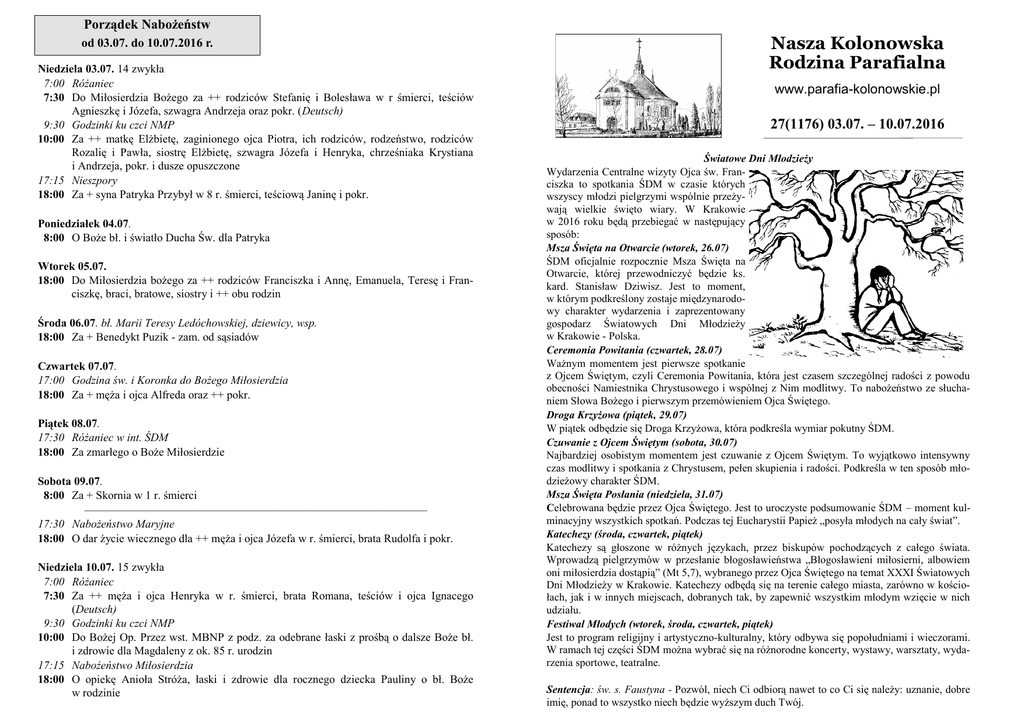 Porządek Nabożeństw od 03.07. do 10.07.2016 r. Niedziela 03.07. 14 zwykła 7:00 Różaniec 7:30 Do Miłosierdzia Bożego za ++ rodziców Stefanię i Bolesława w r śmierci, teściów Agnieszkę i Józefa, szwagra Andrzeja oraz pokr. (Deutsch) 9:30 Godzinki ku czci NMP 10:00 Za ++ matkę Elżbietę, zaginionego ojca Piotra, ich rodziców, rodzeństwo, rodziców Rozalię i Pawła, siostrę Elżbietę, szwagra Józefa i Henryka, chrześniaka Krystiana i Andrzeja, pokr. i dusze opuszczone 17:15 Nieszpory 18:00 Za + syna Patryka Przybył w 8 r. śmierci, teściową Janinę i pokr. Poniedziałek 04.07. 8:00 O Boże bł. i światło Ducha Św. dla Patryka Wtorek 05.07. 18:00 Do Miłosierdzia bożego za ++ rodziców Franciszka i Annę, Emanuela, Teresę i Franciszkę, braci, bratowe, siostry i ++ obu rodzin Środa 06.07. bł. Marii Teresy Ledóchowskiej, dziewicy, wsp. 18:00 Za + Benedykt Puzik - zam. od sąsiadów Czwartek 07.07. 17:00 Godzina św. i Koronka do Bożego Miłosierdzia 18:00 Za + męża i ojca Alfreda oraz ++ pokr. Piątek 08.07. 17:30 Różaniec w int. ŚDM 18:00 Za zmarłego o Boże Miłosierdzie Sobota 09.07. 8:00 Za + Skornia w 1 r. śmierci ——–—–——–—–—————————–—————–——————— 17:30 Nabożeństwo Maryjne 18:00 O dar życie wiecznego dla ++ męża i ojca Józefa w r. śmierci, brata Rudolfa i pokr. Niedziela 10.07. 15 zwykła 7:00 Różaniec 7:30 Za ++ męża i ojca Henryka w r. śmierci, brata Romana, teściów i ojca Ignacego (Deutsch) 9:30 Godzinki ku czci NMP 10:00 Do Bożej Op. Przez wst. MBNP z podz. za odebrane łaski z prośbą o dalsze Boże bł. i zdrowie dla Magdaleny z ok. 85 r. urodzin 17:15 Nabożeństwo Miłosierdzia 18:00 O opiekę Anioła Stróża, łaski i zdrowie dla rocznego dziecka Pauliny o bł. Boże w rodzinie Nasza Kolonowska Rodzina Parafialna www.parafia-kolonowskie.pl 27(1176) 03.07. – 10.07.2016 Światowe Dni Młodzieży Wydarzenia Centralne wizyty Ojca św. Franciszka to spotkania ŚDM w czasie których wszyscy młodzi pielgrzymi wspólnie przeżywają wielkie święto wiary. W Krakowie w 2016 roku będą przebiegać w następujący sposób: Msza Święta na Otwarcie (wtorek, 26.07) ŚDM oficjalnie rozpocznie Msza Święta na Otwarcie, której przewodniczyć będzie ks. kard. Stanisław Dziwisz. Jest to moment, w którym podkreślony zostaje międzynarodowy charakter wydarzenia i zaprezentowany gospodarz Światowych Dni Młodzieży w Krakowie - Polska. Ceremonia Powitania (czwartek, 28.07) Ważnym momentem jest pierwsze spotkanie z Ojcem Świętym, czyli Ceremonia Powitania, która jest czasem szczególnej radości z powodu obecności Namiestnika Chrystusowego i wspólnej z Nim modlitwy. To nabożeństwo ze słuchaniem Słowa Bożego i pierwszym przemówieniem Ojca Świętego. Droga Krzyżowa (piątek, 29.07) W piątek odbędzie się Droga Krzyżowa, która podkreśla wymiar pokutny ŚDM. Czuwanie z Ojcem Świętym (sobota, 30.07) Najbardziej osobistym momentem jest czuwanie z Ojcem Świętym. To wyjątkowo intensywny czas modlitwy i spotkania z Chrystusem, pełen skupienia i radości. Podkreśla w ten sposób młodzieżowy charakter ŚDM. Msza Święta Posłania (niedziela, 31.07) Celebrowana będzie przez Ojca Świętego. Jest to uroczyste podsumowanie ŚDM – moment kulminacyjny wszystkich spotkań. Podczas tej Eucharystii Papież „posyła młodych na cały świat”. Katechezy (środa, czwartek, piątek) Katechezy są głoszone w różnych językach, przez biskupów pochodzących z całego świata. Wprowadzą pielgrzymów w przesłanie błogosławieństwa „Błogosławieni miłosierni, albowiem oni miłosierdzia dostąpią” (Mt 5,7), wybranego przez Ojca Świętego na temat XXXI Światowych Dni Młodzieży w Krakowie. Katechezy odbędą się na terenie całego miasta, zarówno w kościołach, jak i w innych miejscach, dobranych tak, by zapewnić wszystkim młodym wzięcie w nich udziału. Festiwal Młodych (wtorek, środa, czwartek, piątek) Jest to program religijny i artystyczno-kulturalny, który odbywa się popołudniami i wieczorami. W ramach tej części ŚDM można wybrać się na różnorodne koncerty, wystawy, warsztaty, wydarzenia sportowe, teatralne. Sentencja: św. s. Faustyna - Pozwól, niech Ci odbiorą nawet to co Ci się należy: uznanie, dobre imię, ponad to wszystko niech będzie wyższym duch Twój. 27/2016 Kalendarz parafialny: - 06 i 13 lipiec, Wakacje z Bogiem, organizowane przez Caritas - 10 lipiec, gościmy rodzinę świeckich misjonarzy - 12 lipiec, Msza św. Roku Miłosierdzia - 13 lipiec, Nabożeństwo Fatimskie - 16 lipiec, spotkanie czcicieli MB Szkaplerznej - 17 lipiec, błogosławieństwo kierowców - 20-25 lipiec, Dni Młodzieży w Parafii - 25-31 lipiec, ŚDM w Krakowie - 31 lipiec, Adoracja Najśw. Sakramentu - 07 sierpień, świadectwo młodzieży o ŚDM - 13 sierpień, Nabożeństwo Fatimskie - 15-20 sierpień, Pielgrzymka Opolska - 13-24 sierpień, Camino samotnie, Suwałki - Gietrzwałd, 320 km. - 26-28 sierpień, piesza pielgrzymka na Górę św. Anny - 30 sierpień, Msza św. Roku Miłosierdzia - 13 wrzesień, Nabożeństwo Fatimskie - 18 wrzesień, Dożynki Gminne - 20 wrzesień, Msza św. Roku Miłosierdzia - 26 wrzesień-04 październik, pielgrzymka Roku Świętego do Włoch ——–—–———————————–————————–———–————— PAPIESKA INTENCJA OGÓLNA Aby szanowane były ludy tubylcze, których tożsamość, egzystencja są zagrożone. PAPIESKA INTENCJA MISYJNA Aby Kościół głosił Ewangelię z odnowionym zapałem i entuzjazmem. PROŚBA O MODLITWĘ W intencji ŚDM w parafii i w Krakowie. ——–—–———————————–————————–———–————— Opowiadanie Do mądrego rabina przyszedł pewien strapiony człowiek. Rabbi - rzekł, załamując ręce jestem do niczego. Nie udaje mi się zrobić nawet połowy tego, co powinienem