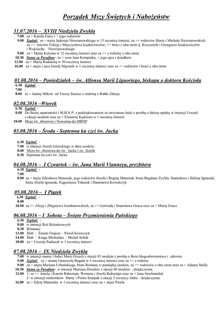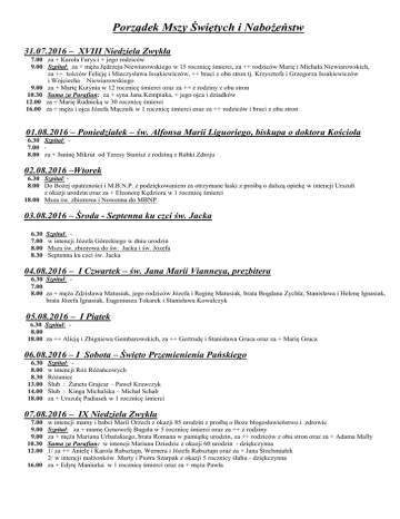 Porządek Mszy Świętych i Nabożeństw 31.07.2016 – XVIII Niedziela Zwykła 7.00 za + Karola Farys i + jego rodziców 9.00 Szpital: za + męża Jędrzeja Niewiarowskiego w 15 rocznicę śmierci, za ++ rodziców Marię i Michała Niewiarowskich, za ++ teściów Felicję i Mieczysława Issakiewiczów, ++ braci z obu stron tj. Krzysztofa i Grzegorza Issakiewiczów i Wojciecha Niewiarowskiego 9.00 za + Martę Kutynia w 12 rocznicę śmierci oraz za ++ z rodziny z obu stron 10.30 Suma za Parafian: za + syna Jana Kempiaka, + jego ojca i dziadków 12.00 za + Marię Rudnicką w 30 rocznicę śmierci 16.00 za + męża i ojca Józefa Mącznik w 1 rocznicę śmierci oraz za ++ rodziców i braci z obu stron 01.08.2016 – Poniedziałek – św. Alfonsa Marii Liguoriego, biskupa o doktora Kościoła 6.30 Szpital: 7.00 8.00 za + Janinę Mikrut od Teresy Stanisz z rodziną z Rabki Zdroju 02.08.2016 –Wtorek 6.30 Szpital: 8.00 Do Bożej opatrzności i M.B.N.P. z podziękowaniem za otrzymane łaski z prośbą o dalszą opiekę w intencji Urszuli z okazji urodzin oraz za + Eleonorę Kędziora w 1 rocznicę śmierci 18.00 Msza św. zbiorowa i Nowenna do MBNP 03.08.2016 – Środa - Septenna ku czci św. Jacka 6.30 7.00 8.00 8.30 Szpital: w intencji Józefa Góreckiego w dniu urodzin Msza św. zbiorowa do św. Jacka i św. Józefa Septenna ku czci św. Jacka 04.08.2016 – I Czwartek – św. Jana Marii Vianneya, prezbitera 6.30 Szpital: 7.00 8.00 za + męża Zdzisława Matusiak, jego rodziców Józefa i Reginę Matusiak, brata Bogdana Zychla, Stanisława i Helenę Ignasiak, brata Józefa Ignasiak, Eugeniusza Tokarek i Stanisława Kowalczyk 05.08.2016 – I Piątek 6.30 Szpital: - 8.00 18.00 za ++ Alicję i Zbigniewa Gembarowskich, za ++ Gertrudę i Stanisława Gruca oraz za + Marię Gruca 06.08.2016 – I Sobota – Święto Przemienienia Pańskiego 6.30 8.00 8.30 13.00 14.00 18.00 Szpital: w intencji Róż Różańcowych Różaniec Ślub : Żaneta Grajcar – Paweł Krawczyk Ślub : Kinga Michalska – Michał Schab za + Urszulę Padiasek w 1 rocznicę śmierci 07.08.2016 – IX Niedziela Zwykła w intencji mamy i babci Marii Orzech z okazji 85 urodzin z prośbą o Boże błogosławieństwo i zdrowie Szpital: za + mamę Genowefę Bugała w 5 rocznicę śmierci oraz za ++ z rodziny za + męża Mariana Urbańskiego, brata Romana w pamiątkę urodzin, za ++ rodziców z obu stron oraz za + Adama Mally Suma za Parafian: w intencji Mariana Dziedzic z okazji 60 urodzin - dziękczynna 1/ za ++ Anielę i Karola Rabsztajn, Wernera i Józefa Rabsztajn oraz za + Jana Stochmiałek 2/ w intencji małżonków Marty i Piotra Szarpak z okazji 5 rocznicy ślubu - dziękczynna 16.00 za + Edytę Maniurka w 1 rocznicę śmierci oraz za + męża Pawła 7.00 9.00 9.00 10.30 12.00