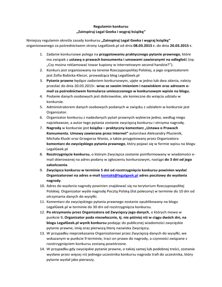 Regulamin konkursu „Zainspiruj Legal Geeka i wygraj książkę” Niniejszy regulamin określa zasady konkursu „Zainspiruj Legal Geeka i wygraj książkę” organizowanego za pośrednictwem strony LegalGeek.pl od dnia 08.03.2015 r. do dnia 20.03.2015 r. 1. Zadanie konkursowe polega na przygotowaniu praktycznego pytanie prawnego, które ma związek z ustawą o prawach konsumenta i umowami zawieranymi na odległość (np. „Czy można reklamować towar kupiony w internetowym second handzie?”). 2. Konkurs jest organizowany na terenie Rzeczypospolitej Polskiej, a jego organizatorem jest Zofia Babicka-Klecor, prowadząca blog LegalGeek.pl 3. Pytanie prawne będące zadaniem konkursowym, ujęte w jedno lub dwa zdania, należy przesłać do dnia 20.03.2015r. wraz ze swoim imieniem i nazwiskiem oraz adresem email za pośrednictwem formularza umieszczonego w konkursowym wpisie na blogu. 4. Podanie danych osobowych jest dobrowolne, ale konieczne do wzięcia udziału w konkursie. 5. Administratorem danych osobowych podanych w związku z udziałem w konkursie jest Organizator. 6. Organizator konkursu z nadesłanych pytań prawnych wybierze jedno, według niego najciekawsze, a autor tego pytania zostanie zwycięzcą konkursu i otrzyma nagrodę. 7. Nagrodą w konkursie jest książka – praktyczny komentarz „Ustawa o Prawach Konsumenta. Umowy zawierane przez Internet” autorstwa Aleksandry Płucienik, Michała Kluski oraz Grzegorza Wanio, a także przygotowany przez Organizatora komentarz do zwycięskiego pytania prawnego, który pojawi się w formie wpisu na blogu LegalGeek.pl 8. Rozstrzygnięcie konkursu, o którym Zwycięzca zostanie poinformowany w wiadomości email skierowanej na adres podany w zgłoszeniu konkursowym, nastąpi do 3 dni od jego zakończenia. 9. Zwycięzca konkursu w terminie 5 dni od rozstrzygnięcia konkursu powinien wysłać Organizatorowi na adres e-mail [email protected] adres pocztowy do wysłania nagrody. 10. Adres do wysłania nagrody powinien znajdować się na terytorium Rzeczypospolitej Polskiej. Organizator wyśle nagrodę Pocztą Polską (list polecony) w terminie do 10 dni od otrzymania danych do wysyłki. 11. Komentarz do zwycięskiego pytania prawnego zostanie opublikowany na blogu LegalGeek.pl w terminie do 30 dni od rozstrzygnięcia konkursu. 12. Po otrzymaniu przez Organizatora od Zwycięzcy jego danych, o których mowa w punkcie 9, Organizator poda niezwłocznie, tj. nie później niż w ciągu dwóch dni, na blogu LegalGeek.pl wynik konkursu podając do publicznej wiadomości zwycięskie pytanie prawne, imię oraz pierwszą literę nazwiska Zwycięzcy. 13. W przypadku nieprzekazania Organizatorowi przez Zwycięzcę danych do wysyłki, we wskazanym w punkcie 9 terminie, traci on prawo do nagrody, a czynności związane z rozstrzygnięciem konkursu zostaną powtórzone. 14. W przypadku gdy zwycięskie pytanie prawne, o takiej samej lub podobnej treści, zostanie wysłane przez więcej niż jednego uczestnika konkursu nagroda trafi do uczestnika, który pytanie wysłał jako pierwszy. 15. Reklamacje związane z konkursem należy zgłaszać na adres [email protected]. Reklamację Organizator rozpatrzy w terminie 14 dni. 16. Jeśli Organizator uzna, że inne pytania prawne nadają się do poruszenia na blogu LegalGeek.pl również może przygotować komentarze do nich, w formie wpisu na blogu.