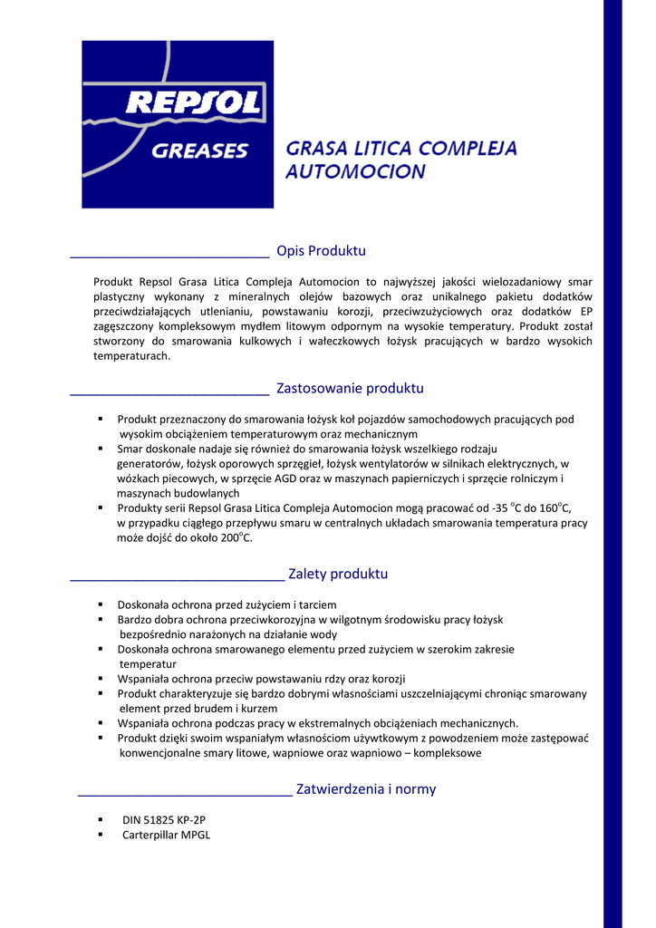 __________________________ Opis Produktu Produkt Repsol Grasa Litica Compleja Automocion to najwyższej jakości wielozadaniowy smar plastyczny wykonany z mineralnych olejów bazowych oraz unikalnego pakietu dodatków przeciwdziałających utlenianiu, powstawaniu korozji, przeciwzużyciowych oraz dodatków EP zagęszczony kompleksowym mydłem litowym odpornym na wysokie temperatury. Produkt został stworzony do smarowania kulkowych i wałeczkowych łożysk pracujących w bardzo wysokich temperaturach. __________________________ Zastosowanie produktu Produkt przeznaczony do smarowania łożysk koł pojazdów samochodowych pracujących pod wysokim obciążeniem temperaturowym oraz mechanicznym Smar doskonale nadaje się również do smarowania łożysk wszelkiego rodzaju generatorów, łożysk oporowych sprzęgieł, łożysk wentylatorów w silnikach elektrycznych, w wózkach piecowych, w sprzęcie AGD oraz w maszynach papierniczych i sprzęcie rolniczym i maszynach budowlanych Produkty serii Repsol Grasa Litica Compleja Automocion mogą pracować od -35 oC do 160oC, w przypadku ciągłego przepływu smaru w centralnych układach smarowania temperatura pracy może dojść do około 200oC. ____________________________ Zalety produktu Doskonała ochrona przed zużyciem i tarciem Bardzo dobra ochrona przeciwkorozyjna w wilgotnym środowisku pracy łożysk bezpośrednio narażonych na działanie wody Doskonała ochrona smarowanego elementu przed zużyciem w szerokim zakresie temperatur Wspaniała ochrona przeciw powstawaniu rdzy oraz korozji Produkt charakteryzuje się bardzo dobrymi własnościami uszczelniającymi chroniąc smarowany element przed brudem i kurzem Wspaniała ochrona podczas pracy w ekstremalnych obciążeniach mechanicznych. Produkt dzięki swoim wspaniałym własnościom używtkowym z powodzeniem może zastępować konwencjonalne smary litowe, wapniowe oraz wapniowo – kompleksowe ____________________________ Zatwierdzenia i normy DIN 51825 KP-2P Carterpillar MPGL ____________________________ Charakterystyczne dane techniczne Kolor Klasa Konsystencji Typ zagęszczacza Lapkość oleju bazowego, ISO o Penetracja, 25 C - po 60 cyklach - po 100.000 cyklach Temperatura kroplenia o Korozja miedzi, 24h 100 C Test na aparacie 4 kulowym, 80 Kg, 1 minuta Test EP na 4 kulowyml aparacie Zywotność (160≥C/1000 rpm) Test na korozję na aparacie Emcor Jednostka Metoda Visual NLGI cSt ASTM D 445 Wartość Yellow 2/3 Mydło Litowe Kompleksowe 130 1/10 mm 1/10 mm o C ASTM D 217 ASTM D 217 ASTM D 566 ASTM D 4048 IP 239 IP 239 ASTM D 3527 DIN 51802E 245 265 290 1a 0,37 250 100 0-0 mm Kg H ____________________________ Opakowanie Beczka 45 Kg i 5 Kg metalowa puszka Karta katalogowa, Wydanie 1, Lipiec 2002