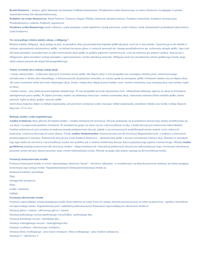 Rynek finansowy - miejsce, gdzie dokonuje się transakcji środkami pieniężnymi. Przedmiotem rynku finansowego są walory finansowe występujące w postaci zmaterializowanej lub zdematerializowanej. Podmioty na rynku finansowym Skarb Państwa, Terenowe Organy Władzy, Instytucje ubezpieczeniowe, Fundusze emerytalne, Fundusze inwestycyjne, Przedsiębiorstwa, Ludność, Podmioty zagraniczne Struktura rynku finansowego rynek walutowy, rynek pieniężny, rynek kapitałowy (rynek pierwotny, rynek wtórny), rynek instrumentów pochodnych (derywatów), rynek kredytowy Na czym polega różnica między akcją, a obligacją ? Różnica między obligacją , akcja polega na tym, że posiadacz akcji jest posiadaczem kapitału spółki akcyjnej, czyli ma w niej udziały. Uprawnia go to do udziału w walnym zgromadzeniu akcjonariuszy spółki , na którym ma prawo głosu w ważnych sprawach dot. danego przedsiębiorstwa np. wybierania zarządu spółki. Jego zysk lub strata pieniędzy uwarunkowane są tylko notowaniami akcji spółki na giełdzie papierów wartościowych, czyli od rynkowej gry popytu i podaży. Inaczej jest z obligacjami, gdzie posiadacz zyskuje pieniądze z oprocentowania z tytułu udzielonej pożyczki. Obligacja może być przedmiotem obrotu giełdowego (wtedy ulega takim samym prawom jak akcja) lub pozagiełdowego. Należy wyróżnić dwa rodzaje emisji akcji: • emisja założycielska - wydawanie akcji przy tworzeniu nowej spółki, dla objęcia akcji w tym przypadku jest wymagane złożenie przez zainteresowanego oświadczenia w formie aktu notarialnego, w którym przyszły akcjonariusz stwierdza, że wyraża zgodę na zawiązanie spółki i brzmienie statutu oraz na objęcie akcji. Akt musi wymieniać osobę lub osoby obejmujące akcje, liczbę i rodzaj akcji objętych przez każdą z nich, wartość nominalną, cenę emisyjną akcji oraz terminy wpłat na akcje. • kolejne emisje - przy podwyższaniu kapitału zakładowego. W tym przypadku przyszły akcjonariusz (tzw. subskrybent) dokonuje zapisów na akcje na formularzu udostępnionym przez spółkę. W zapisie powinny znaleźć się informacje dotyczące: wartości nominalnej akcji, oznaczenia emitenta (firma siedziba spółki, numer rejestru), wpłat na akcje, podpis i pieczęć spółki. Jeżeli akcje mają być objęte za wkłady niepieniężne, akt powinien wymieniać osoby wnoszące wkład niepieniężny, przedmiot wkładu oraz liczbę i rodzaj objętych akcji (art. 313 k.s.h.). Rodzaje analizy rynku kapitałowego: Analiza techniczna służy głównie do badania krótko- i średnio-terminowych inwestycji. Decyzje podejmuje się na podstawie historycznej analizy kształtowania się cen akcji i występowania punktów zwrotnych. W metodach tej grupy nie mówi się nic o dywersyfikacji ryzyka, a każda decyzja jest realizowana indywidualnie. Analiza techniczna nie jest uważana za naukową metodę podejmowania decyzji, jednak w jej nowoczesnych modyfikacjach można znaleźć wiele ciekawych propozycji, zwłaszcza dotyczących teorii chaosu. Z kolei analiza fundamentalna wykorzystywana jest do inwestycji długoterminowych, w praktyce o horyzoncie przekraczającym 6 miesięcy. Podstawą do decyzji jest ocena kondycji finansowo – ekonomicznej spółki i wycena wewnętrznej wartości akcji. Również w metodach tego typu analiz nie ma mowy o dywersyfikacji ryzyka oraz podobne jak w analizie technicznej decyzje dotyczą pojedynczego papieru wartościowego. Metody analizy portfelowej znajdują zastosowanie dla inwestycji średnio- i długo-terminowych. Najczęściej podstawą do decyzji jest maksymalizacja stopy zwrotu przy określonym poziomie ryzyka lub przy danym poziomie stopy zwrotu minimalizacja ryzyka. Metody tej grupy jako jedyne zajmują się dywersyfikacją ryzyka. Formacje kontynuowania trendu Formacje kontynuacji trendu, to wzory reprezentujące okresową "pauzę" - chwilowe załamanie - w kształtowaniu się dotychczasowych tendencji, po której następuje kontynuacja tego samego trendu. Najpopularniejszymi formacjami kontynuacji trendu są: formacja kwadratu i prostokąta, flagi, chorągiewki (proporce), kliny, romby i diamenty, trójkąty. Formacje odwrócenia trendu Formacje zapowiadające zmianę panującego trendu służą traderom na rynku Forex do zmiany dotychczasowej pozycji na rynku na przeciwną - zgodną z kierunkiem nowopowstałego trendu. Najpopularniejszymi i najbardziej jednoznacznymi formacjami zapowiadającymi odwrócenie trendu to: formacja głowy i ramion / odwróconej głowy i ramion, formacja podwójnego szczytu (podwójnego wierzchołka) / podwójnego dna, formacja potrójnego szczytu / potrójnego dna, formacja zaokrąglonego szczytu / zaokrąglonego dna, formacja wachlarza / odwróconego wachlarza, formacja klina zwyżkującego - przy kursie rosnącym / klina zniżkującego - przy trendzie malejącym, formacja V / odwrócone V. Analiza fundamentalna jest to jedna z podstawowych technik analizy rynku kapitałowego. Zajmuje się ona szacowaniem wartości akcji danej spółki w oparciu o następujące czynniki: Polityka fiskalna i monetarna; Ogólny klimat ekonomiczny; Zdarzenia polityczne; Pozycja finansowa spółki; Sytuacja w poszczególnych branżach. Analiza fundamentalna składa się z: Analizy makrootoczenia, Analizy sektorowej, Analizy sytuacyjnej spółki, Analizy finansowej spółki, Wyceny spółki, Do zebrania informacji wykorzystuje się: Prospekt emisyjny; Okresowe i roczne raporty; Analizy rynkowe; Informacje ekonomiczne z otoczenia spółki. Spotkania z zarządami spółek, Stosuje się także takie czynniki jak pesymizm lub optymizm. Celem analizy fundamentalnej jest monitorowanie i klasyfikowanie aktywów finansowych pod względem ich jakości inwestycyjnej (jako szacunkowej oceny ryzyka) oraz oczekiwanej stopy zwrotu. Analitycy fundamentalni starają się po prostu wycenić instrument (spółkę). Następnie porównując wycenę z ceną rynkową, przewidują dalszy rozwój
