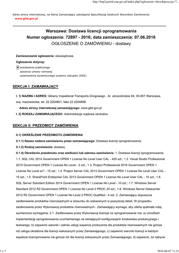 http://bzp2.portal.uzp.gov.pl/index.php?ogloszenie=show&pozycja=7... Adres strony internetowej, na której Zamawiający udostępnia Specyfikację Istotnych Warunków Zamówienia: www.gitd.gov.pl Warszawa: Dostawa licencji oprogramowania Numer ogłoszenia: 72897 - 2016; data zamieszczenia: 07.06.2016 OGŁOSZENIE O ZAMÓWIENIU - dostawy Zamieszczanie ogłoszenia: obowiązkowe. Ogłoszenie dotyczy: V zamówienia publicznego zawarcia umowy ramowej ustanowienia dynamicznego systemu zakupów (DSZ) SEKCJA I: ZAMAWIAJĄCY I. 1) NAZWA I ADRES: Główny Inspektorat Transportu Drogowego , Al. Jerozolimskie 94, 00-807 Warszawa, woj. mazowieckie, tel. 22 2204801, faks 22 2204899. Adres strony internetowej zamawiającego: www.gitd.gov.pl I. 2) RODZAJ ZAMAWIAJĄCEGO: Administracja rządowa centralna. SEKCJA II: PRZEDMIOT ZAMÓWIENIA II.1) OKREŚLENIE PRZEDMIOTU ZAMÓWIENIA II.1.1) Nazwa nadana zamówieniu przez zamawiającego: Dostawa licencji oprogramowania. II.1.2) Rodzaj zamówienia: dostawy. II.1.4) Określenie przedmiotu oraz wielkości lub zakresu zamówienia: 1. Dostawa licencji oprogramowania: 1.1. SQL CAL 2014 Government OPEN 1 License No Level User CAL - 425 szt.; 1.2. Visual Studio Professional 2015 Government OPEN 1 License No Level - 2 szt.; 1.3. Project Professional 2016 Government OPEN 1 License No Level w/1 - 15 szt.; 1.4. Project Server CAL 2013 Government OPEN 1 License No Level User CAL 15 szt.; 1.5. SharePoint Enterprise CAL 2013 Government OPEN 1 License No Level User CAL - 15 szt.; 1.6. SQL Server Standard Edition 2014 Government OPEN 1 License No Level - 10 szt.; 1.7. Windows Server Standard 2012 R2 Government OPEN 1 License No Level 2 PROC 20 szt.; 1.8. Windows Server Datacenter 2012 R2 Government OPEN 1 License No Level 2 PROC Qualified - 4 szt. 2. Zamawiający dopuszcza zaoferowanie produktów równoważnych w stosunku do wskazanych w powyższej tabeli. W przypadku zaoferowania przez Wykonawcę produktów równoważnych - Zamawiający wymaga, aby oferta spełniała niżej wymienione wymagania: 2.1. Zaoferowane przez Wykonawcę licencje na oprogramowanie ma: a) umożliwić implementację oprogramowania uruchamianego na istniejących konfiguracjach środowiska produkcyjnego i testowego, b) zapewnić warunki i zakres usługi wsparcia producenta dla produktów równoważnych nie gorsze niż usługa określona dla licencji wskazanych przez Zamawiającego, c) zapewnić warunki licencji w każdym aspekcie licencjonowania nie gorsze niż dla licencji wskazanych przez Zamawiającego, d) zapewnić, że nabycie 1z7 2016-06-07 11:21 http://bzp2.portal.uzp.gov.pl/index.php?ogloszenie=show&pozycja=7... licencji oprogramowania równoważnego pozwala na legalne używanie posiadanych przez Zamawiającego licencji oprogramowania Microsoft, e) wykazać, że funkcjonalność produktów oprogramowania równoważnego nie jest gorsza od funkcjonalności licencji wskazanych przez Zamawiającego, f) zapewnić, że oprogramowanie równoważne jest kompatybilne i w sposób niezakłócony współdziałać będzie ze sprzętem i oprogramowaniem systemowym, aplikacyjnym i użytkowym, eksploatowanym u Zamawiającego 2.2 Wykonawca zobowiązany jest przeszkolić 10 pracowników zamawiającego w zakresie funkcjonalności i działania oprogramowania równoważnego w terminie ustalonym z Zamawiającym, lecz nie może rozpocząć się później niż w okresie 30 dni kalendarzowych od daty zawarcia Umowy. W ramach szkoleń Zamawiający wymaga aby szkolenia dla administratorów równoważnego oprogramowania były prowadzone w formie wykładów oraz zajęć praktycznych w wymiarze minimum 5 dni roboczych po 7 godzin dla każdego równoważnego oprogramowania z zastrzeżeniem, że grupa szkoleniowa nie może przekroczyć 5 osób. Szkolenia muszą zostać przeprowadzone w siedzibie Zamawiającego lub we wskazanym przez Wykonawcę miejscu na terenie Warszawy. Trener musi posiadać ważny certyfikat uprawniający go do prowadzenia szkoleń z zakresu danego oprogramowania. Po zakończeniu każdego szkolenia Wykonawca wyda każdemu uczestnikowi zaświadczenie o uczestnictwie w szkoleniu. 2.3. Wykonawca zobowiązany jest przywrócić sprawne działanie infrastruktury sprzętowoprogramowej Zamawiającego oraz na własny koszt dokonać niezbędnych modyfikacji przywracających właściwe działanie środowiska sprzętowo-programowego Zamawiającego również po odinstalowaniu oprogramowania równoważnego w przypadku, gdy zaoferowane równoważne oprogramowanie nie będzie właściwie współdziałać ze sprzętem i oprogramowaniem funkcjonującym u Zamawiającego i/lub spowoduje zakłócenia w funkcjonowaniu pracy środowiska sprzętowo-programowego Zamawiającego.. II.1.5) przewiduje się udzielenie zamówień uzupełniających Określenie przedmiotu oraz wielkości lub zakresu zamówień uzupełniających II.1.6) Wspólny Słownik Zamówień (CPV): 48.00.00.00-8, 48.70.00.00-5, 48.60.00.00-4. II.1.7) Czy dopuszcza się złożenie oferty częściowej: nie. II.1.8) Czy dopuszcza się złożenie oferty wariantowej: nie. II.2) CZAS TRWANIA ZAMÓWIENIA LUB TERMIN WYKONANIA: Okres w dniach: 15. SEKCJA III: INFORMACJE O CHARAKTERZE PRAWNYM, EKONOMICZNYM, FINANSOWYM I TECHNICZNYM III.1) WADIUM Informacja na temat wadium: 1.1. Wykonawca jest zobowiązany do wniesienia wadium w wysokości 11 000,00 zł (słownie: jedenaście tysięcy i 00/100) złotych. 1.2. Wadium wnoszone w pieniądzu należy wpłacić na rachunek nr 83 1010 1010 0079 7913 9120 0000, jako tytuł przelewu wskazując: Wadium BDG.ZPB.230.12.2016. Wadium musi być wniesione przed upływem terminu składania ofert w następujących formach, w zależności od wyboru Wykonawcy: 1) pieniądzu, przelewem na rachunek bankowy wskazany powyżej; 2) poręczeniach bankowych; 3) poręczeniach pieniężnych spółdzielczych kas oszczędnościowo - kredytowych; 4) gwarancjach bankowych; 5) 2z7 2016-06-07 11:21 http://bzp2.portal.uzp.gov.pl/index.php?ogloszenie=show&pozycja=7... g