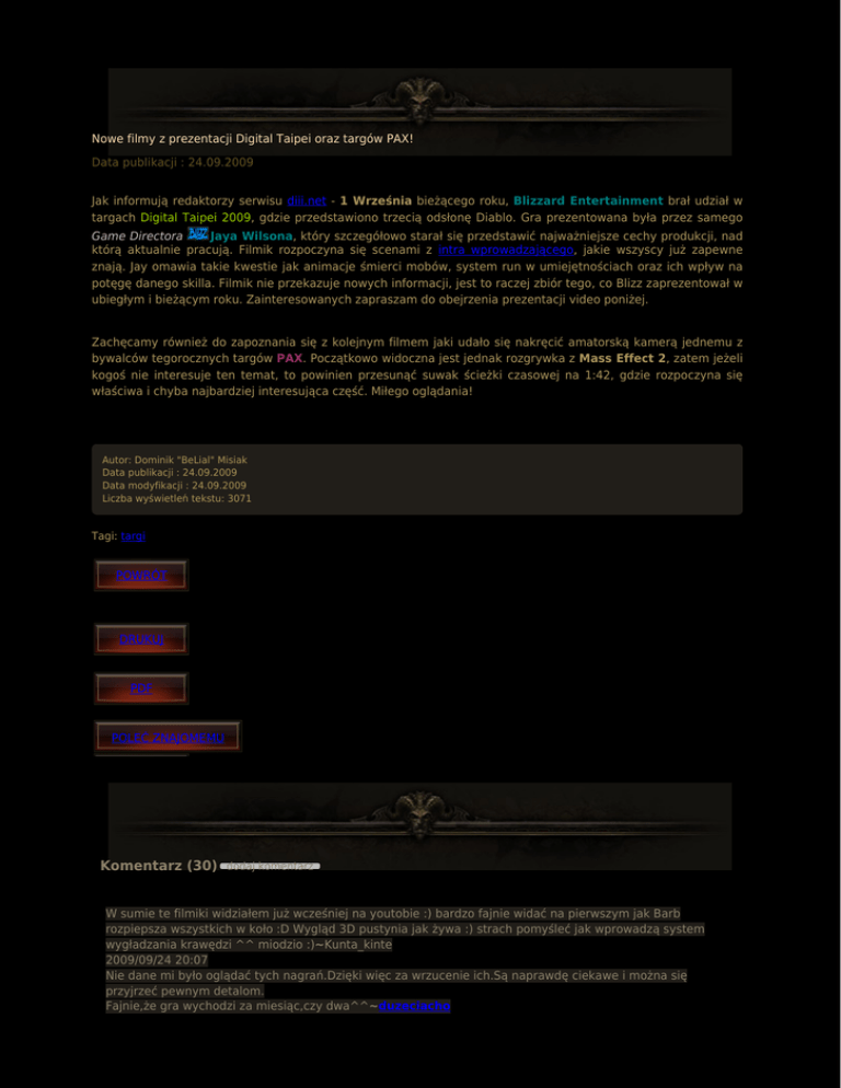 Nowe filmy z prezentacji Digital Taipei oraz targów PAX! Data publikacji : 24.09.2009 Jak informują redaktorzy serwisu diii.net - 1 Września bieżącego roku, Blizzard Entertainment brał udział w targach Digital Taipei 2009, gdzie przedstawiono trzecią odsłonę Diablo. Gra prezentowana była przez samego Game Directora Jaya Wilsona, który szczegółowo starał się przedstawić najważniejsze cechy produkcji, nad którą aktualnie pracują. Filmik rozpoczyna się scenami z intra wprowadzającego, jakie wszyscy już zapewne znają. Jay omawia takie kwestie jak animacje śmierci mobów, system run w umiejętnościach oraz ich wpływ na potęgę danego skilla. Filmik nie przekazuje nowych informacji, jest to raczej zbiór tego, co Blizz zaprezentował w ubiegłym i bieżącym roku. Zainteresowanych zapraszam do obejrzenia prezentacji video poniżej. Zachęcamy również do zapoznania się z kolejnym filmem jaki udało się nakręcić amatorską kamerą jednemu z bywalców tegorocznych targów PAX. Początkowo widoczna jest jednak rozgrywka z Mass Effect 2, zatem jeżeli kogoś nie interesuje ten temat, to powinien przesunąć suwak ścieżki czasowej na 1:42, gdzie rozpoczyna się właściwa i chyba najbardziej interesująca część. Miłego oglądania! Autor: Dominik "BeLial" Misiak Data publikacji : 24.09.2009 Data modyfikacji : 24.09.2009 Liczba wyświetleń tekstu: 3071 Tagi: targi POWRÓT DRUKUJ PDF POLEĆ ZNAJOMEMU Komentarz (30) dodaj komentarz W sumie te filmiki widziałem już wcześniej na youtobie :) bardzo fajnie widać na pierwszym jak Barb rozpiepsza wszystkich w koło :D Wygląd 3D pustynia jak żywa :) strach pomyśleć jak wprowadzą system wygładzania krawędzi ^^ miodzio :)~Kunta_kinte 2009/09/24 20:07 Nie dane mi było oglądać tych nagrań.Dzięki więc za wrzucenie ich.Są naprawdę ciekawe i można się przyjrzeć pewnym detalom. Fajnie,że gra wychodzi za miesiąc,czy dwa^^~duzeciacho 2009/09/24 21:04 Dwa tak, ale lata :P~Yab 2009/09/24 21:27 ~duzeciacho Za miesiąc albo dwa to moze wyjdzie 1.13 do diablo 2~SilenceR 2009/09/25 10:59 Zazdroszczę optymizmu :).~cin3k1989 2009/09/25 12:30 No jak nie za miesiąc/dwa,to z pewnością zasiądziemy przed Diablo 3 na gwiazdkę ^^~duzeciacho 2009/09/25 16:09 Niezłe poczucie humoru. Tak na poważnie to ja już mam DIII. 5 razy przeszedłem tą grę i to każdą postacią. W sumie nie była aż taka trudna do przejścia a wręcz trywialna.~Constantine 2009/09/25 16:32 A ja pracuje w Blizzardzie i właśnie skupiam się nad Diablo 4: Son of Diablo.~matava-se 2009/09/25 17:59 :O to może powiecie mi jak przejść bosa w DIII z act 3 bo się z nim męczę :) ^^~AKII 2009/09/25 20:32 Jak wchodzisz do podziemi ungabunga to na 4 lvl po lewej stronie jest pluszowy kroliczek jak go znajdziesz to odrazu cie przenosi do walki z tyraelem ;p~Riper 2009/09/25 20:43 Chyba wam się gry pomyliły :) TYRAEL jest 5 postacią grywalną :) W nowym Diabełku!!! p.s. Pozdro dla fanów Diabełka~ash 2009/09/25 21:41 co tez nuda potrafi z ludziami zrobic :)~niepoprawna 2009/09/26 07:58 Raczej będziemy w takim stanie aż do wyjścia Diabła.~Constantine 2009/09/26 11:20 za miech to risen wyjdzie ;] polecam na nim obecnie skupic swa uwage :d~weks 2009/09/27 12:10 E mia jakoś risen nie podchodzi ;/ Widziałem gameplaya na tvgry.pl I jakoś nie zaskakuje niczym a animacje sa ohydne ;/~Riper 2009/09/27 16:18 Czy trafił ktoś na jakiekolwiek wzmianki dotyczące ewentualnego rozmiaru gry? Ile aktów albo jaka wielkość w porównaniu z D2? Bo jak w 2012 roku dostane coś co przejde w dwa dni to się z letka wpiekle.~hellbert 2009/09/27 17:15 Tak, przejdziesz zapewne w 4 godziny i to wszystkimi postaciami na wszystkich poziomach.~matava-se 2009/09/27 17:39 Jak nie masz nic ciekawego do powiedzenia to nie mędrkuj trollu. Jak siadam do nowej gry to młuce do upadłego. LOKI w weekend zaliczyłem (pierwszy poziom trudności oczywiście). A od gry dłubanej od 2003 (ponoć) oczekuję kapke więcej. Masz coś w tym temacie? To dawaj. Nie masz? To siedź cicho.~hellbert 2009/09/27 17:43 Gdzieś w którymś wywiadzie, nie poweim ci w którym było że D3 będzie podobnej długości co D2. :)~PieNiu 2009/09/27 19:53 No i mi się wydaje że gdzieś take info czytałem. Ale ciągle mam nadzieję że to było dawno i w 2012 będzie nieprawdą. I uparcie szukam jakichś wypowiedzi z Blizza na ten temat, czy to w wywiadach (nikt chyba o to nie pyta) czy na oficjalnym forum... Nadzieja ponoć umiera ostatnia, ale że to matka;) ...~hellbert 2009/09/27 20:08 Ja gdzieś z kolei czytałem że ponoć mapy mają być nieco mniejsze niż w DII ale za to mają zawierać więcej atrakcji także na nude nie będziemy narzekać. Nie wydaje mi się że gra będzie krótka patrząc na ogrom pracy wkładany w tą gre wiem że takie smaczki jak losowe wydarzenia i qesty oraz inne rzeczy zapewnią nam naprawde długą rogrywke bez obawy panowie i panie ;)~Kunta_kinte 2009/09/27 20:19 Oczywiście mówiłem o długości aktów w rozumieniu misji głownych i przejściu gry po najmniejszej linii oporu. Uwzględniając misje poboczne, losowość ich i misje dla danej klasy oczywiście gra będzie o wiele dłuższa i mam nadzieje ciekawsza. O tym przekonamy się dopiero po premierze.~Pieniu 2009/09/27 20:36 @hellbert - Żebyś czasem nie narobił w gacie z wrażenia. Nie ma co się tak podniecać tematem. Skoro grałeś w D2 podejrzewam dość długo to myślę że nie trzeba spinać pośladów odnośnie D3. Jak jesteś taki najarany i siedzisz ze stoperem w ręku podczas gry to napisz może jakąś fajną gierkę (być może ja usiądę i sprawdzę jak długo mi zajmie przejście)~matava-se 2009/09/27 20:43 Ja teraz sobie zassysam anno 1701 bardzo ciekawa gireka chciałem 1404 ale braki sprzętowe mi uniemożliwiają grę . Jeżeli chcesz przejść to będziesz grac bardzo długo ze względu na szybkość rozgrywki w każdym anno ale imo gra godna polecenia ;p~Riper 2009/09/27