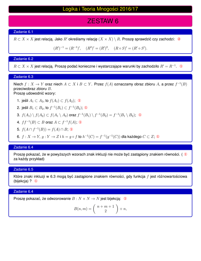 Logika i Teoria Mnogości 2016/17 ZESTAW 6 Zadanie 6.1 R ⊂ X × X jest relacja. ˛ Jako R0 określamy relacje˛ (X × X) \ R. Prosz˛e sprawdzić czy zachodzi: (R0 )−1 = (R−1 )0 , (R2 )0 = (R0 )2 , (R ◦ S)0 = (R0 ◦ S 0 ). Zadanie 6.2 R ⊂ X × X jest relacja. ˛ Prosz˛e podać konieczne i wystarczajace ˛ warunki by zachodziło R0 = R−1 . ¬ Zadanie 6.3 Niech f : X → Y oraz niech A ⊂ X i B ⊂ Y . Przez f (A) oznaczamy obraz zbioru A, a przez f −1 (B) przeciwobraz zbioru B . Prosz˛e udowodnić wzory: 1. jeśli A1 ⊂ A2 , to f (A1 ) ⊂ f (A2 ); ¬ 2. jeśli B1 ⊂ B2 , to f −1 (B1 ) ⊂ f −1 (B2 ); ¬ 3. f (A1 ) \ f (A2 ) ⊂ f (A1 \ A2 ) oraz f −1 (B1 ) \ f −1 (B2 ) = f −1 (B1 \ B2 ); ¬ 4. f f −1 (B) ⊂ B oraz A ⊂ f −1 f (A); ¬ 5. f (A ∩ f −1 (B)) = f (A) ∩ B ; ¬ 6. f : X → Y, g : Y → Z i h = g ◦ f to h−1 (C) = f −1 (g −1 (C)) dla każdego C ⊂ Z ; ¬ Zadanie 6.4 Prosz˛e pokazać, że w powyższych wzorach znak inkluzji nie może być zastapiony ˛ znakiem równości. ( ¬ za każdy przykład) Zadanie 6.5 Które znaki inkluzji w 6.3 moga˛ być zastapione ˛ znakiem równości, gdy funkcja f jest różnowartościowa (bijekcja) ? ¬ Zadanie 6.4 Prosz˛e pokazać, że odwzorowanie B : N × N → N jest bijekcja: ˛ ¬ B(n, m) = n+m+1 2 + n,