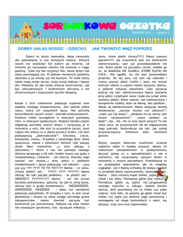 SORBONKOWA GAZETKA GRUDZIEŃ 2013 | Wydanie 2 DOBRY UKŁAD RODZIC – DZIECKO. ROZMOWĘ. Dzieci to istoty niezwykłe. Mają niezwykły dar pobudzania w nas skrajnych emocji, których nawet nie znaliśmy! Od euforii po histerię, od śmiechu po wyrywanie włosów lub siwienie w ciągu godziny. Tylko my tak czujemy? Nie, nasze dzieci tak samo postrzegają nas. W jednym momencie jesteśmy ukochani a za chwilę już nie-kochani. Te małe istoty także mają swoje nerwy, mają swoje słabsze i lepsze dni. Pokażmy im jak swoje emocje kontrolować, jak być zdecydowanym i konkretnym altruistą a nie sfrustrowanym i zmęczonym życiem despotą. Każde z nich codziennie pokazuje zupełnie inne aspekty swojego temperamentu. Jest jednak jedna rzecz, która ich wszystkich łączy. Nie potrafią komunikować swoich uczuć i potrzeb emocjonalnych. Problem widać szczególnie w relacjach pomiędzy nimi, w relacjach społecznych. Rodzice bardzo często odgadują potrzeby swoich dzieci i wyręczają je w mówieniu o nich. Nie jest to oczywiście zarzut, sami często nie wiemy co w danej sytuacji zrobić, coś nam podszeptują „doświadczone”: teściowa, ciocia, koleżanka, mama… Przykład z ostatniego dnia: sklep spożywczy, mama z dzieckiem 3letnim robi zakupy (dużo Mam westchnie: „o Jezu zakupy z dzieckiem…”- która z nas nie pamięta naszego dziecka jęczącego o tik taki, kinder bueno czy jajko z niespodzianką…).Dziecko - Jaś sterczy (inaczej tego nazwać nie można…) przy półce z płatkami śniadaniowymi i jęczy pokazując coś palcem: - yyyy yyy yyy YYY YYYY TO TO TO!!!!!!! Mama: - co Jasiu, chcesz płatki? Jaś: - YYYYY YYYY YYYY!!!! Mama (biorąc do ręki paczkę płatków): - te płatki? Jaś: NIEEEEE!!! YYYYYY!!!!!! Mama: - te? Jaś (coraz bardziej poirytowany, spocony, bo jak to zimą bywa, ubrany jest w gruby kombinezon): - NIEEEEEEEEEE, NIIEEEEEEEE, NIEEEEEEE – i dalej coś namiętnie pokazuje paluszkiem. W związku z tym, iż jest coraz głośniejszy i skupia na sobie uwagę szerszego grona zakupowiczów, mama również zaczyna być konkretnie już poirytowana. Odzywa się więc tonem nie znoszącym sprzeciwu, tzw. syczącym miłością : - JAK TWORZYĆ WIĘŹ POPRZEZ Jasiu, które płatki chcesz??!!!! Pokaż mamusi palcem!!!!! Jaś oczywiście jest już konkretnie zdenerwowany, sam już prawdopodobnie nie wie, które płatki na początku chciał, rozbiło go to, że MAMUSIA NIE ZGADŁA, KTÓRE PŁATKI ON CHCE… Nie zgadła, bo nie jest jasnowidzem przecież. Do tej pory coś tam się udawało i mama zawsze jakoś trafiła i Jasiu nie musiał kończyć zdania a czasem nawet zaczynać zdania, a jedynie wskazać paluchem. Cała sytuacja kończy się tak: zdenerwowana Mama zostawia przy półce z płatkami Jasia i każe mu wziąć sobie samemu płatki, które wybrał. Jaś rozzłoszczony i kompletnie rozbity idzie za Mamą, bez płatków… Oboje są zdenerwowani, Mama zasypuje lawiną komentarzy: „zawsze musisz coś odstawić”, „mam już Cię dosyć”, „działasz mi na nerwy tym swoim zachowaniem”, „masz szlaban na bajki”…itp., itd… Po co tyle złych emocji? To nie Jasia wina, że przyzwyczaił się do odgadywania Jego potrzeb. Komunikuje się tak, jak został przyzwyczajony: minimum słów, minimum gestów. Dajmy naszym dzieciom możliwość uczenia radzenia sobie w każdej sytuacji, dajmy im maksimum samodzielności w podejmowaniu decyzji (piszę tu o samodzielności a nie o wolności), nie wyręczajmy naszych dzieci w mówieniu o swoich potrzebach. Przedstawię to na przykładzie poprzednim jak to mogłoby wyglądać. Jaś z Mamą wchodzą do sklepu (podam tu przykład Mamy zapracowanej, spieszącej się). Mama: - Jasiu musimy kupić mleko, jajka, mąkę, chleb i ser żółty. Pamiętasz gdzie jest mleko?... Pamiętasz gdzie są jajka? itd…(angażujemy naszego malucha w zakupy, będzie bardzo dumny, jeśli pozwolimy mu to mleko czy jajka wybrać. Sam fakt, że pytamy go gdzie może być mleko czy jajka już podnosi jego samoocenę i wymagamy od niego komunikacji z nami, my pytamy, więc ono musi odpowiadać. BIULETYN RODZINNY Dajmy naszym dzieciom możliwość uczenia radzenia sobie w każdej sytuacji, dajmy im maksimum samodzielności w podejmowaniu decyzji (piszę tu o samodzielności a nie o wolności), nie wyręczajmy naszych dzieci w mówieniu o swoich potrzebach. Przedstawię to na przykładzie poprzednim jak to mogłoby wyglądać. Jaś z Mamą wchodzą do sklepu (podam tu przykład Mamy zapracowanej, spieszącej się). Mama: - Jasiu musimy kupić mleko, jajka, mąkę, chleb i ser żółty. Pamiętasz gdzie jest mleko?... Pamiętasz gdzie są jajka? itd…(angażujemy naszego malucha w zakupy, będzie bardzo dumny, jeśli pozwolimy mu to mleko czy jajka wybrać. Sam fakt, że pytamy go gdzie może być mleko czy jajka już podnosi jego samoocenę i wymagamy od niego komunikacji z nami, my pytamy, więc ono musi odpowiadać. Czasem dziecko w wieku 3 lat słabo mówi, taka zabawa pomoże mu w łączeniu nazw, które słyszy z konkretami – wyraz „mleko” z tym, konkretnym mlekiem) starsze dzieci możemy zaangażować w liczenie listy zakupów (na moją 7letnia córkę najlepiej np. działa kartka z zakupami, ma swój ołóweczek i odhacza każdy zakup, który najczęściej sama wkłada do koszyka, liczy też rzeczy zakupione, robi zbiory, itp, itd..) Zatrzymajmy się jednak na momencie, kiedy Jasiu zatrzymał się już przy półce z płatkami śniadaniowymi (jeżeli nie możemy ich kupić, konkretnie bez proszącego tonu, czy pytającego tonu – bo to też częste: „mogę ci dziś tego nie kupić?...”, mówimy dziecku, że mamy dziś za mało pieniędzy na to i umówmy się, że następnym razem kupimy, lub, że w domu są jeszcze płatki, lub, że możemy kupić coś mniejszego, np. wafelek tańszy, guma rozpuszczalna. Mówimy do dziecka spokojnym, ale zdystansowanym głosem. Dziecko oczywiście może się upierać przy płatka
