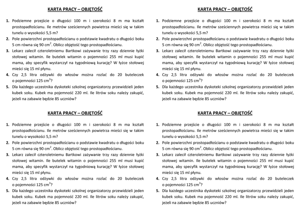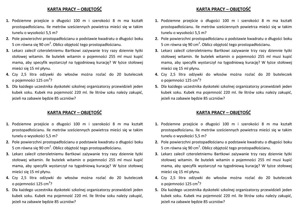 KARTA PRACY – OBJĘTOŚĆ KARTA PRACY – OBJĘTOŚĆ 1. Podziemne przejście o długości 100 m i szerokości 8 m ma kształt prostopadłościanu. Ile metrów sześciennych powietrza mieści się w takim tunelu o wysokości 5,5 m? 2. Pole powierzchni prostopadłościanu o podstawie kwadratu o długości boku 5 cm równa się 90 cm2. Oblicz objętość tego prostopadłościanu. 3. Lekarz zalecił czteroletniemu Bartkowi zażywanie trzy razy dziennie łyżki stołowej witamin. Ile butelek witamin o pojemności 255 ml musi kupić mama, aby specyfik wystarczył na tygodniową kurację? W łyżce stołowej mieści się 15 ml płynu. 4. Czy 2,5 litra odżywki do włosów można rozlać do 20 buteleczek o pojemności 125 cm3? 5. Dla każdego uczestnika dyskoteki szkolnej organizatorzy przewidzieli jeden kubek soku. Kubek ma pojemność 220 ml. Ile litrów soku należy zakupić, jeżeli na zabawie będzie 85 uczniów? 1. Podziemne przejście o długości 100 m i szerokości 8 m ma kształt prostopadłościanu. Ile metrów sześciennych powietrza mieści się w takim tunelu o wysokości 5,5 m? 2. Pole powierzchni prostopadłościanu o podstawie kwadratu o długości boku 5 cm równa się 90 cm2. Oblicz objętość tego prostopadłościanu. 3. Lekarz zalecił czteroletniemu Bartkowi zażywanie trzy razy dziennie łyżki stołowej witamin. Ile butelek witamin o pojemności 255 ml musi kupić mama, aby specyfik wystarczył na tygodniową kurację? W łyżce stołowej mieści się 15 ml płynu. 4. Czy 2,5 litra odżywki do włosów można rozlać do 20 buteleczek o pojemności 125 cm3? 5. Dla każdego uczestnika dyskoteki szkolnej organizatorzy przewidzieli jeden kubek soku. Kubek ma pojemność 220 ml. Ile litrów soku należy zakupić, jeżeli na zabawie będzie 85 uczniów? KARTA PRACY – OBJĘTOŚĆ KARTA PRACY – OBJĘTOŚĆ 1. Podziemne przejście o długości 100 m i szerokości 8 m ma kształt prostopadłościanu. Ile metrów sześciennych powietrza mieści się w takim tunelu o wysokości 5,5 m? 2. Pole powierzchni prostopadłościanu o podstawie kwadratu o długości boku 5 cm równa się 90 cm2. Oblicz objętość tego prostopadłościanu. 3. Lekarz zalecił czteroletniemu Bartkowi zażywanie trzy razy dziennie łyżki stołowej witamin. Ile butelek witamin o pojemności 255 ml musi kupić mama, aby specyfik wystarczył na tygodniową kurację? W łyżce stołowej mieści się 15 ml płynu. 4. Czy 2,5 litra odżywki do włosów można rozlać do 20 buteleczek o pojemności 125 cm3? 5. Dla każdego uczestnika dyskoteki szkolnej organizatorzy przewidzieli jeden kubek soku. Kubek ma pojemność 220 ml. Ile litrów soku należy zakupić, jeżeli na zabawie będzie 85 uczniów? 1. Podziemne przejście o długości 100 m i szerokości 8 m ma kształt prostopadłościanu. Ile metrów sześciennych powietrza mieści się w takim tunelu o wysokości 5,5 m? 2. Pole powierzchni prostopadłościanu o podstawie kwadratu o długości boku 5 cm równa się 90 cm2. Oblicz objętość tego prostopadłościanu. 3. Lekarz zalecił czteroletniemu Bartkowi zażywanie trzy razy dziennie łyżki stołowej witamin. Ile butelek witamin o pojemności 255 ml musi kupić mama, aby specyfik wystarczył na tygodniową kurację? W łyżce stołowej mieści się 15 ml płynu. 4. Czy 2,5 litra odżywki do włosów można rozlać do 20 buteleczek o pojemności 125 cm3? 5. Dla każdego uczestnika dyskoteki szkolnej organizatorzy przewidzieli jeden kubek soku. Kubek ma pojemność 220 ml. Ile litrów soku należy zakupić, jeżeli na zabawie będzie 85 uczniów?