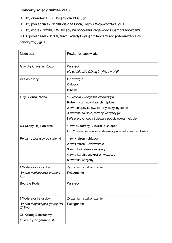 Koncerty kolęd grudzień 2016 15.12, czwartek 16:00, kolędy dla PGiE, gr. I 19.12, poniedziałek, 15:00 Zielona Góra, Sejmik Województwa, gr. I 20.12, wtorek, 12:00, UW, kolędy na spotkaniu Wojewody z Samorządowcami 9.01, poniedziałek 12:00, teatr, kolędy+występ z tańcami (do potwierdzenia co tańczymy) , gr. I Moderator Powitanie, zapowiedź Gdy Się Chrystus Rodzi Wszyscy Na podkładzie CD są 2 tylko zwrotki! W żłobie leży Dziewczęta Chłopcy Razem Gdy Śliczna Panna 1 Zwrotka - wszystkie dziewczęta Refren - dz - wokaliza, ch - śpiew 2 zwr chłopcy spiew, refreny wszyscy spiew 3 zwrotka solistka, refreny wszyscy jw ! Wszyscy chłopcy śpiewają podstawową melodię Do Szopy Hej Pasterze 1 zwrt+2 refreny+2 zwrotka chłopcy Od 2 refrenów wszyscy, dziewczęta w refrenach wokaliza Pójdźmy wszyscy do stajenki 1 zwr+refren - chłopcy 2 zwr+refren - dziewczęta 3 zwrotka+refren - wszyscy 4 zwrotka chłopcy+refren wszyscy 5 zwrotka wszyscy ! Moderator i 2 osoby Życzenia na zakończenie W tym miejscu jeśli gramy z CD Pożegnanie Bóg Się Rodzi Wszyscy ! Moderator i 2 osoby Życzenia na zakończenie W tym miejscu jeśli gramy NA ŻYWO Pożegnanie Za Kolędę Dziękujemy ! nie ma jeśli gramy z CD