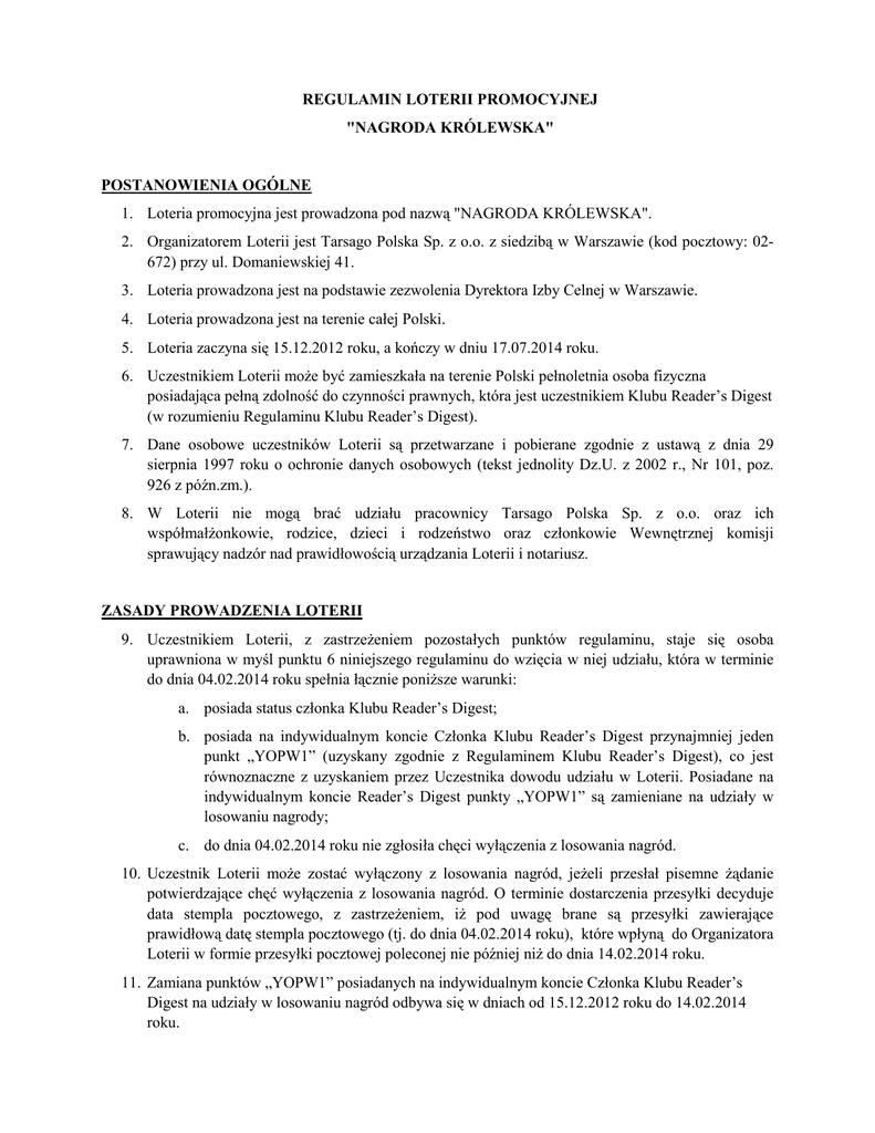 REGULAMIN LOTERII PROMOCYJNEJ "NAGRODA KRÓLEWSKA" POSTANOWIENIA OGÓLNE 1. Loteria promocyjna jest prowadzona pod nazwą "NAGRODA KRÓLEWSKA". 2. Organizatorem Loterii jest Tarsago Polska Sp. z o.o. z siedzibą w Warszawie (kod pocztowy: 02672) przy ul. Domaniewskiej 41. 3. Loteria prowadzona jest na podstawie zezwolenia Dyrektora Izby Celnej w Warszawie. 4. Loteria prowadzona jest na terenie całej Polski. 5. Loteria zaczyna się 15.12.2012 roku, a kończy w dniu 17.07.2014 roku. 6. Uczestnikiem Loterii moŜe być zamieszkała na terenie Polski pełnoletnia osoba fizyczna posiadająca pełną zdolność do czynności prawnych, która jest uczestnikiem Klubu Reader’s Digest (w rozumieniu Regulaminu Klubu Reader’s Digest). 7. Dane osobowe uczestników Loterii są przetwarzane i pobierane zgodnie z ustawą z dnia 29 sierpnia 1997 roku o ochronie danych osobowych (tekst jednolity Dz.U. z 2002 r., Nr 101, poz. 926 z późn.zm.). 8. W Loterii nie mogą brać udziału pracownicy Tarsago Polska Sp. z o.o. oraz ich współmałŜonkowie, rodzice, dzieci i rodzeństwo oraz członkowie Wewnętrznej komisji sprawujący nadzór nad prawidłowością urządzania Loterii i notariusz. ZASADY PROWADZENIA LOTERII 9. Uczestnikiem Loterii, z zastrzeŜeniem pozostałych punktów regulaminu, staje się osoba uprawniona w myśl punktu 6 niniejszego regulaminu do wzięcia w niej udziału, która w terminie do dnia 04.02.2014 roku spełnia łącznie poniŜsze warunki: a. posiada status członka Klubu Reader’s Digest; b. posiada na indywidualnym koncie Członka Klubu Reader’s Digest przynajmniej jeden punkt „YOPW1” (uzyskany zgodnie z Regulaminem Klubu Reader’s Digest), co jest równoznaczne z uzyskaniem przez Uczestnika dowodu udziału w Loterii. Posiadane na indywidualnym koncie Reader’s Digest punkty „YOPW1” są zamieniane na udziały w losowaniu nagrody; c. do dnia 04.02.2014 roku nie zgłosiła chęci wyłączenia z losowania nagród. 10. Uczestnik Loterii moŜe zostać wyłączony z losowania nagród, jeŜeli przesłał pisemne Ŝądanie potwierdzające chęć wyłączenia z losowania nagród. O terminie dostarczenia przesyłki decyduje data stempla pocztowego, z zastrzeŜeniem, iŜ pod uwagę brane są przesyłki zawierające prawidłową datę stempla pocztowego (tj. do dnia 04.02.2014 roku), które wpłyną do Organizatora Loterii w formie przesyłki pocztowej poleconej nie później niŜ do dnia 14.02.2014 roku. 11. Zamiana punktów „YOPW1” posiadanych na indywidualnym koncie Członka Klubu Reader’s Digest na udziały w losowaniu nagród odbywa się w dniach od 15.12.2012 roku do 14.02.2014 roku. NAGRODY 12. W Loterii przewidziane są nagrody o następujących wartościach: a. Nagroda Główna - jedna nagroda pienięŜna o wartości 70.000 zł; b. Nagroda Premia - jedna nagroda pienięŜna o wartości do kwoty 10.000 zł. 13. Maksymalna wartość puli nagród w Loterii wynosi 80.000 zł brutto. 14. Zwycięzcom nagród nie przysługuje prawo do zastrzeŜenia szczególnych właściwości nagrody. LOSOWANIE NAGRÓD 15. Jeden punkt „YOPW1” posiadany na indywidualnym koncie Członka Klubu Reader’s Digest zamieniany jest na jeden udział w losowaniu Nagrody Głównej. 16. Losowanie Nagrody Głównej jest przeprowadzane w siedzibie Organizatora w dniu 19.02.2014 roku. Dodatkowo podczas losowania, oprócz Zwycięzcy losowany jest równieŜ Zwycięzca Zapasowy. Losowanie odbywa się za pomocą systemu komputerowego. Losowanie odbywa się za pomocą systemu komputerowego, tj. w programie informatycznym pn. LOTERIA.EXA. ZASADY PRZYZNAWANIA NAGRODY PREMII 17. Nagroda Premia jest przyznawana odpowiednio Zwycięzcy Nagrody Głównej, jeŜeli udział Zwycięzcy, którego wylosowano, posiada przyporządkowany punkt premia „YOPW1” przydzielony zgodnie z Regulaminem Klubu Reader’s Digest do dnia 04.02.2014 roku. 18. Nagroda Premia jest przyznawana w siedzibie Organizatora najpóźniej do dnia 19.02.2014 roku. 19. Nagroda Premia jest przyznawana w wysokości odpowiadającej posiadanemu przez Zwycięzcę Nagrody Głównej, rodzajowi punktu premia „YOPW1” wg poniŜszego schematu: Lp. Rodzaj posiadanego punktu premia „YOPW1” Wysokość Nagrody Premia 1 Punkt premia niebieski „YOPW1” 5.000 zł 2 Punkt premia czerwony „YOPW1” 6.000 zł 3 Punkt premia zielony „YOPW1” 7.000 zł 4 Punkt premia brązowy „YOPW1” 8.000 zł 5 Punkt premia srebrny „YOPW1” 9.000 zł 6 Punkt premia złoty „YOPW1” 10.000 zł Przykładowo: JeŜeli okaŜe się, Ŝe Zwycięzca Nagrody Głównej posiada przyporządkowany zgodnie z Regulaminem Klubu Reader’s Digest punkt premia „YOPW1” czerwony, wówczas Zwycięzca oprócz Nagrody Głównej otrzymuje nagrodę pienięŜną w wysokości 6.000 zł. Łączna wartość nagrody w Loterii wynosi 76.000 zł. Zwycięzca Nagrody Głównej moŜe mieć przyporządkowany tylko jeden rodzaj (niebieski lub czerwony lub zielony itd.) punktu premia „YOPW1” według powyŜszej tabeli określonej w pkt 19 regulaminu. 20. Warunkiem koniecznym otrzymania Nagrody Premia jest fakt by zwycięski udział w losowaniu Nagrody Głównej miał przyporządkowany punkt premia „YOPW1”. INFORMACJA O NAGRODACH I WYDAWANIE NAGRÓD 21. Zwycięzca jest powiadamiany o wygranej listem poleconym wysłanym na adres znajdujący się w bazie danych Członków Klubu Reader’s Digest do dnia 07.03.2014 roku. 22. Zwycięzca zobowiązany jest dostarczyć (przesyłką pocztową lub kurierską lub osobiście lub faksem) dane swojego konta bankowego wraz z pisemnym oświadczeniem, Ŝe nie naleŜy do grona osób wyłączonych z Loterii, które wskazane są w pkt 8 regulaminu na adres Organizatora: Tarsago Polska Sp. z o.o. ul. Domaniewska 41, 02-672 Warszawa lub na numer faksu Organizatora wskazany w zawiadomieniu do dnia 17.03.2014 roku. O dochowaniu terminu dostarczenia przesyłki decyduje: a. w przypadku przesyłki pocztowej lub kurierskiej data nadania, z zastrzeŜeniem, 