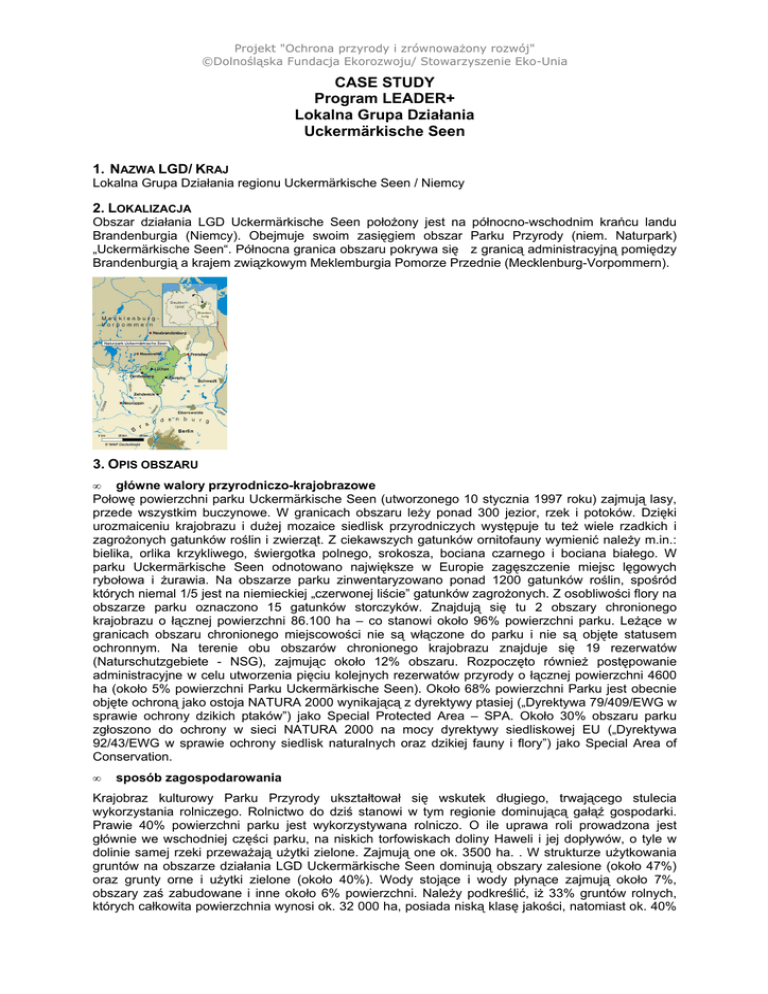 Projekt "Ochrona przyrody i zrównoważony rozwój" ©Dolnośląska Fundacja Ekorozwoju/ Stowarzyszenie Eko-Unia CASE STUDY Program LEADER+ Lokalna Grupa Działania Uckermärkische Seen 1. NAZWA LGD/ KRAJ Lokalna Grupa Działania regionu Uckermärkische Seen / Niemcy 2. LOKALIZACJA Obszar działania LGD Uckermärkische Seen położony jest na północno-wschodnim krańcu landu Brandenburgia (Niemcy). Obejmuje swoim zasięgiem obszar Parku Przyrody (niem. Naturpark) „Uckermärkische Seen“. Północna granica obszaru pokrywa się z granicą administracyjną pomiędzy Brandenburgią a krajem związkowym Meklemburgia Pomorze Przednie (Mecklenburg-Vorpommern). 3. OPIS OBSZARU • główne walory przyrodniczo-krajobrazowe Połowę powierzchni parku Uckermärkische Seen (utworzonego 10 stycznia 1997 roku) zajmują lasy, przede wszystkim buczynowe. W granicach obszaru leży ponad 300 jezior, rzek i potoków. Dzięki urozmaiceniu krajobrazu i dużej mozaice siedlisk przyrodniczych występuje tu też wiele rzadkich i zagrożonych gatunków roślin i zwierząt. Z ciekawszych gatunków ornitofauny wymienić należy m.in.: bielika, orlika krzykliwego, świergotka polnego, srokosza, bociana czarnego i bociana białego. W parku Uckermärkische Seen odnotowano największe w Europie zagęszczenie miejsc lęgowych rybołowa i żurawia. Na obszarze parku zinwentaryzowano ponad 1200 gatunków roślin, spośród których niemal 1/5 jest na niemieckiej „czerwonej liście” gatunków zagrożonych. Z osobliwości flory na obszarze parku oznaczono 15 gatunków storczyków. Znajdują się tu 2 obszary chronionego krajobrazu o łącznej powierzchni 86.100 ha – co stanowi około 96% powierzchni parku. Leżące w granicach obszaru chronionego miejscowości nie są włączone do parku i nie są objęte statusem ochronnym. Na terenie obu obszarów chronionego krajobrazu znajduje się 19 rezerwatów (Naturschutzgebiete - NSG), zajmując około 12% obszaru. Rozpoczęto również postępowanie administracyjne w celu utworzenia pięciu kolejnych rezerwatów przyrody o łącznej powierzchni 4600 ha (około 5% powierzchni Parku Uckermärkische Seen). Około 68% powierzchni Parku jest obecnie objęte ochroną jako ostoja NATURA 2000 wynikającą z dyrektywy ptasiej („Dyrektywa 79/409/EWG w sprawie ochrony dzikich ptaków”) jako Special Protected Area – SPA. Około 30% obszaru parku zgłoszono do ochrony w sieci NATURA 2000 na mocy dyrektywy siedliskowej EU („Dyrektywa 92/43/EWG w sprawie ochrony siedlisk naturalnych oraz dzikiej fauny i flory”) jako Special Area of Conservation. • sposób zagospodarowania Krajobraz kulturowy Parku Przyrody ukształtował się wskutek długiego, trwającego stulecia wykorzystania rolniczego. Rolnictwo do dziś stanowi w tym regionie dominującą gałąź gospodarki. Prawie 40% powierzchni parku jest wykorzystywana rolniczo. O ile uprawa roli prowadzona jest głównie we wschodniej części parku, na niskich torfowiskach doliny Haweli i jej dopływów, o tyle w dolinie samej rzeki przeważają użytki zielone. Zajmują one ok. 3500 ha. . W strukturze użytkowania gruntów na obszarze działania LGD Uckermärkische Seen dominują obszary zalesione (około 47%) oraz grunty orne i użytki zielone (około 40%). Wody stojące i wody płynące zajmują około 7%, obszary zaś zabudowane i inne około 6% powierzchni. Należy podkreślić, iż 33% gruntów rolnych, których całkowita powierzchnia wynosi ok. 32 000 ha, posiada niską klasę jakości, natomiast ok. 40% Projekt "Ochrona przyrody i zrównoważony rozwój" ©Dolnośląska Fundacja Ekorozwoju/ Stowarzyszenie Eko-Unia gruntów posiada średnią klasę jakości. Tym samym ponad połowa tego regionu według definicji UE jest obszarem o niekorzystnych warunkach gospodarowania. • uwarunkowania społeczno-gospodarcze obszaru Gęstość zaludnienia regionu należy do najniższych w Niemczech i wynosi 22 osoby/km2. Od momentu ponownego zjednoczenia Niemiec (1989/90) można zaobserwować stałe i silne zmniejszanie się liczby ludności. W okręgu Uckermark, podobnie jak na obszarze Parku Przyrody Uckermärkische Seen, prognozuje się że udział dzieci i młodzieży zmniejszy się do roku 2015 o 33-50 % do roku 1995, natomiast udział potencjalnych osób zatrudnionych/zdolnych do pracy zmniejszy się o ok. 25%. Do tego oczekuje się wzrostu udziału osób w wieku starszym niż 65 lat o ok. 25-30%. 4. OPIS PARTNERSTWA LGD • historia LGD Lokalna Grupa Działania (niem. Lokale Aktionsgruppe, LAG) regionu Uckermärkische Seen powstała 21 stycznia 2000 roku. Jej powstanie poprzedziła seria warsztatów lokalnych, które przeprowadzono w latach 1998-1999. Podczas warsztatów, które związały i zaktywizowały partnerów zainteresowanych rozwojem regionu, opracowano wspólną wizję rozwoju obszaru Uckermärkische Seen, przeprowadzono analizę SWOT dla regionu oraz opracowano kryteria wyboru projektów. Po założeniu Lokalnej Grupy Działania (LGD), od stycznia 2000 roku, rozpoczęto przygotowania „Strategii rozwoju regionalnego (koncepcja)”. Prace nad nią ukończono w marcu 2001 roku. W marcu 2002 Lokalna Grupa Działania wygrała konkurs LEADER+. • zarządzanie LGD Jednostką zarządzająca funduszami funduszami Leader + jest Towarzystwo FeldbergUckermärkische Seenlandschaft e.V. Prace Lokalnej Grupy Działania koordynuje Zarząd Parku Przyrody wspólnie z WWF Niemcy. W celu konsultacji regionalnych powołano Forum Regionalne. Członkami Lokalnej Grupy Roboczej są przedsiębiorstwa, stowarzyszenia, związki celowe, instytucje i urzędy, których działalność została zarejestrowana w tym regionie. Obecnie do Grupy Roboczej należy 71 instytucji, stowarzyszeń, przedsiębiorców i gmin. LGD spotyka się minimalnie 4 razy w roku. • cele i strategia LGD Wypracowana przez LGD Uckermärkische Seen strategia rozwoju obszaru ustanawia następujące cele: • integracja celów ochrony przyrody z innymi dziedzinami gospo