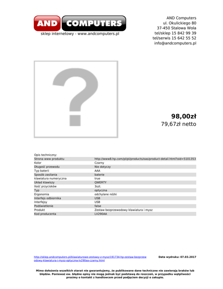 sklep internetowy - www.andcomputers.pl AND Computers ul. Okulickiego 80 37-450 Stalowa Wola tel/sklep 15 842 99 39 tel/serwis 15 642 55 52 [email protected] 98,00zł 79,67zł netto Opis techniczny: Strona www produktu Kolor Długość przewodu Typ baterii Sposób zasilania klawiatura numeryczna Układ klawiszy Ilość przycisków Typ Ergonomia Interfejs odbiornika Interfejsy Podświetlenie Produkt Kod producenta http://www8.hp.com/pl/pl/products/oas/product-detail.html?oid=5101353 Czarny Nie dotyczy AAA baterie true QWERTY 3szt. optyczna odchylane nóżki USB USB false Zestaw bezprzewodowy klawiatura i mysz LV290AA http://sklep.andcomputers.pl/klawiaturowe-zestawy-z-mysz/191734-hp-zestaw-bezprzew odowy-klawiatura-i-mysz-optyczna-lv290aa-czarny.html Data wydruku: 07.03.2017 Mimo dołożenia wszelkich starań nie gwarantujemy, że publikowane dane techniczne nie zawierają braków lub błędów. Ponieważ ew. błędne opisy nie mogą jednak być podstawą do roszczeń, w przypadku wątpliwości prosimy o kontakt z handlowcem przed podjęciem decyzji o zakupie.