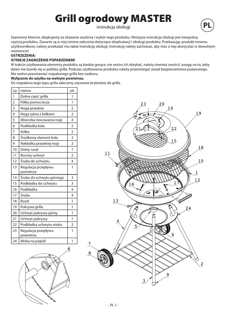 Grill ogrodowy MASTER instrukcja obsługi Zahradní gril MASTER Zahradní gril MASTER PL CZ Szanowny kliencie, dziękujemy za okazanie zaufania i wybór tego produktu. Niniejsza instrukcja obsługi jest integralną CZ návodeksploatacji k použití i obsługi produktu. Przekazując produkt innemu częścią produktu. Zawarte są w niej istotne zalecenia dotyczące Vážení zákazníci, użytkownikowi, należy przekazać mu także instrukcję obsługi. Instrukcję należy zachować, aby móc z niej skorzystać w dowolnym návod k použití děkujeme Vám za Vaši důvěru, kterou jste nám projevili nákupem tohoto výrobku. Tento návod k obsluze je součástí výrobku. momencie! Vážení zákazníci, Obsahuje důležité pokyny k uvedení výrobku do provozu a k jeho obsluze. Jestliže výrobek předáte jiným osobám, dbejte na to, OSTRZEŻENIA: děkujeme za Vaši idůvěru, kterouPonechejte jste nám projevili tohoto výrobku. Tento návod k obsluze abyste jimVám odevzdali tento návod. si tentonákupem návod, abyste si jej mohli znovu kdykoliv přečíst! je součástí výrobku. ISTNIEJE ZAGROŻENIE POPARZENIEM! Obsahuje důležité pokyny k uvedení výrobku do provozu a k jeho obsluze. Jestliže výrobek předáte jiným osobám, dbejte na to, W trakcie użytkowania produktu są bardzo gorące, wolno ichmohli dotykać, należy również zwrócić uwagę na to, żeby abyste jim odevzdali elementy i tento návod. Ponechejte si tento návod,nie abyste si jej znovu kdykoliv přečíst! VAROVÁNÍ: dzieci nie bawiły się w pobliżu grilla. Podczas użytkowania produktu należy przestrzegać zasad bezpieczeństwa pożarowego. NEBEZPEČÍ POPÁLENÍ! NieVAROVÁNÍ: wolno pozostawiać rozpalonego grilla bez nadzoru. Při používání jsou části grilu velmi horké, nedotýkejte se jich a nedovolte dětem pohybovat se v blízkosti grilu. Při používání výWyłącznie do użytku na wolnym NEBEZPEČÍ POPÁLENÍ! robku dodržujte zásady požární powietrzu. bezpečnosti. Gril nenechávejte během používání bez dozoru. používání jsou části grilu velmi horké, nedotýkejte se jich ado nedovolte Do Při rozpalania tego typu grilla zalecamy używanie brykietów grilla. dětem pohybovat se v blízkosti grilu. Při používání výPouze pro venkovní použití. robku dodržujte zásady požární bezpečnosti. Gril nenechávejte Pro tento typ grilu doporučujeme používat grilovací brikety. během používání bez dozoru. Lp.Pouze nazwa pro venkovní použití. szt. tento typ grilu doporučujeme používat grilovací brikety. 1 Pročíslo Dolna część grilla 1 název ks 2 Półka pomocnicza 1 Dno grillu číslo název 3 Noga przednia rošt 2 Odkládací 1 Dno grillu 4 Noga tylnia znohy kółkiem 3 Přední 2 Odkládací rošt 5 Miseczka mocowania nogi 4 Zadní nohy s kolečky 3 Přední nohy 6 Podkładka 5 Držákykoła nohou 4 Zadní nohy s kolečky 7 Kółko 6 Podložka kola 5 Držáky nohou 7 Kola element koła 8 6Środkowy Podložka kola 8 Matka kola 9 7Nakładka przedniej nogi Kola 9 Záslepka přední nohy 10 8Dolny rusztkola Matka 10 Spodní rošt 11 9Boczny uchwyt Záslepka přední nohy 11 Boční madla 12 10 Śruba do uchwytu Spodní rošt 12 Šrouby madla 13 11 Regulacja przepływu Boční madla 13 Regulace vzduchu powietrza 12 Šrouby madla 14 Šrouby madlagórnego víka 14 13 Śruba do uchwytu Regulace vzduchu 15 Podložky madlo víka 15 14 Podkładka uchwytu Šroubydo madla víka 16 Podložky 16 15 Podkładka Podložky madlo víka 17 Šrouby 17 16 Śruba Podložky 18 Grilovací rošt 18 17 RusztŠrouby 19 Víko grilu 18 Grilovací 19 Pokrywa grillarošt 20 Madlo horního víka Víkopokrywy grilu 20 19 Uchwyt górny 21 Držák víka Madlo horního víka 21 20 Uchwyt pokrywy 22 Podložka madla víka 21 Držák víka 22 Podkładka uchwytu wieka 23 Regulace odvětrání Podložka madla víka 23 22 Regulacja przepływu 24 Miska na popel 23 Regulace odvětrání powietrza Miska na popel 24 24 Miska na popiół 11 ks 12 1 22 1 24 2 42 2 22 4 2 22 2 22 2 21 1 22 2 14 41 2 1 4 3 13 33 3 4 34 4 44 1 41 1 11 1 11 1 11 2 12 1 21 1 1 161 6 23 23 20 20 14 19 14 21 19 22 21 22 15 18 15 11 18 10 11 10 1 112 17 16 12 17 16 13 24 13 4 4 24 5 5 6 6 7 78 8 2 K OH O K OH O 3 3 CZ -1- - PL 1 CZ -1- 9 2 9 Aktuální verzi návodu v elektronické podobě najdete na www.tvproducts.cz Aktuální verzi návodu v elektronické podobě najdete na www.tvproducts.cz MONTAŻ Montáž 1 2 A A A CB B C CB C B 3 A 4 D E 5 6 CZ -2- - PL 2 - Aktuální verzi návodu v elektronické podobě najdete na www.tvproducts.cz Ochrona środowiska naturalnego Po upłynięciu okresu przydatności do użycia nie wolno wyrzucać produktu do odpadów domowych. Aby dokonać właściwej utylizacji produktu, należy oddać go do wyznaczonego miejsca zbiórki, gdzie zostanie przyjęty nieodpłatnie. Dokonując prawidłowej utylizacji pomagasz zachować cenne zasoby przyrodnicze i wspomagasz prewencję przeciw potencjalnemu negatywnemu wpływowi na środowisko naturalne i ludzkie zdrowie, na co mogłaby mieć wpływ nieprawidłowa utylizacja odpadów. Dalszych szczegółów wymagaj od lokalnego urzędu lub w najbliższym miejscu zbiórki odpadów. W przypadku nieprawidłowej likwidacji tego rodzaju odpadów może zostać nałożona kara zgodnie z przepisami krajowymi. Serwis Jeżeli po zakupieniu produktu stwierdzisz, że jest on uszkodzony, skontaktuj się ze sprzedawcą. Używając produktu należy przestrzegać zasad zawartych w niniejszej instrukcji obsługi. Reklamacja nie będzie uznana, jeżeli wprowadzono zmiany w produkcie lub nie stosowano się do wskazówek zawartych w instrukcji obsługi. Gwarancja nie obejmuje: - naturalnego zużycia elementów pracujących produktu w trakcie jego normalnego użytkowania, - czynności serwisowych związanych ze standardową konserwacją produktu (np. czyszczenie, wymiana elementów zużywających się podczas normalnego użytkowania itd.), - usterek spowodowanyc