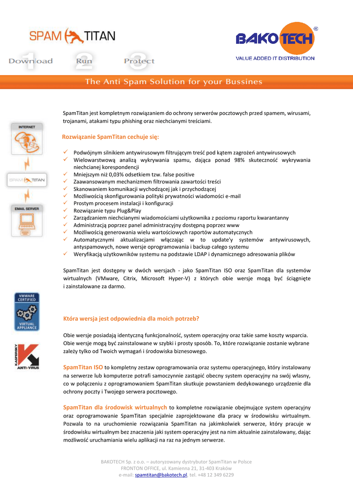 SpamTitan jest kompletnym rozwiązaniem do ochrony serwerów pocztowych przed spamem, wirusami, trojanami, atakami typu phishing oraz niechcianymi treściami. Rozwiązanie SpamTitan cechuje się: Podwójnym silnikiem antywirusowym filtrującym treść pod kątem zagrożeń antywirusowych Wielowarstwową analizą wykrywania spamu, dająca ponad 98% skuteczność wykrywania niechcianej korespondencji Mniejszym niż 0,03% odsetkiem tzw. false positive Zaawansowanym mechanizmem filtrowania zawartości treści Skanowaniem komunikacji wychodzącej jak i przychodzącej Możliwością skonfigurowania polityki prywatności wiadomości e-mail Prostym procesem instalacji i konfiguracji Rozwiązanie typu Plug&Play Zarządzaniem niechcianymi wiadomościami użytkownika z poziomu raportu kwarantanny Administracją poprzez panel administracyjny dostępną poprzez www Możliwością generowania wielu wartościowych raportów automatycznych Automatycznymi aktualizacjami włączając w to update'y systemów antywirusowych, antyspamowych, nowe wersje oprogramowania i backup całego systemu Weryfikacją użytkowników systemu na podstawie LDAP i dynamicznego adresowania plików SpamTitan jest dostępny w dwóch wersjach - jako SpamTitan ISO oraz SpamTitan dla systemów wirtualnych (VMware, Citrix, Microsoft Hyper-V) z których obie wersje mogą być ściągnięte i zainstalowane za darmo. Która wersja jest odpowiednia dla moich potrzeb? Obie wersje posiadają identyczną funkcjonalność, system operacyjny oraz takie same koszty wsparcia. Obie wersje mogą być zainstalowane w szybki i prosty sposób. To, które rozwiązanie zostanie wybrane zależy tylko od Twoich wymagań i środowiska biznesowego. SpamTitan ISO to kompletny zestaw oprogramowania oraz systemu operacyjnego, który instalowany na serwerze lub komputerze potrafi samoczynnie zastąpić obecny system operacyjny na swój własny, co w połączeniu z oprogramowaniem SpamTitan skutkuje powstaniem dedykowanego urządzenie dla ochrony poczty i Twojego serwera pocztowego. SpamTitan dla środowisk wirtualnych to kompletne rozwiązanie obejmujące system operacyjny oraz oprogramowanie SpamTitan specjalnie zaprojektowane dla pracy w środowisku wirtualnym. Pozwala to na uruchomienie rozwiązania SpamTitan na jakimkolwiek serwerze, który pracuje w środowisku wirtualnym bez znaczenia jaki system operacyjny jest na nim aktualnie zainstalowany, dając możliwość uruchamiania wielu aplikacji na raz na jednym serwerze. BAKOTECH Sp. z o.o. – autoryzowany dystrybutor SpamTitan w Polsce FRONTON OFFICE, ul. Kamienna 21, 31-403 Kraków e-mail: [email protected], tel. +48 12 349 6229 SpamTitan ISO – Specyfikacja techniczna Podwójna ochrona antywirusowa SpamTitan zawiera nagrodzone dwa silniki antywirusowe ClamAV oraz Kaspersky Labs Antivirus, które zapewniają podwójne skanowanie przychodzących i wychodzących wiadomości e-mail. Każdy z nich zawiera mechanizm automatycznej aktualizacji, dzięki czemu użytkownik ma przez cały czas zapewnioną ochronę Wielowarstwowa analiza SpamTitan wykorzystuje kompleksowe podejście do analizy każdej warstwy wykrywania niechcianych wiadomości e-mail oparte na analizie struktury polityki nadawcy, weryfikacji wiadomości odbiorcy, SURBL’s, RBL’s, analizę - typu Bayesian, słów kluczowych, nagłówka i treści maili, jak również dostosowane algorytmy oceny. To wszystko sprawia, że weryfikacja maili pod kątem spam/nie spam jest bardzo efektywna Filtrowanie zawartości SpamTitan blokuje niechciane załączniki zarówno z poziomu domeny jak treści i użytkownika końcowego, pozwalając administratorowi na blokowanie niechcianych treści zgodnie z polityką bezpieczeństwa firmy. Zarządzanie spamem z SpamTitan umożliwia zarządzanie spamem z poziomu użytkownika końcowego, w poziomu klienta ten sposób, że użytkownicy mają pełną widoczność blokowanych maili i jednocześnie mogą je przywrócić bez konieczności korzystania ze wsparcia technicznego Pełne raportowanie SpamTitan zawiera kompleksowy pakiet sprawozdawczy, który automatycznie generuje raporty graficzne Zastrzeganie wiadomości Zgodnie ze swoją polityką bezpieczeństwa, użytkownik może zastrzegać wiadomości wychodzących wychodzące i sam ustala tekst zastrzeżenia Obsługa zróżnicowanych SpamTitan może być skonfigurowany do akceptowania maili o nielimitowanej ilości domen domen, które mogą być przekierowane do nieograniczonej ilości serwerów Konfiguracja na poziomie Wszystkie polityki i reguły można ustawiać zarówno na poziomie domeny, jak domeny jak i użytkownika i użytkownika W pełni zautomatyzowane Wszystkie aktualizacje, w tym antywirusowe i antyspamowe, nowe wersje aktualizacje, backup’y i oprogramowania, konfiguracje i tworzenie kopii zapasowych i raporty raportowanie administracyjne są zautomatyzowane, w związku z czym ewentualnie zarządzenie jest zredukowane do minimum Biała i czarna lista Białe i czarne listy mogę być skonfigurowane zarówno na poziomie użytkownika jak i domeny, co umożliwia filtrowanie ruchu na poziomie zarówno poszczególnych adresów e-mail jak i całej domeny Zarządzania kwarantanną Administrator i użytkownik mają możliwość wyszukiwania i odzyskiwania maili z poziomu użytkownika i z poziomu raportu kwarantanny administratora Raportowanie Oprogramowanie zawiera zestaw testów i raportów diagnostycznych, które diagnostyczne dostarczają pełne informacje na temat problemów związanych z systemem. Rozwiązanie posiada również możliwość wysłania raportu diagnostycznego do działu wsparcia technicznego Panel administracyjny Wszystkie funkcje są dostępne za pomocą intuicyjnego interfejsu z dostępem przez dostępny przez www stronę www. Pozwala to na kontrolowany dostęp z sieci i likwiduje potrzebę posiadania dodatkowej platformy do zarządzania. Mogą być wprowadzone ograniczenia co do tego kto i kiedy ma dostęp do interfejsu System operacyjny Rozwi
