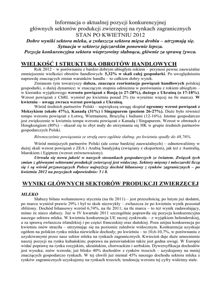 Informacja o aktualnej pozycji konkurencyjnej głównych sektorów produkcji zwierzęcej na rynkach zagranicznych STAN PO KWIETNIU 2012 Dobre wyniki sektora mleka, a zwłaszcza sektora mięsa drobiu – utrzymują się. Sytuacja w sektorze jajczarskim ponownie lepsza. Pozycja konkurencyjna sektora wieprzowiny słabnąca, głównie za sprawą żywca. WIELKOŚĆ I STRUKTURA OBROTÓW HANDLOWYCH Rok 2012 – w porównaniu z bardzo dobrym ubiegłym rokiem – przynosi pewne zauważalne zmniejszenie wielkości obrotów handlowych: 5,32% w skali całej gospodarki. Po uwzględnieniu naprawdę znaczących zmian warunków handlu – to całkiem dobry wynik. Zmianom tym towarzyszy dalsza, znacząca reorientacja powiązań handlowych polskiej gospodarki, o dużej dynamice; w znaczącym stopniu odmienna w porównaniu z rokiem ubiegłym – w kierunku wyjątkowego wzrostu powiązań z Rosją (o 27-28%), dużego z Ukrainą (o 17-18%). Wzrost powiązań z ChRL wyniósł po kwietniu ponad 2% (to wyraźnie więcej na tle marca). W kwietniu – uwagę zwraca wzrost powiązań z Ukrainą. Wśród średnich partnerów Polski – największą uwagę skupiał ogromny wzrost powiązań z Meksykiem (około 47%), Kanadą (31%) i Singapurem (poziom 26-27%). Duże było również tempo wzrostu powiązań z Łotwą, Wietnamem, Brazylią i Indiami (12-16%). Istotne gospodarczo jest zwiększenie w kwietniu tempa wzrostu powiązań z Kanadą i Singapurem. Wzrost w obrotach z Hongkongiem (80%) – okazał się to zbyt mały do utrzymania się HK w grupie średnich partnerów gospodarczych Polski. Równocześnie powiązania ze strefą euro ogólnie słabną; po kwietniu spadły do 48,76%. Wśród mniejszych partnerów Polski (ale coraz bardziej zauważalnych) – odnotowaliśmy w dużej skali wzrost powiązań z ZEA i Arabią Saudyjską (związany z eksportem), jak też z Australią, Marokiem i Egiptem (wzrost zrównoważony). Utrwala się nowa jakość w naszych stosunkach gospodarczych ze światem. Związek tych zmian z głównymi sektorami produkcji zwierzęcej jest widoczny. Sektory mięsny i mleczarski liczą się i są wśród przynoszących Polsce najwyższy dochód bilansowy z rynków zagranicznych – po kwietniu 2012 na pozycjach odpowiednio: 5 i 8. WYNIKI GŁÓWNYCH SEKTORÓW PRODUKCJI ZWIERZĘCEJ MLEKO Słabszy bilans wolumenowy stycznia (na tle 2011) – jest przeszłością; po lutym już dodatni, po marcu wyniósł prawie 29% i był to skok niezwykły – zwłaszcza że po kwietniu wynik pozostał zbliżony. Dochód bilansowy wzrósł 6,74%, na tle 2011; na tle marca – to też wynik zadawalający, mimo że nieco słabszy. Już w IV kwartale 2011 szczególnie poprawiła się pozycja konkurencyjna naszego sektora mleka. W kwietniu konkurencja UE raczej zyskiwała – z wyjątkiem holenderskiej, a za sprawą zwłaszcza irlandzkiej i po części francuskiej oraz duńskiej. Poza unijna konkurencja po kwietniu znów straciła – utrzymując się na poziomie zaledwie widocznym. Konkurencja uzyskuje ogółem na polskim rynku mleka niewielkie dochody; po kwietniu – to 10,6-10,7%, w porównaniu z uzyskiwanymi przez nasz sektor mleka na rynkach zagranicznych. Kwiecień daje duże umocnienie naszej pozycji na rynku kubańskim; poprawa na peruwiańskim także jest godna uwagi. W Europie widać poprawę na rynku rosyjskim, ukraińskim, chorwackim i serbskim. Dywersyfikacja dochodów jest wysoka; znów wzrosła; już blisko 40% dochodów z rynków trzecich – uzyskujemy na mniej znaczących gospodarczo rynkach. W tej chwili już niemal 45% naszego dochodu sektora mleka z rynków zagranicznych uzyskujemy na rynkach trzecich; tendencję wzrostu tej cyfry widzimy stale. MIĘSO DROBIOWE Dochody bilansowe po kwietniu (na tle 2011) wzrosły blisko 20%, a więc w stopniu na tyle dużym, że zwraca to uwagę. Z drugiej strony sektor mleka w kwietniu zanotował wzrost dochodów ponownie na tyle wysoki, że zachował pierwsze miejsce w dochodach z rynków zagranicznych – wyprzedzając (poziom 6-7%) sektor mięsa drobiu. Dużo lepszy był również bilans wolumenowy – o 24,86%. Wyniki (na tle 2011) cechuje dalsza poprawa; przekonują o utrzymywaniu się bardzo dobrych tendencji wielu ostatnich miesięcy. Walka o lepszą pozycję konkurencyjną trwa – przynosi coraz lepsze rezultaty. Mimo względnej równowagi we wzroście dochodów bilansowych z rynku UE i trzecich – w marcu i kwietniu (po krótkiej przerwie) – wróciła tendencja do obniżania się dochodów z rynków trzecich, z II półrocza 2011; udział ten wyniósł po kwietniu poniżej 9%. Dość stabilna była nasza pozycja na trzech rynkach trzecich, dla sektora mięsa drobiowego znaczących: Hongkongu, Ukrainie i Beninie; kwiecień ją nieco osłabił – za sprawą Hongkongu. Przyniósł także poprawę sytuacji na rynku rosyjskim, a zwłaszcza białoruskim. Konkurencja jest słaba; po kwietniu utrzymywała się na poziomie poniżej 1% dochodu bilansowego – w porównaniu z uzyskiwanym przez polski sektor mięsa drobiu na zagranicznych rynkach. Nieco zyskali konkurenci włoscy, a z mniej liczących się – zwłaszcza fińscy i portugalscy. WOŁOWINA Odnotowano w roku 2012 spadek na trzecią pozycję w tworzeniu dochodu bilansowego z rynków zagranicznych – wśród głównych sektorów produkcji zwierzęcej (wynik 5-6% słabszy na tle sektora mięsa drobiu po marcu). Ważniejsze cyfry – wskazujące na duże pogorszenie sytuacji na tle (bardzo dobrego) roku 2011: o 22,31% spadł dochód bilansowy i o 21,33% pogorszył się bilans wolumenowy; to po I kwartale b.r. W marcu złamano tendencję niższego udziału rynków trzecich w dochodach (poziom 24-25%). Wyniki kwietniowe sektora z rynków zagranicznych znamy tylko z danych pośrednich – stąd brak większych zmian traktujemy tu tylko jako informację orientacyjną. JAJA Dochód bilansowy z rynków zagranicznych – w zestawieniu z sektorem mleka, wołowiny, czy mięsa drobiu – jest bez porównani
