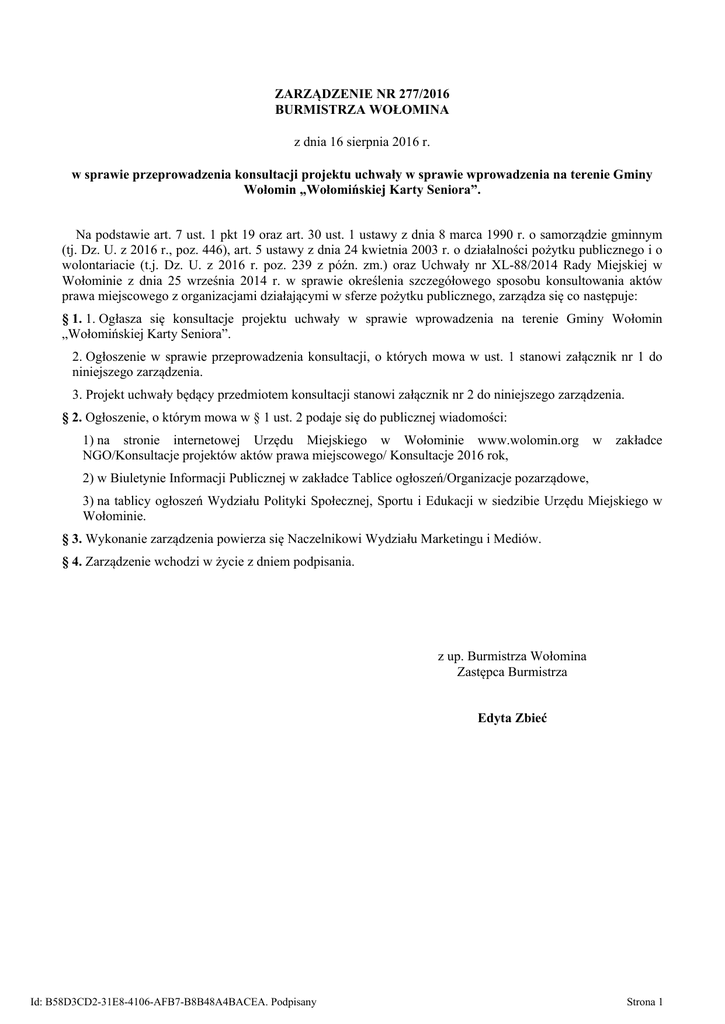 ZARZĄDZENIE NR 277/2016 BURMISTRZA WOŁOMINA z dnia 16 sierpnia 2016 r. w sprawie przeprowadzenia konsultacji projektu uchwały w sprawie wprowadzenia na terenie Gminy Wołomin „Wołomińskiej Karty Seniora”. Na podstawie art. 7 ust. 1 pkt 19 oraz art. 30 ust. 1 ustawy z dnia 8 marca 1990 r. o samorządzie gminnym (tj. Dz. U. z 2016 r., poz. 446), art. 5 ustawy z dnia 24 kwietnia 2003 r. o działalności pożytku publicznego i o wolontariacie (t.j. Dz. U. z 2016 r. poz. 239 z późn. zm.) oraz Uchwały nr XL-88/2014 Rady Miejskiej w Wołominie z dnia 25 września 2014 r. w sprawie określenia szczegółowego sposobu konsultowania aktów prawa miejscowego z organizacjami działającymi w sferze pożytku publicznego, zarządza się co następuje: § 1. 1. Ogłasza się konsultacje projektu uchwały w sprawie wprowadzenia na terenie Gminy Wołomin „Wołomińskiej Karty Seniora”. 2. Ogłoszenie w sprawie przeprowadzenia konsultacji, o których mowa w ust. 1 stanowi załącznik nr 1 do niniejszego zarządzenia. 3. Projekt uchwały będący przedmiotem konsultacji stanowi załącznik nr 2 do niniejszego zarządzenia. § 2. Ogłoszenie, o którym mowa w § 1 ust. 2 podaje się do publicznej wiadomości: 1) na stronie internetowej Urzędu Miejskiego w Wołominie www.wolomin.org NGO/Konsultacje projektów aktów prawa miejscowego/ Konsultacje 2016 rok, w zakładce 2) w Biuletynie Informacji Publicznej w zakładce Tablice ogłoszeń/Organizacje pozarządowe, 3) na tablicy ogłoszeń Wydziału Polityki Społecznej, Sportu i Edukacji w siedzibie Urzędu Miejskiego w Wołominie. § 3. Wykonanie zarządzenia powierza się Naczelnikowi Wydziału Marketingu i Mediów. § 4. Zarządzenie wchodzi w życie z dniem podpisania. z up. Burmistrza Wołomina Zastępca Burmistrza Edyta Zbieć Id: B58D3CD2-31E8-4106-AFB7-B8B48A4BACEA. Podpisany Strona 1 Załącznik Nr 1 do Zarządzenia Nr 277/2016 Burmistrza Wołomina z dnia 16 sierpnia 2016 r. Ogłoszenie Na podstawie Uchwały nr XL-88/2014 Rady Miejskiej w Wołominie z dnia 25 września 2014 r. w sprawie określenia szczegółowego sposobu konsultowania aktów prawa miejscowego z organizacjami działającymi w sferze pożytku publicznego Burmistrz Wołomina ogłasza konsultacje projektu uchwały w sprawie wprowadzenia na terenie Gminy Wołomin „Wołomińskiej Karty Seniora” i zaprasza przedstawicieli organizacji pozarządowych oraz podmioty, o których mowa w art. 3 ust. 3 ustawy z dnia 24 kwietnia 2003 r. o działalności pożytku publicznego i o wolontariacie, do aktywnego uczestnictwa. 1. Projekt uchwały poddawany konsultacjom przygotowano z myślą o podniesieniu aktywności i zwiększeniu dostępności dla seniorów, m.in. w zakresie usług kulturalnych, rekreacyjnych i sportowych, a także kształtowania pozytywnego wizerunku osób starszych w społeczeństwie. 2. Projekt uchwały udostępnia się na stronie www.wolomin.org: 1) w zakładce NGO/Aktualności oraz NGO/Konsultacje projektów aktów prawa miejscowego/Konsultacje 2016 rok; 2) w Biuletynie Informacji Publicznej w zakładce Tablice Ogłoszeń/Organizacje pozarządowe. 3. Uwagi do projektu uchwały, o którym mowa w pkt. 1 można zgłaszać do dnia 30.08.2016 r. do godziny 16.00 na adres mailowy: [email protected]. Dodatkowe informacje można uzyskać w Urzędzie Miejskim w Wołominie przy ul. Ogrodowej 4, w pokoju 202 lub pod numerem telefonu 22 763 30 74, a także pod adresem [email protected] . Sprawę prowadzi Jakub Biesiada, Naczelnik Wydziału Marketingu i Mediów. Id: B58D3CD2-31E8-4106-AFB7-B8B48A4BACEA. Podpisany Strona 1 Załącznik Nr 2 do Zarządzenia Nr 277/2016 Burmistrza Wołomina z dnia 16 sierpnia 2016 r. UCHWAŁA NR ...... RADY MIEJSKIEJ W WOŁOMINIE z dnia ..... 2016 w sprawie wprowadzenia na terenie Gminy Wołomin „Wołomińskiej Karty Seniora” Na podstawie art. 18 ust. 1 w związku z art. 5c ust. 1 ustawy z dnia 8 marca 1990 r. o samorządzie gminnym (t.j. Dz. U. z 2016 r., poz. 446) w związku z art. 17 ust. 2 pkt 4 ustawy z dnia 12 marca 2004 r. o pomocy społecznej (t.j. Dz. U. z 2015 r., poz. 163 z późn. zm), uchwala się, co następuje: § 1. Postanawia się wprowadzić na terenie Gminy Wołomin pilotażowy program pod nazwą Wołomińska Karta Seniora, zwany dalej „Kartą Seniora”, zgodnie z załącznikiem stanowiącym integralną część uchwały. § 2. Wykonanie uchwały powierza się Burmistrzowi Wołomina. § 3. Uchwała wchodzi w życie po upływie 14 dni od dnia ogłoszenia w Dzienniku Urzędowym Województwa Mazowieckiego. Przewodniczący Rady Miejskiej w Wołominie Leszek Czarzasty Id: B58D3CD2-31E8-4106-AFB7-B8B48A4BACEA. Podpisany Strona 1 Załącznik Nr 1 do Załącznika Nr 2 Wołomińska Karta Seniora § 1. Pilotażowy program Karta Seniora, skierowany jest do seniorów. Na potrzeby pilotażowego programu przyjmuje się, że seniorem jest osoba, która ukończyła 60 rok życia i zamieszkuje na terenie Gminy Wołomin. § 2. Celem programu jest podniesienie aktywności i zwiększenie dostępności dla seniorów, m.in. w zakresie usług kulturalnych, rekreacyjnych i sportowych, a także kształtowanie pozytywnego wizerunku osób starszych w społeczeństwie. § 3. W programie mogą wziąć udział partnerzy, którymi są: 1) jednostki organizacyjne Gminy Wołomin, w tym instytucje kultury, 2) podmioty i instytucje prywatne, które zawrą z Gminą Wołomin porozumienia o współpracy w zakresie realizacji pilotażowego projektu. § 4. Program realizowany będzie poprzez promocję, koordynację ulg i zniżek zaproponowanych przez partnerów programu. § 5. Podstawą do korzystania z ulg i zniżek w ramach programu będzie Karta Seniora, wydawana przez Burmistrza Wołomina. § 6. Program będzie obejmować katalog ulg i preferencji udostępnionych przez partnerów uczestniczących w programie dla seniorów powyżej 60 roku życia. § 7. Ulgi i preferencje, o których mowa w § 6, dla jednostek organizacyjnych Gminy Wołomin, regulują odrę