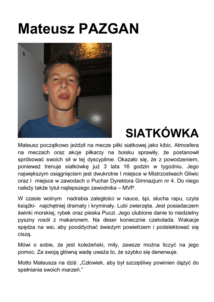 Mateusz PAZGAN SIATKÓWKA Mateusz początkowo jeździł na mecze piłki siatkowej jako kibic. Atmosfera na meczach oraz akcje piłkarzy na boisku sprawiły, że postanowił spróbować swoich sił w tej dyscyplinie. Okazało się, że z powodzeniem, ponieważ trenuje siatkówkę już 3 lata 16 godzin w tygodniu. Jego największym osiągnięciem jest dwukrotne I miejsce w Mistrzostwach Gliwic oraz I miejsce w zawodach o Puchar Dyrektora Gimnazjum nr 4. Do niego należy także tytuł najlepszego zawodnika – MVP. W czasie wolnym nadrabia zaległości w nauce, śpi, słucha rapu, czyta książki- najchętniej dramaty i kryminały. Lubi zwierzęta. Jest posiadaczem świnki morskiej, rybek oraz pieska Puczi. Jego ulubione danie to niedzielny pyszny rosół z makaronem. Na deser koniecznie czekolada. Wakacje spędza na wsi, aby pooddychać świeżym powietrzem i podelektować się ciszą. Mówi o sobie, że jest koleżeński, miły, zawsze można liczyć na jego pomoc. Za swoją główną wadę uważa to, że szybko się denerwuje. Motto Mateusza na dziś: „Człowiek, aby był szczęśliwy powinien dążyć do spełniania swoich marzeń.”