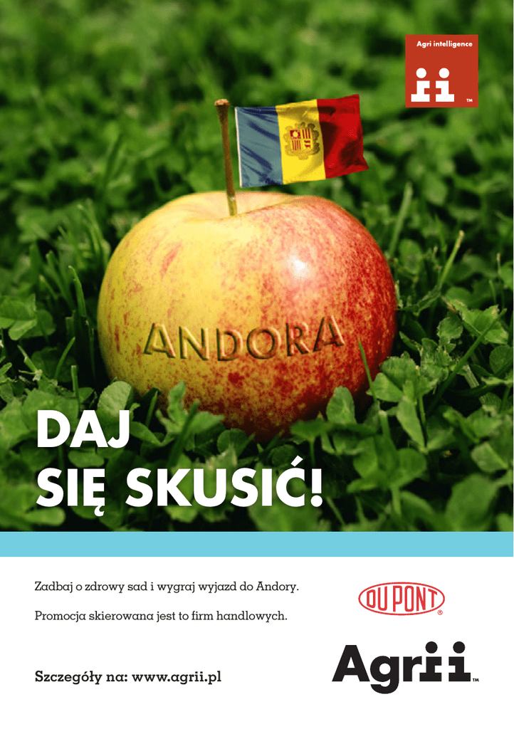 DAJ SIĘ SKUSIĆ! Zadbaj o zdrowy sad i wygraj wyjazd do Andory. Promocja skierowana jest to firm handlowych. Szczegóły na: www.agrii.pl WYGRANA W DWÓCH PROSTYCH KROKACH: 1. Dokonaj zakupu promocyjnego pakietu: 500 l / 50 l/kg (łącznie) Kapelan 80 WG 2000 kg 2. Spiesz się! Promocją objęte będą zamówienia produktów złożone do 15.03.2017 r., ale liczba miejsc na wyjeździe jest ograniczona i o kwalifikacji zdecyduje kolejność składania zamówień. Nie przegap okazji! Szczegółowy regulamin dostępny na www.agrii.pl i u doradców. Owalne logo DuPont, DuPont™, The miracles of science™ oraz Fontelis®, Coragen® i Steward® są zarejestrowanymi znakami towarowymi lub znakami towarowymi firmy E.I. du Pont de Nemours and Company lub podmiotów stowarzyszonych.