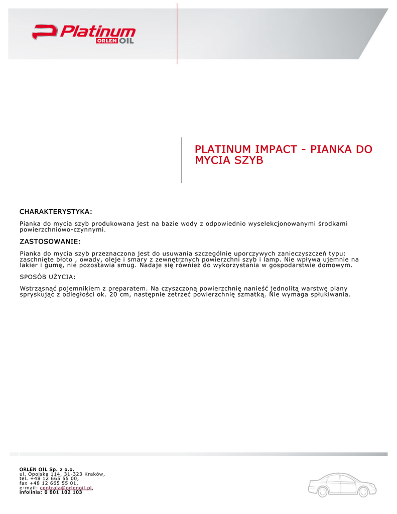 PLATINUM IMPACT PIANKA DO MYCIA SZYB CHARAKTERYSTYKA: Pianka do mycia szyb produkowana jest na bazie wody z odpowiednio wyselekcjonowanymi środkami powierzchniowoczynnymi. ZASTOSOWANIE: Pianka do mycia szyb przeznaczona jest do usuwania szczególnie uporczywych zanieczyszczeń typu: zaschnięte błoto , owady, oleje i smary z zewnętrznych powierzchni szyb i lamp. Nie wpływa ujemnie na lakier i gumę, nie pozostawia smug. Nadaje się również do wykorzystania w gospodarstwie domowym. SPOSÓB UŻYCIA: Wstrząsnąć pojemnikiem z preparatem. Na czyszczoną powierzchnię nanieść jednolitą warstwę piany spryskując z odległości ok. 20 cm, następnie zetrzeć powierzchnię szmatką. Nie wymaga spłukiwania. ORLEN OIL Sp. z o.o. ul. Opolska 114, 31323 Kraków, tel. +48 12 665 55 00, fax +48 12 665 55 01, email: [email protected], infolinia: 0 801 102 103