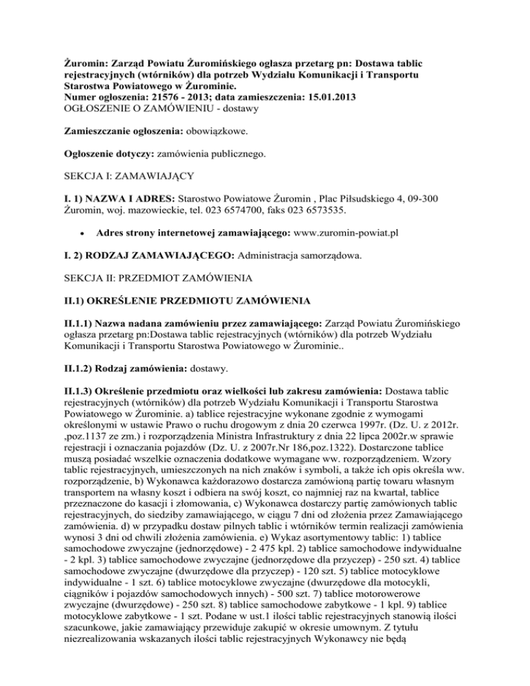 Żuromin: Zarząd Powiatu Żuromińskiego ogłasza przetarg pn: Dostawa tablic rejestracyjnych (wtórników) dla potrzeb Wydziału Komunikacji i Transportu Starostwa Powiatowego w Żurominie. Numer ogłoszenia: 21576 - 2013; data zamieszczenia: 15.01.2013 OGŁOSZENIE O ZAMÓWIENIU - dostawy Zamieszczanie ogłoszenia: obowiązkowe. Ogłoszenie dotyczy: zamówienia publicznego. SEKCJA I: ZAMAWIAJĄCY I. 1) NAZWA I ADRES: Starostwo Powiatowe Żuromin , Plac Piłsudskiego 4, 09-300 Żuromin, woj. mazowieckie, tel. 023 6574700, faks 023 6573535. Adres strony internetowej zamawiającego: www.zuromin-powiat.pl I. 2) RODZAJ ZAMAWIAJĄCEGO: Administracja samorządowa. SEKCJA II: PRZEDMIOT ZAMÓWIENIA II.1) OKREŚLENIE PRZEDMIOTU ZAMÓWIENIA II.1.1) Nazwa nadana zamówieniu przez zamawiającego: Zarząd Powiatu Żuromińskiego ogłasza przetarg pn:Dostawa tablic rejestracyjnych (wtórników) dla potrzeb Wydziału Komunikacji i Transportu Starostwa Powiatowego w Żurominie.. II.1.2) Rodzaj zamówienia: dostawy. II.1.3) Określenie przedmiotu oraz wielkości lub zakresu zamówienia: Dostawa tablic rejestracyjnych (wtórników) dla potrzeb Wydziału Komunikacji i Transportu Starostwa Powiatowego w Żurominie. a) tablice rejestracyjne wykonane zgodnie z wymogami określonymi w ustawie Prawo o ruchu drogowym z dnia 20 czerwca 1997r. (Dz. U. z 2012r. ,poz.1137 ze zm.) i rozporządzenia Ministra Infrastruktury z dnia 22 lipca 2002r.w sprawie rejestracji i oznaczania pojazdów (Dz. U. z 2007r.Nr 186,poz.1322). Dostarczone tablice muszą posiadać wszelkie oznaczenia dodatkowe wymagane ww. rozporządzeniem. Wzory tablic rejestracyjnych, umieszczonych na nich znaków i symboli, a także ich opis określa ww. rozporządzenie, b) Wykonawca każdorazowo dostarcza zamówioną partię towaru własnym transportem na własny koszt i odbiera na swój koszt, co najmniej raz na kwartał, tablice przeznaczone do kasacji i złomowania, c) Wykonawca dostarczy partię zamówionych tablic rejestracyjnych, do siedziby zamawiającego, w ciągu 7 dni od złożenia przez Zamawiającego zamówienia. d) w przypadku dostaw pilnych tablic i wtórników termin realizacji zamówienia wynosi 3 dni od chwili złożenia zamówienia. e) Wykaz asortymentowy tablic: 1) tablice samochodowe zwyczajne (jednorzędowe) - 2 475 kpl. 2) tablice samochodowe indywidualne - 2 kpl. 3) tablice samochodowe zwyczajne (jednorzędowe dla przyczep) - 250 szt. 4) tablice samochodowe zwyczajne (dwurzędowe dla przyczep) - 120 szt. 5) tablice motocyklowe indywidualne - 1 szt. 6) tablice motocyklowe zwyczajne (dwurzędowe dla motocykli, ciągników i pojazdów samochodowych innych) - 500 szt. 7) tablice motorowerowe zwyczajne (dwurzędowe) - 250 szt. 8) tablice samochodowe zabytkowe - 1 kpl. 9) tablice motocyklowe zabytkowe - 1 szt. Podane w ust.1 ilości tablic rejestracyjnych stanowią ilości szacunkowe, jakie zamawiający przewiduje zakupić w okresie umownym. Z tytułu niezrealizowania wskazanych ilości tablic rejestracyjnych Wykonawcy nie będą przysługiwały żadne roszczenia przeciwko zamawiającemu. UWAGA: liczba tablic może ulec zmniejszeniu jeżeli z przyczyn niezależnych od zamawiającego, ulegnie zmniejszeniu liczba tablic rejestracyjnych niezbędnych do zakupienia w postępowaniu dotyczącym rejestracji pojazdów.. II.1.4) Czy przewiduje się udzielenie zamówień uzupełniających: nie. II.1.5) Wspólny Słownik Zamówień (CPV): 14.70.00.00-8. II.1.6) Czy dopuszcza się złożenie oferty częściowej: nie. II.1.7) Czy dopuszcza się złożenie oferty wariantowej: nie. II.2) CZAS TRWANIA ZAMÓWIENIA LUB TERMIN WYKONANIA: Zakończenie: 31.12.2013. SEKCJA III: INFORMACJE O CHARAKTERZE PRAWNYM, EKONOMICZNYM, FINANSOWYM I TECHNICZNYM III.1) WADIUM Informacja na temat wadium: NIE DOTYCZY III.2) ZALICZKI Czy przewiduje się udzielenie zaliczek na poczet wykonania zamówienia: nie III.3) WARUNKI UDZIAŁU W POSTĘPOWANIU ORAZ OPIS SPOSOBU DOKONYWANIA OCENY SPEŁNIANIA TYCH WARUNKÓW III. 3.1) Uprawnienia do wykonywania określonej działalności lub czynności, jeżeli przepisy prawa nakładają obowiązek ich posiadania Opis sposobu dokonywania oceny spełniania tego warunku Zamawiający dokona oceny spełnienia tego warunku na podstawie treści złożonego przez wykonawcę oświadczenia na zasadzie spełnia /nie spełnia. III.3.2) Wiedza i doświadczenie o Opis sposobu dokonywania oceny spełniania tego warunku Zamawiający dokona oceny spełnienia tego warunku na podstawie treści złożonego przez wykonawcę oświadczenia na zasadzie spełnia /nie spełnia. III.3.3) Potencjał techniczny o Opis sposobu dokonywania oceny spełniania tego warunku Zamawiający dokona oceny spełnienia tego warunku na podstawie treści złożonego przez wykonawcę oświadczenia na zasadzie spełnia /nie spełnia. III.3.4) Osoby zdolne do wykonania zamówienia o Opis sposobu dokonywania oceny spełniania tego warunku Zamawiający dokona oceny spełnienia tego warunku na podstawie treści złożonego przez wykonawcę oświadczenia na zasadzie spełnia /nie spełnia. III.3.5) Sytuacja ekonomiczna i finansowa o Opis sposobu dokonywania oceny spełniania tego warunku o Zamawiający dokona oceny spełnienia tego warunku na podstawie treści złożonego przez wykonawcę oświadczenia na zasadzie spełnia /nie spełnia. III.4) INFORMACJA O OŚWIADCZENIACH LUB DOKUMENTACH, JAKIE MAJĄ DOSTARCZYĆ WYKONAWCY W CELU POTWIERDZENIA SPEŁNIANIA WARUNKÓW UDZIAŁU W POSTĘPOWANIU ORAZ NIEPODLEGANIA WYKLUCZENIU NA PODSTAWIE ART. 24 UST. 1 USTAWY III.4.1) W zakresie wykazania spełniania przez wykonawcę warunków, o których mowa w art. 22 ust. 1 ustawy, oprócz oświadczenia o spełnieniu warunków udziału w postępowaniu, należy przedłożyć: III.4.2) W zakresie potwierdzenia niepodlegania wykluczeniu na podstawie art. 24 ust. 1 ustawy, należy przedłożyć: oświadczenie o braku podstaw do wykluczenia III.7) Czy ogranicza się możliwość ubiegania się o zamówienie publ