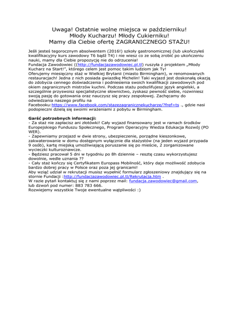 Uwaga! Ostatnie wolne miejsca w październiku! Młody Kucharzu! Młody Cukierniku! Mamy dla Ciebie ofertę ZAGRANICZNEGO STAŻU! Jeśli jesteś tegorocznym absolwentem (2016!) szkoły gastronomicznej (lub ukończyłeś kwalifikacyjny kurs zawodowy T6 bądź T4) i nie wiesz co ze sobą zrobić po ukończeniu nauki, mamy dla Ciebie propozycję nie do odrzucenia! Fundacja Zawodowiec ((http://fundacjazawodowiec.pl.tl) ruszyła z projektem „Młody Kucharz na Start!”, którego celem jest pomoc takim ludziom jak Ty! Oferujemy miesięczny staż w Wielkiej Brytanii (miasto Birmingham), w renomowanych restauracjach! Jedna z nich posiada gwiazdkę Michelin! Taki wyjazd jest doskonałą okazją do zdobycia cennego doświadczenia i podniesienia swoich kwalifikacji zawodowych pod okiem zagranicznych mistrzów kuchni. Podczas stażu podszlifujesz język angielski, a szczególnie przyswoisz specjalistyczne słownictwo, zyskasz pewność siebie, rozwiniesz swoją pasję do gotowania oraz nauczysz się pracy zespołowej. Zachęcamy do odwiedzania naszego profilu na Facebooku:https://www.facebook.com/stazezagranicznekucharze/?fref=ts ., gdzie nasi podopieczni dzielą się swoimi wrażeniami z pobytu w Birmingham. Garść potrzebnych informacji: - Za staż nie zapłacisz ani złotówki! Cały wyjazd finansowany jest w ramach środków Europejskiego Funduszu Społecznego, Program Operacyjny Wiedza Edukacja Rozwój (PO WER). - Zapewniamy przejazd w dwie strony, ubezpieczenie, porządne kieszonkowe, zakwaterowanie w domu dostępnym wyłącznie dla stażystów (na jeden wyjazd przypada 9 osób), kartę miejską umożliwiającą poruszanie się po mieście, 2 zorganizowane wycieczki kulturoznawcze. - Będziesz pracował 5 dni w tygodniu po 8h dziennie – resztę czasu wykorzystujesz dowolnie, wedle uznania ?? - Cały staż kończy się Certyfikatem Europass Mobilność, który daje możliwość zdobycia bardzo dobrej pracy w Polsce oraz poza jej granicami! Aby wziąć udział w rekrutacji musisz wypełnić formularz zgłoszeniowy znajdujący się na stornie Fundacji :http://fundacjazawodowiec.pl.tl/Rekrutacja.htm . W razie pytań kontaktuj się z nami poprzez mail: [email protected], lub dzwoń pod numer: 883 783 666. Rozwiejemy wszystkie Twoje ewentualne wątpliwości :)
