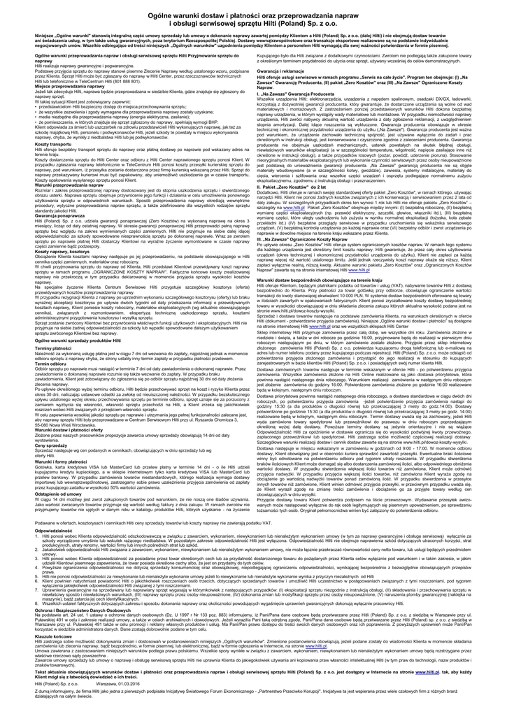 Ogólne warunki dostaw i płatności oraz przeprowadzania napraw i obsługi serwisowej sprzętu Hilti (Poland) Sp. z o.o. Niniejsze „Ogólne warunki" stanowią integralną część umowy sprzedaży lub umowy o dokonanie naprawy zawartej pomiędzy Klientem a Hilti (Poland) Sp. z o.o. (dalej Hilti) i nie obejmują dostaw towarów ani świadczenia usług, w tym także usług gwarancyjnych, poza terytorium Rzeczpospolitej Polskiej. Dostawy wewnątrzwspólnotowe oraz transakcje eksportowe realizowane są na podstawie indywidualnie negocjowanych umów. Wszelkie odbiegające od treści niniejszych „Ogólnych warunków" uzgodnienia pomiędzy Klientem a personelem Hilti wymagają dla swej ważności potwierdzenia w formie pisemnej. Ogólne warunki przeprowadzania napraw i obsługi serwisowej sprzętu Hilti Przyjmowanie sprzętu do naprawy Hilti realizuje naprawy gwarancyjne i pogwarancyjne. Podstawę przyjęcia sprzętu do naprawy stanowi pisemne Zlecenie Naprawy według ustalonego wzoru, podpisane przez Klienta. Sprzęt Hilti może być zgłaszany do naprawy w Hilti Center, przez rzeczoznawców technicznych Hilti lub telefonicznie w TeleCentrum Hilti (801 888 801). Miejsce przeprowadzania naprawy Jeżeli tak zdecyduje Hilti, naprawa będzie przeprowadzana w siedzibie Klienta, gdzie znajduje się zgłoszony do naprawy sprzęt. W takiej sytuacji Klient jest zobowiązany zapewnić: • przedstawicielom Hilti bezpieczny dostęp do miejsca przechowywania sprzętu; • że wszystkie zezwolenia i zgody wymagane dla przeprowadzenia naprawy zostały uzyskane; • media niezbędne dla przeprowadzenia naprawy (energia elektryczna, zasilanie); • że pomieszczenia, w których znajduje się sprzęt zgłoszony do naprawy, spełniają wymogi BHP. Klient odpowiada za śmierć lub uszczerbek na zdrowiu przedstawicieli Hilti wykonujących naprawę, jak też za szkodę majątkową Hilti, personelu i podwykonawców Hilti, jeżeli szkody te powstały w miejscu wykonywania naprawy, chyba, że wynikły z niedbalstwa Hilti lub jej podwykonawców. Koszty transportu Hilti oferuje bezpłatny transport sprzętu do naprawy oraz płatną dostawę po naprawie pod wskazany adres na terenie kraju. Koszty dostarczenia sprzętu do Hilti Center oraz odbioru z Hilti Center naprawionego sprzętu ponosi Klient. W przypadku zgłaszania naprawy telefonicznie w TeleCentrum Hilti ponosi koszty przesyłki kurierskiej sprzętu do naprawy, pod warunkiem, iż przesyłka zostanie dostarczona przez firmę kurierską wskazaną przez Hilti. Sprzęt do naprawy przekazywany kurierowi musi być zapakowany, aby uniemożliwić uszkodzenie go w czasie transportu. Koszty opakowania wysyłanego sprzętu ponosi Klient. Warunki przeprowadzania napraw Rozmiar i zakres przeprowadzonej naprawy dostosowany jest do stopnia uszkodzenia sprzętu i stwierdzonego obrazu usterki. Naprawa sprzętu obejmuje przywrócenie jego funkcji i działania w celu umożliwienia ponownego użytkowania sprzętu w odpowiednich warunkach. Sposób przeprowadzenia naprawy określają wewnętrzne procedury, wytyczne przeprowadzania napraw sprzętu, a także zdefiniowane dla wszystkich rodzajów sprzętu standardy jakości Hilti. Gwarancja ponaprawcza Hilti (Poland) Sp. z o.o. udziela gwarancji ponaprawczej (Zero Kosztów) na wykonaną naprawę na okres 3 miesięcy, licząc od daty ostatniej naprawy. W okresie gwarancji ponaprawczej Hilti przeprowadzi pełną naprawę sprzętu bez względu na zakres wymienianych części zamiennych. Hilti nie przyjmuje na siebie dalej idącej odpowiedzialności za szkody spowodowane niesprawnością sprzętu po dokonanej naprawie. Wraz ze zwrotem sprzętu po naprawie płatnej Hilti dostarczy Klientowi na wyraźne życzenie wymontowane w czasie naprawy części zamienne bądź podzespoły. Koszty naprawy, kosztorys Obciążenie Klienta kosztami naprawy następuje po jej przeprowadzeniu, na podstawie obowiązującego w Hilti cennika części zamiennych, materiałów oraz robocizny. W chwili przyjmowania sprzętu do naprawy od Klienta, Hilti przedstawi Klientowi przewidywany koszt naprawy sprzętu w ramach programu „OGRANICZONE KOSZTY NAPRAW". Faktyczne końcowe koszty zrealizowanej naprawy nie przekroczą w tym przypadku deklarowanej w momencie przyjęcia sprzętu wysokości kosztów naprawy. Na specjalne życzenie Klienta Centrum Serwisowe Hilti przygotuje szczegółowy kosztorys (oferta) przewidywanych kosztów przeprowadzenia naprawy. W przypadku rezygnacji Klienta z naprawy po uprzednim wykonaniu szczegółowego kosztorysu (oferty) lub braku wyraźnej akceptacji kosztorysu po upływie dwóch tygodni od daty przekazania informacji o przewidywanych kosztach naprawy, Klient poniesie koszty robocizny, materiałów eksploatacyjnych (wg aktualnie obowiązującego cennika), związanych z rozmontowaniem, ekspertyzą techniczną uszkodzonego sprzętu, kosztami administracyjnymi przygotowania kosztorysu i wysyłką sprzętu. Sprzęt zostanie zwrócony Klientowi bez przywrócenia właściwych funkcji użytkowych i eksploatacyjnych. Hilti nie przyjmuje na siebie żadnej odpowiedzialności za szkody lub wypadki spowodowane dalszym użytkowaniem sprzętu zwróconego Klientowi bez naprawy. Ogólne warunki sprzedaży produktów Hilti Terminy płatności Należność za wykonaną usługę płatna jest w ciągu 7 dni od wezwania do zapłaty, najpóźniej jednak w momencie odbioru sprzętu z naprawy chyba, że strony ustaliły inny termin zapłaty w przypadku płatności przelewem. Termin odbioru Odbiór sprzętu po naprawie musi nastąpić w terminie 7 dni od daty zawiadomienia o dokonanej naprawie. Przez zawiadomienie o dokonanej naprawie rozumie się także wezwanie do zapłaty. W przypadku braku zawiadomienia, Klient jest zobowiązany do zgłoszenia się po odbiór sprzętu najpóźniej 30 dni od daty złożenia zlecenia naprawy. Po upływie określonego wyżej terminu odbioru, Hilti będzie przechowywać sprzęt na koszt i ryzyko Klienta przez okres 30 dni,