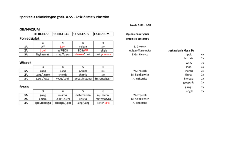 Spotkania rekolekcyjne godz. 8.55 - kościół Mały Płaszów Nauki 9.00 - 9.50 GIMNAZJUM 10.10-10.55 11.00-11.45 11.50-12.35 12.40-13.25 Poniedziałek 1A 2A 3A 3 WF j.pol fizyka/mat. Opieka nauczycieli przejscie do szkoły 4 j.pol WF/EDB mat./fizyka 5 religia EDB/WF chemia/ mat. 6 xxx religia mat./chemia Z. Grymek A. Igar-Makowska E.Gankiewicz Wtorek 1A 2A 3A 3 j.ang j.ang/j.niem j.pol./WOS 4 j.ang chemia WOS/j.pol. 5 j,niem chemia geog./historia 6 xxx xxx historia/gegr. W. Frączek M. Sienkiewicz A. Piskorska Środa 1A 2A 3A 3 j.ang j.niem j.pol/biologia 4 muzyka j.ang/j.niem biologia/j.pol 5 matematyka religia j.ang/j.ang 6 zaj. techn. matematyka j.ang/j.ang W. Frączek M. Sienkiewicz A. Piskorska zestawienie klasa 3A j.pol. historia 4x 2x WOS mat. chemia fizyka biologia geografia 2x 4x 2x 2x 2x 2x j.ang I j.ang II 2x 2x