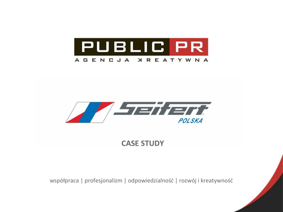 CASE STUDY współpraca | profesjonalizm | odpowiedzialność | rozwój i kreatywność Opis projektu Seifert Polska Sp. z o.o., z siedzibą w Katowicach, rozpoczynała działalność od typowej spedycji. Poprzez stopniowy rozwój, Dane projektu zwiększanie Zakres: stałe doradztwo i działania w obszarze PR floty samochodów, budowę nowoczesnej infrastruktury oraz magazynów, spółka wypracowała stabilną pozycję w branży. Obecnie Seifert Polska stawia przede wszystkim na wewnątrzzakładową logistykę produkcyjną, czyli usługi realizowane bezpośrednio u klienta. Firma współpracuje Czas trwania: październik 2014 – projekt w toku Osoba odpowiedzialna: Karolina Moskal z dużymi koncernami z branży automotive, chemicznej czy papierniczej. W ramach realizowanego projektu Agencja Kreatywna Public PR podjęła działania związane ze stworzeniem strategii działań PR, budowaniem wizerunku firmy w mediach, a także realizacją projektów komunikacyjnych. Celem współpracy Seifert Polska Sp. z o.o. z Public PR jest utrwalanie pozytywnego wizerunku spółki w świadomości obecnych, jak i potencjalnych kontrahentów. W związku z Public PR Agencja Kreatywna ul. Ks. Bpa Bednorza 2a-6 40-384 Katowice t: 32 / 661 49 72 e: [email protected] www.publicpr.pl dynamicznym rozwojem, firma stawia na rozpoznawalność poprzez wysoką jakość oferowanych usług, jak również profesjonalizm działań. 2/3 Realizacja działań – wybrane elementy Public PR Agencja Kreatywna ul. Ks. Bpa Bednorza 2a-6 40-384 Katowice stworzenie strategii działań w obszarze wizerunku i komunikacji stały nadzór nad działaniami PR bieżące doradztwo w zakresie wizerunku i budowania świadomości marki prowadzenie biura prasowego na stronie internetowej tworzenie notatek, wywiadów i artykułów prasowych kontakt z mediami zgodnie z opracowaną bazą dziennikarzy stworzenie profesjonalnych materiałów prasowych monitoring mediów doradztwo i podejmowanie działań w sytuacjach kryzysowych analiza i korekta tekstów na stronie internetowej rekomendacje związane z targami, konferencjami oraz wydarzeniami branżowymi ujednolicenie identyfikacji wizualnej opracowanie komunikacji wewnętrznej obsługa w social media t: 32 / 661 49 72 e: [email protected] www.publicpr.pl 3/3