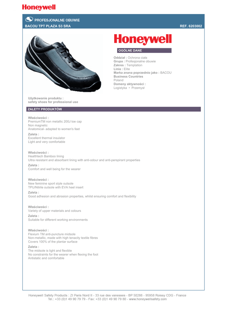 BACOU TPT PLAZA S3 SRA REF. 6203002 OGÓLNE DANE Oddział : Ochrona ciała Grupa : Profesjonalne obuwie Zakres : Temptation Linia : Elite Marka znana poprzednio jako : BACOU Business Countries Poland Domeny aktywności : Logistyka • Przemysł Użytkowanie produktu : safety shoes for professional use ZALETY PRODUKTÓW Właściwości : PremiumTM non metallic 200J toe cap Non magnetic Anatomical- adapted to women's feet Zaleta : Excellent thermal insulator Light and very comfortable Właściwości : Healthtech Bamboo lining Ultra resistant and absorbant lining with anti-odour and anti-perspirant properties Zaleta : Comfort and well being for the wearer Właściwości : New feminine sport style outsole TPU/Nitrile outsole with EVA heel insert Zaleta : Good adhesion and abrasion properties, whilst ensuring comfort and flexibility Właściwości : Variety of upper materials and colours Zaleta : Suitable for different working environments Właściwości : Flexium TM anti-puncture midsole Non-metallic, made with high tenacity textile fibres Covers 100% of the plantar surface Zaleta : The midsole is light and flexible No constraints for the wearer when flexing the foot Antistatic and comfortable OPIS TECHNICZNY Rozmiary : 35-42 Środkowa część podeszwy : Flexium TM anti-puncture midsole. Non-metallic, made with high tenacity textile fibres. Covers 100% of the plantar surface Górna część : Lace-up shoe in water resistant full grain leather Bamboo lining Nosek : PremiumTM non metallic 200J toe cap Non magnetic Wewnętrzna część podeszwy : Anatomical, antistatic, removable insole Wewnętrzna część podeszwy : TPU & Nitril outsole: Good slip resistance coefficient according to EN ISO 20345:2007 SRA Abrasion resistance : Volume loss < 98 mm3 Resistance to oil, hydrocarbons and alkalis in weak concentrations (volume variation < 4%) Good resistance to repeated flexion > 30 000 EVA insert in heel for shock absorption Dodatkowe właściwości : SRA INFORMACJE DODATKOWE Czas użytkowania : If the footwear is supplied with a part of, or the whole sole unit made of polyurethane: We advise that the footwear should be used in the limit of 3 years following the manufacturing date, which figures on the footwear. After this time limit, certain factors such as : exposure to sunlight, hydrometry, temperature changes, could cause a modification in the structure of the material, which would no longer maintain the same performance levels with regards to the requirements defined in the European Directive 89.686 CEE. If the footwear is supplied with a sole unit made from a material other than polyurethane:We advise that the footwear should be used in the limit of 5 years following the manufacturing date, which figures on the footwear. Dane dotyczące przechowywania : Footwear should be stored in their original packaging, kept in a controlled stock area, not subject to rapid changes in temperature or humidity levels. Instrukcja obchodzenia się z produktem : After use leave your footwear to dry in an aired place away from heat. Remove any excess dust or dirt with a brush. Remove any marks using a damp cloth and soap if necessary. Finally polish any grain or pigmented leathers using a commercially available shoe care product. CERTYFIKATY I ZGODNOŚĆ Dyrektywy Unii Europejskiej : 89/686/EEC Kategoria UE Środki ochrony osobistej* : Klasa 2 Normy : EN ISO 20345:2007 Tagging : SPERIAN EN ISO 20345:2007 S3 SRA Reference 620302 Zapewnienie jakości : ISO 9001 / 2000 Numer atestu UE : EN COURS D'HOMOLOGATION Laboratorium : CENTRE TECHNIQUE DU CUIR *PPE : Środki ochrony osobistej (ŚOO) DEKLARACJA ZGODNOŚCI UE Producent lub jego prawny przedstawiciel/dostawca z siedzibą na terenie Unii Europejskiej: Sperian Protection Europe Stwierdza, że opisane tutaj środki ochrony osobistej są zgodne z postaniowieniami Dyrektywy 89/686/CEE Rady Europy: Designation: BACOU TPT PLAZA S3 SRA Reference: 6203002 Standard(s): EN ISO 20345:2007 ŚOO podlega powyższemu typowi atestu UE: EN COURS D'HOMOLOGATION Delivered by: CENTRE TECHNIQUE DU CUIR 4 rue Hermann Frenkel 69367 Lyon Cedex 07 France Sporządzono w Lyon, na 12/15/2008 przez: Ailsa LHOPITAL Oddział: Ochrona ciała AET N° UNDERWAY AET EN COURS D’HOMOLOGATION Sperian Protection Europe (Anciennement dénommée BACOU-DALLOZ EUROPE) 30, avenue Maurice René Simonet BP 163- 26906 Valence Cedex 9 –France Tel : +33 (0) 4 75 40 98 68 –fax : +33 (0) 4 75 40 11 98 www.sperianProtection.com sas au capital de 17 750 000 – Siret 348 982 307 00 135 –APE 518M