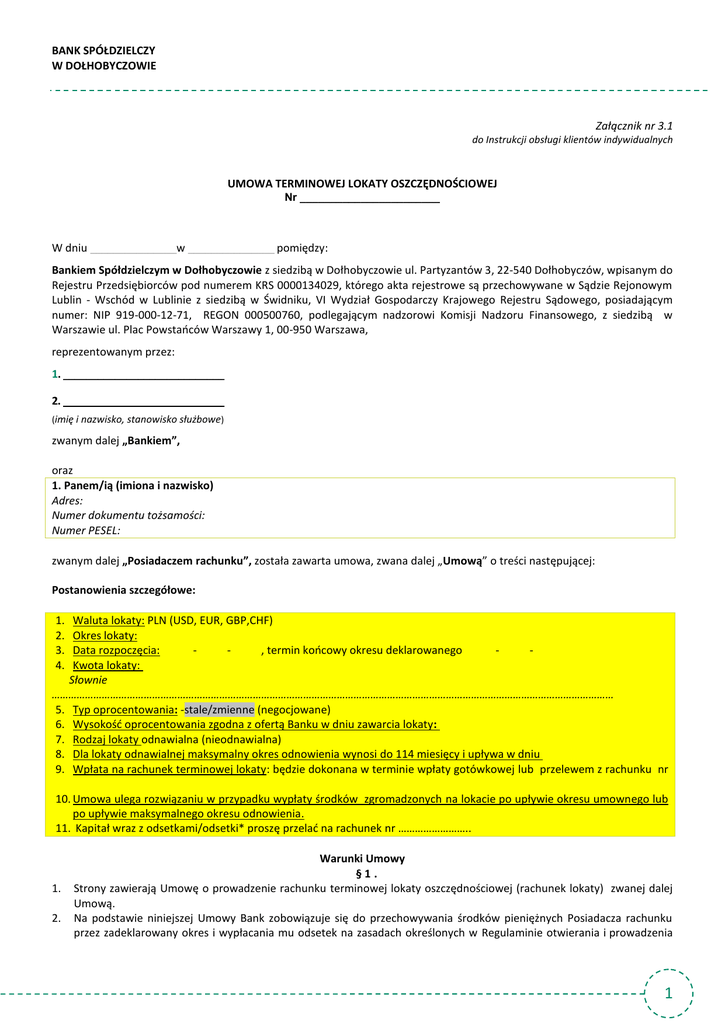 Umowa lokaty - Bank Spółdzielczy w Dołhobyczowie