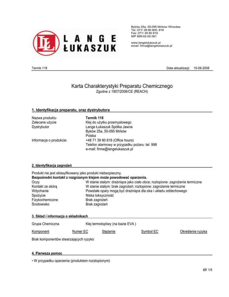 Byków 25a, 55-095 Mirków /Wrocław Tel. 071/ 39 80 800..818 Fax: 071/ 39 80 819 NIP 899-02-02-361 www.langelukaszuk.pl email: [email protected] Termik 118 Data aktualizacji: 15-08-2008 Karta Charakterystyki Preparatu Chemicznego Zgodne z 1907/2006/CE (REACH) 1. Identyfikacja preparatu, oraz dystrybutora Nazwa produktu Zalecane uŜycie Dystrybutor Informacja o produkcie: Termik 118 Klej do uŜytku przemysłowego Lange Łukaszuk Spółka Jawna Byków 25a, 55-095 Mirków Polska +48 71 39 80 818 (Office hours) Telefon alarmowy w przypadku poŜaru: tel. 998 e-mail: [email protected] 2. Identyfikacja zagroŜeń Produkt nie jest sklasyfikowany jako produkt niebezpieczny. Bezpośredni kontakt z rozgrzanym klejem moŜe powodować oparzenia. Oczy W stanie stałym: draŜniące jako ciało obce; roztopione: zagroŜenie termiczne Kontakt ze skórą W stanie stałym: brak zagroŜeń; roztopione: zagroŜenie termiczne Wdychanie Powstałe opary mogą być draŜniące dla oka i układu oddechowego SpoŜycie Niska toksyczność Fizykochemiczne Brak zagroŜeń Środowisko Brak zagroŜeń 3. Skład i informacja o składnikach Grupa Chemiczna Komponent Klej termotopliwy (na bazie EVA ) Numer EC StęŜenie Symbol EC Określenie ryzyka Brak komponentów stwarzających ryzyko 4. Pierwsza pomoc • W przypadku oparzenia (produktem rozstopionym) str 1/5 Byków 25a, 55-095 Mirków /Wrocław Tel. 071/ 39 80 800..818 Fax: 071/ 39 80 819 NIP 899-02-02-361 www.langelukaszuk.pl email: [email protected] Termik 118 Data aktualizacji: 15-08-2008 Natychmiast przemyć oparzone miejsce zimną wodą. Nie próbować mechanicznie usuwać ze skóry związanego produktu, gdyŜ moŜe to spowodować rozliczne rany. Zastosować mokre okłady i niezwłocznie skontaktować się z lekarzem. • W przypadku podraŜnienia dróg oddechowych Przy nadmiernej ekspozycji zapewnić dobrą wentylację. W przypadku jakichkolwiek efektów niepoŜądanych zgłosić się do lekarza. • W przypadku kontaktu ze skórą NIE UśYWAĆ rozpuszczalników ani rozcieńczalników! • W przypadku kontaktu z oczami Natychmiast przemyć duŜą ilością czystej, bieŜącej wody przez co najmniej 10 minut. Skontaktować się bezzwłocznie z lekarzem. • W przypadku połknięcia W przypadku połknięcia, natychmiast skonsultować się z lekarzem. Osobę poszkodowaną ułoŜyć wygodnie. Nie WYWOŁYWAĆ wymiotów. • Wskazówki ogólne W przypadku jakichkolwiek wątpliwości lub gdy objawy nie ustępują naleŜy skonsultować się z lekarzem. Lekarzowi naleŜy pokazać niniejszą kartę charakterystyki, opakowanie lub etykietę. W Ŝadnym przypadku osobie nieprzytomnej nie podawać niczego do ust. 5. Postępowanie w przypadku poŜaru Środki gaśnicze Specjalne wymagania Procedury ZagroŜenie ogniem, wybuchem ZagroŜenie tlenkami spalin Ograniczenie eksplozji (%) Górny limit eksplozji (%) Temperatura zapłonu Piana gaśnicza, CO2 Nie wymagane Łatwopalne w wysokiej temperaturze Karbon, dwutlenek węgla, węglowodory, octan winylu, kwas octowy Nie dotyczy Nie dotyczy > 250 ºC 6. Postępowanie w przypadku niezamierzonego uwolnienia do środowiska Metody oczyszczania i zbierania Poczekać aŜ klej wystygnie, zebrać szpatułką i umieścić w pojemniku na odpady. Nie dopuszczać do przedostania się produktu stopionego do wód gruntowych, powierzchniowych i kanalizacji. 7. Postępowanie z preparatem i magazynowanie Temperatura przechowywania Magazynowanie Temperatura otoczenia Magazynować w krytych pomieszczeniach o temperaturze 5-25 0C przy sprawnie działającej wentylacji. Chronić przed nasłonecznieniem. Po otwarciu opakowanie naleŜy szczelnie zamykać. Na obszarze magazynu przestrzegać zakazu palenia, nie spoŜywać pokarmów. str 2/5 Byków 25a, 55-095 Mirków /Wrocław Tel. 071/ 39 80 800..818 Fax: 071/ 39 80 819 NIP 899-02-02-361 www.langelukaszuk.pl email: [email protected] Termik 118 Pozostałe zalecenia Data aktualizacji: 15-08-2008 Produkt powinien być podgrzewany wyłącznie do zalecanych temperatur. Chronić przed wyładowaniami elektrycznymi, oraz ogniem. 8. Kontrola naraŜenia i środki ochrony indywidualnej Produkt stosować w pomieszczeniach o dobrej wentylacji; nie wolno spoŜywać posiłków, pić oraz palić tytoniu podczas pracy z produktem z wyjątkiem miejsc do tego przeznaczonych. Przy obchodzeniu się z chemikaliami naleŜy przestrzegać zwykłych środków bezpieczeństwa Środki Ochrony Osobistej Ochrona oczu Wymagania dot. rękawic Wymagany ubiór Okulary ochronne, goggle lub przyłbica ochronna EN 166. Odporność termiczna Ubiór roboczy kompletny, lub fartuch ochronny 9. Właściwości fizykochemiczne Substancja czysta / preparat Forma Zapach Temperatura aplikacji Rozpuszczalność w wodzie Gęstość Temperatura zapłonu Preparat Stały Bezzapachowy 160-190 ºC Nierozpouszczalne 0,98 > 300 º C 10. Stabilność i reaktywność Stabilność Reakywność Stabilny Nie dotyczy 11. Informacje toksykologiczne Oczy Kontakt ze skórą Wdychanie SpoŜycie DłuŜszy kontakt z substancją Dane toksykologiczne W stanie stałym: draŜniące jako ciało obce; roztopione: zagroŜenie termiczne W stanie stałym: brak zagroŜeń; roztopione: zagroŜenie termiczne Powstałe opary mogą być draŜniące dla oka i układu oddechowego Niska toksyczność Nie testowano Brak danych str 3/5 Byków 25a, 55-095 Mirków /Wrocław Tel. 071/ 39 80 800..818 Fax: 071/ 39 80 819 NIP 899-02-02-361 www.langelukaszuk.pl email: [email protected] Termik 118 Data aktualizacji: 15-08-2008 12. Informacje ekologiczne Wpływ na środowisko Potencjalny efekt dla bioakumulacji Słabo biodegradowalne; Nieropuszczalne w wodzie Brak 13. Postępowanie z odpadami Metody usuwania odpadów Postępowanie z opakowaniem Zgodnie z przepisami krajowymi, oraz U.E. MoŜliwość ponownego wykorzystania jeśli czyste Traktować jako pozostałość produktu jeśli brudne. 14. Informacje o transporcie Produkt nie jest sklasyfikowany jako produkt niebezpieczny w sensie przepisów tra