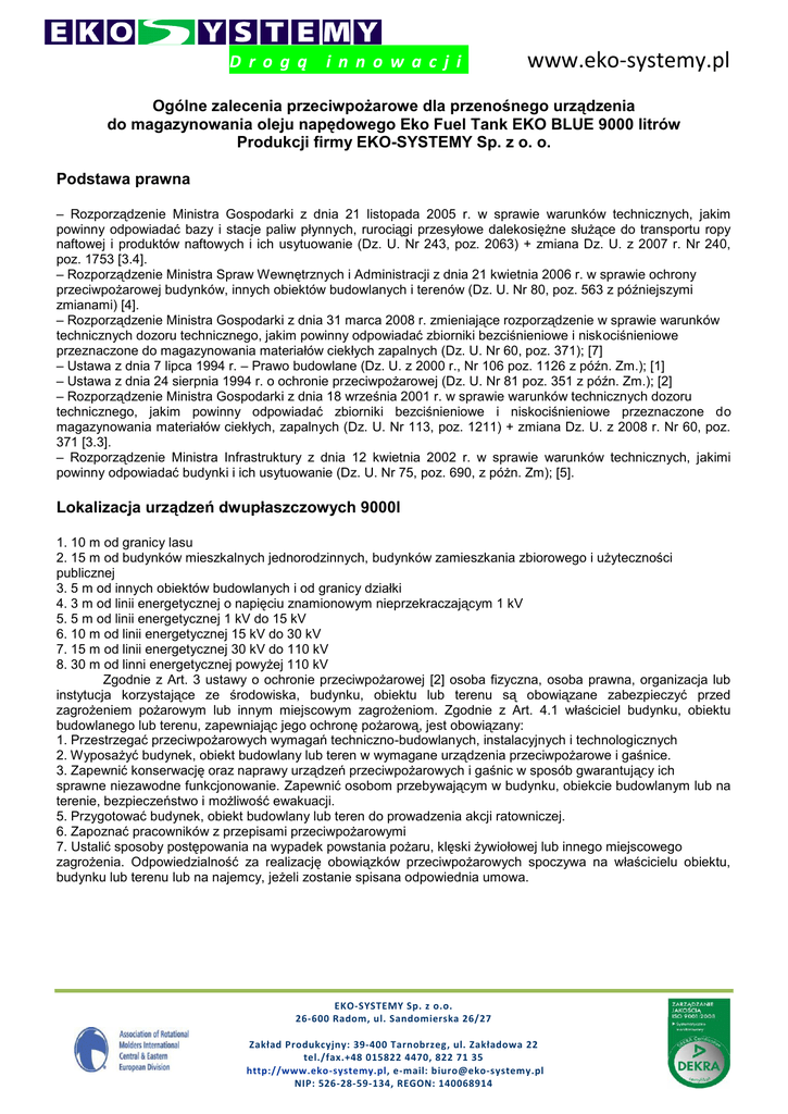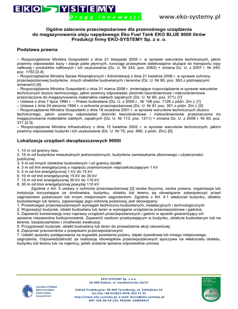 D ro g ą i n n o w a cj i www.eko-systemy.pl Ogólne zalecenia przeciwpożarowe dla przenośnego urządzenia do magazynowania oleju napędowego Eko Fuel Tank EKO BLUE 9000 litrów Produkcji firmy EKO-SYSTEMY Sp. z o. o. Podstawa prawna – Rozporządzenie Ministra Gospodarki z dnia 21 listopada 2005 r. w sprawie warunków technicznych, jakim powinny odpowiadać bazy i stacje paliw płynnych, rurociągi przesyłowe dalekosiężne służące do transportu ropy naftowej i produktów naftowych i ich usytuowanie (Dz. U. Nr 243, poz. 2063) + zmiana Dz. U. z 2007 r. Nr 240, poz. 1753 [3.4]. – Rozporządzenie Ministra Spraw Wewnętrznych i Administracji z dnia 21 kwietnia 2006 r. w sprawie ochrony przeciwpożarowej budynków, innych obiektów budowlanych i terenów (Dz. U. Nr 80, poz. 563 z późniejszymi zmianami) [4]. – Rozporządzenie Ministra Gospodarki z dnia 31 marca 2008 r. zmieniające rozporządzenie w sprawie warunków technicznych dozoru technicznego, jakim powinny odpowiadać zbiorniki bezciśnieniowe i niskociśnieniowe przeznaczone do magazynowania materiałów ciekłych zapalnych (Dz. U. Nr 60, poz. 371); [7] – Ustawa z dnia 7 lipca 1994 r. – Prawo budowlane (Dz. U. z 2000 r., Nr 106 poz. 1126 z późn. Zm.); [1] – Ustawa z dnia 24 sierpnia 1994 r. o ochronie przeciwpożarowej (Dz. U. Nr 81 poz. 351 z późn. Zm.); [2] – Rozporządzenie Ministra Gospodarki z dnia 18 września 2001 r. w sprawie warunków technicznych dozoru technicznego, jakim powinny odpowiadać zbiorniki bezciśnieniowe i niskociśnieniowe przeznaczone do magazynowania materiałów ciekłych, zapalnych (Dz. U. Nr 113, poz. 1211) + zmiana Dz. U. z 2008 r. Nr 60, poz. 371 [3.3]. – Rozporządzenie Ministra Infrastruktury z dnia 12 kwietnia 2002 r. w sprawie warunków technicznych, jakimi powinny odpowiadać budynki i ich usytuowanie (Dz. U. Nr 75, poz. 690, z póżn. Zm); [5]. Lokalizacja urządzeń dwupłaszczowych 9000l 1. 10 m od granicy lasu 2. 15 m od budynków mieszkalnych jednorodzinnych, budynków zamieszkania zbiorowego i użyteczności publicznej 3. 5 m od innych obiektów budowlanych i od granicy działki 4. 3 m od linii energetycznej o napięciu znamionowym nieprzekraczającym 1 kV 5. 5 m od linii energetycznej 1 kV do 15 kV 6. 10 m od linii energetycznej 15 kV do 30 kV 7. 15 m od linii energetycznej 30 kV do 110 kV 8. 30 m od linni energetycznej powyżej 110 kV Zgodnie z Art. 3 ustawy o ochronie przeciwpożarowej [2] osoba fizyczna, osoba prawna, organizacja lub instytucja korzystające ze środowiska, budynku, obiektu lub terenu są obowiązane zabezpieczyć przed zagrożeniem pożarowym lub innym miejscowym zagrożeniom. Zgodnie z Art. 4.1 właściciel budynku, obiektu budowlanego lub terenu, zapewniając jego ochronę pożarową, jest obowiązany: 1. Przestrzegać przeciwpożarowych wymagań techniczno-budowlanych, instalacyjnych i technologicznych 2. Wyposażyć budynek, obiekt budowlany lub teren w wymagane urządzenia przeciwpożarowe i gaśnice. 3. Zapewnić konserwację oraz naprawy urządzeń przeciwpożarowych i gaśnic w sposób gwarantujący ich sprawne niezawodne funkcjonowanie. Zapewnić osobom przebywającym w budynku, obiekcie budowlanym lub na terenie, bezpieczeństwo i możliwość ewakuacji. 5. Przygotować budynek, obiekt budowlany lub teren do prowadzenia akcji ratowniczej. 6. Zapoznać pracowników z przepisami przeciwpożarowymi 7. Ustalić sposoby postępowania na wypadek powstania pożaru, klęski żywiołowej lub innego miejscowego zagrożenia. Odpowiedzialność za realizację obowiązków przeciwpożarowych spoczywa na właścicielu obiektu, budynku lub terenu lub na najemcy, jeżeli zostanie spisana odpowiednia umowa. EKO-SYSTEMY Sp. z o.o. 26-600 Radom, ul. Sandomierska 26/27 Zakład Produkcyjny: 39-400 Tarnobrzeg, ul. Zakładowa 22 tel./fax.+48 015822 4470, 822 71 35 http://www.eko-systemy.pl, e-mail: [email protected] NIP: 526-28-59-134, REGON: 140068914 D ro g ą i n n o w a cj i www.eko-systemy.pl Wyposażenie urządzenia 1. System napełniania powinien być zgodny warunkami określonymi przez producenta. Przyłącze przewodów wlewowych powinno być usytuowane w sposób pozwalający na swobodny dojazd cysterny samochodowej. 2. Instalacja do rozładunku paliwa olejowego i napełniania Eko Fuel Tank powinna mieć szczelne połączenie od cysterny do urządzenia i być skutecznie uziemiona linka miedzianą o przekroju 16 mm kwadratowych do króćca uziemiającego, umieszczonego w pobliżu urządzenia, aby odprowadzić ewentualne ładunki elektryczności statycznej do ziemi. 3. Do napełniania Eko Fuel Tank zaleca się szczelne złącze o średnicy 50 mm dostosowane do przyłącza węża cysterny. 4. Obudowa odmierzacza paliwa powinna być uziemiona. 5. Producent Eko Fuel Tank w dokumentacji przekazanej użytkownikowi powinien umieścić informacje, że w pobliżu urządzenia należy umieścić gaśnicę proszkową 12 kg i oznakować zgodnie z PN-92/N-01256/01 znakiem bezpieczeństwa „Gaśnica” 6. Użytkownik powinien umieścić w pobliżu urządzenia znak bezpieczeństwa ochrony przeciwpożarowej „zakaz używania otwartego ognia i palenia tytoniu” zgodny z PN-92/N-01256/01 7. Należy stosować odpowiednie środki techniczne, które zagwarantują nie przekroczenie poziomu maksymalnego poziomu napełniania. 8. Każde urządzenie powinno mieć w widocznym miejscu oznaczenie: pojemność nominalną zbiornika, ciśnienie próbne, nazwę i rodzaj składowanego paliwa, nazwę producenta, datę produkcji, numer seryjny. 9. Do każdego Eko Fuel Tank powinna być dołączona instrukcja eksploatacji: a) Charakterystykę urządzenia b) Opis czynności związanych z napełnianiem, magazynowaniem i opróżnianiem zbiornika c) Zasady bezpieczeństwa i higieny pracy, ze szczególnym uwzględnieniem czynnika znajdującego się w zbiorniku oraz skażenia mikrobiologicznego d) Wymagania dotyczące obsługi urządzeń zabezpieczających, czynności związany z konserwa