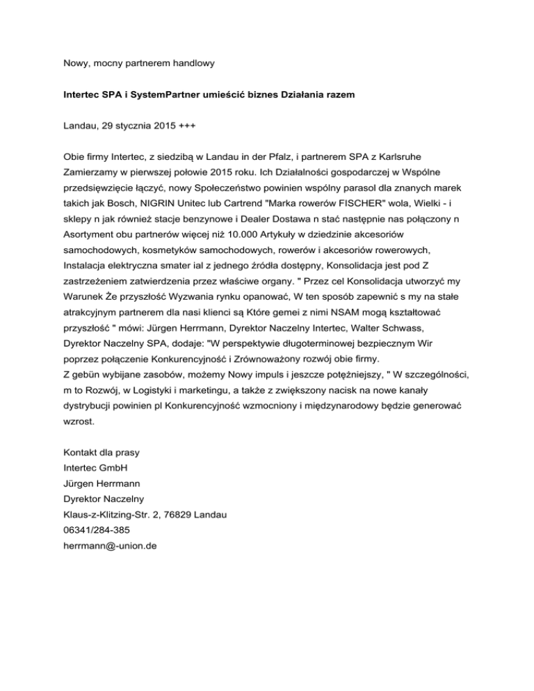 Nowy, mocny partnerem handlowy Intertec SPA i SystemPartner umieścić biznes Działania razem Landau, 29 stycznia 2015 +++ Obie firmy Intertec, z siedzibą w Landau in der Pfalz, i partnerem SPA z Karlsruhe Zamierzamy w pierwszej połowie 2015 roku. Ich Działalności gospodarczej w Wspólne przedsięwzięcie łączyć, nowy Społeczeństwo powinien wspólny parasol dla znanych marek takich jak Bosch, NIGRIN Unitec lub Cartrend "Marka rowerów FISCHER" wola, Wielki - i sklepy n jak również stacje benzynowe i Dealer Dostawa n stać następnie nas połączony n Asortyment obu partnerów więcej niż 10.000 Artykuły w dziedzinie akcesoriów samochodowych, kosmetyków samochodowych, rowerów i akcesoriów rowerowych, Instalacja elektryczna smater ial z jednego źródła dostępny, Konsolidacja jest pod Z zastrzeżeniem zatwierdzenia przez właściwe organy. " Przez cel Konsolidacja utworzyć my Warunek Że przyszłość Wyzwania rynku opanować, W ten sposób zapewnić s my na stałe atrakcyjnym partnerem dla nasi klienci są Które gemei z nimi NSAM mogą kształtować przyszłość " mówi: Jürgen Herrmann, Dyrektor Naczelny Intertec, Walter Schwass, Dyrektor Naczelny SPA, dodaje: "W perspektywie długoterminowej bezpiecznym Wir poprzez połączenie Konkurencyjność i Zrównoważony rozwój obie firmy. Z gebün wybijane zasobów, możemy Nowy impuls i jeszcze potężniejszy, " W szczególności, m to Rozwój, w Logistyki i marketingu, a także z zwiększony nacisk na nowe kanały dystrybucji powinien pl Konkurencyjność wzmocniony i międzynarodowy będzie generować wzrost. Kontakt dla prasy Intertec GmbH Jürgen Herrmann Dyrektor Naczelny Klaus-z-Klitzing-Str. 2, 76829 Landau 06341/284-385 [email protected]