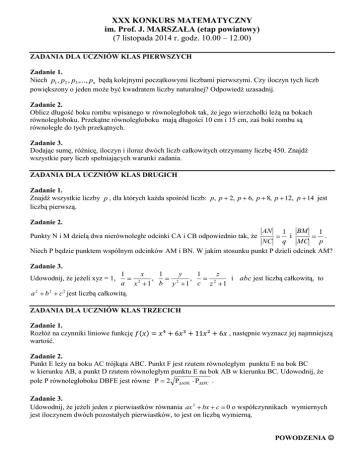 XXX KONKURS MATEMATYCZNY im. Prof. J. MARSZAŁA (etap powiatowy) (7 listopada 2014 r. godz. 10.00 – 12.00) ZADANIA DLA UCZNIÓW KLAS PIERWSZYCH Zadanie 1. Niech p1 , p2 , p3 ,..., pn będą kolejnymi początkowymi liczbami pierwszymi. Czy iloczyn tych liczb powiększony o jeden może być kwadratem liczby naturalnej? Odpowiedź uzasadnij. Zadanie 2. Oblicz długość boku rombu wpisanego w równoległobok tak, że jego wierzchołki leżą na bokach równoległoboku. Przekątne równoległoboku mają długości 10 cm i 15 cm, zaś boki rombu są równoległe do tych przekątnych. Zadanie 3. Dodając sumę, różnicę, iloczyn i iloraz dwóch liczb całkowitych otrzymamy liczbę 450. Znajdź wszystkie pary liczb spełniających warunki zadania. ZADANIA DLA UCZNIÓW KLAS DRUGICH Zadanie 1. Znajdź wszystkie liczby p , dla których każda spośród liczb: p, p 2, p 6, p 8, p 12, p 14 jest liczbą pierwszą. Zadanie 2. 1 BM 1 i . NC q MC p Niech P będzie punktem wspólnym odcinków AM i BN. W jakim stosunku punkt P dzieli odcinek AM? Punkty N i M dzielą dwa nierównoległe odcinki CA i CB odpowiednio tak, że AN Zadanie 3. Udowodnij, że jeżeli xyz = 1, a2 b2 1 a x x 2 1 , 1 b y y 2 1 , 1 c z z 2 1 i abc jest liczbą całkowitą, to c 2 jest liczbą całkowitą. ZADANIA DLA UCZNIÓW KLAS TRZECICH Zadanie 1. Rozłóż na czynniki liniowe funkcję wartość. , następnie wyznacz jej najmniejszą Zadanie 2. Punkt E leży na boku AC trójkąta ABC. Punkt F jest rzutem równoległym punktu E na bok BC w kierunku AB, a punkt D rzutem równoległym punktu E na bok AB w kierunku BC. Udowodnij, że pole P równoległoboku DBFE jest równe P 2 P ADE P EFC . Zadanie 3. Udowodnij, że jeżeli jeden z pierwiastków równania ax 3 bx c 0 o współczynnikach wymiernych jest iloczynem dwóch pozostałych pierwiastków, to jest on liczbą wymierną. POWODZENIA