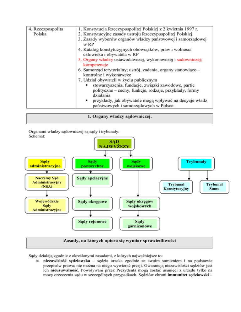 4. Rzeczpospolita Polska 1. Konstytucja Rzeczypospolitej Polskiej z 2 kwietnia 1997 r. 2. Konstytucyjne zasady ustroju Rzeczypospolitej Polskiej 3. Zasady wyborów organów władzy państwowej i samorządowej w RP 4. Katalog konstytucyjnych obowiązków, praw i wolności człowieka i obywatela w RP 5. Organy władzy ustawodawczej, wykonawczej i sadowniczej; kompetencje 6. Samorząd terytorialny; ustrój, zadania, organy stanowiąco – kontrolne i wykonawcze 7. Udział obywateli w Ŝyciu publicznym stowarzyszenia, fundacje, związki zawodowe, partie polityczne – cechy, funkcje, rodzaje, przykłady, formy działania przykłady, jak obywatele mogą wpływać na decyzje władz państwowych i samorządowych w Polsce 1. Organy władzy sądowniczej. Organami władzy sądowniczej są sądy i trybunały: Schemat: SĄD NAJWYśSZY Sądy administracyjne Sądy powszechne Sądy wojskowe Naczelny Sąd Administracyjny (NSA) Sądy apelacyjne Wojewódzkie Sądy Administracyjne Sądy okręgowe Sądy okręgów wojskowych Sądy rejonowe Sądy garnizonowe Trybunały Trybunał Konstytucyjny Trybunał Stanu Zasady, na których opiera się wymiar sprawiedliwości Sądy działają zgodnie z określonymi zasadami, z których najwaŜniejsze to: • niezawisłość sędziowska – sędzia orzeka zgodnie ze swoim sumieniem i na podstawie przepisów prawa; nie moŜna na niego wywierać presji. Gwarancją niezawisłości sędziów jest ich nieusuwalność. Powoływani przez Prezydenta mogą zostać usunięci z urzędu tylko na mocy orzeczenia sądu w szczególnych przypadkach. Sędziów chroni immunitet sędziowski – • • • • • sędzia nie moŜe zostać pociągnięty do odpowiedzialności karnej ani pozbawiony wolności bez zgody sadu. MoŜna aresztować sędziego tylko wówczas gdy złapano go na gorącym uczynku. dwuinstancyjność procesu sądowego – sąd pierwszej instancji to sąd, który jako pierwszy rozpatruje daną sprawę. Od orzeczenia (wyroku) sądu pierwszej instancji moŜna się odwołać do sądu drugiej instancji, czyli złoŜyć apelację. Sąd wyŜszej instancji ponownie bada sprawę. MoŜe stwierdzić, Ŝe: sąd pierwszej instancji wydał sprawiedliwy wyrok i go podtrzymać sąd pierwszej instancji się pomylił i kieruje sprawę do sądu pierwszej instancji do ponownego rozpatrzenia sąd pierwszej instancji się pomylił, sąd drugiej instancji wydał nowy wyrok. prawo oskarŜonego do obrony – oskarŜony moŜe bronić się sam, moŜe wybrać obrońcę lub otrzymać obrońcę z urzędu. zasada domniemanej niewinności oskarŜonego – oskarŜony jest winien popełnionych czynów tylko wtedy, gdy wina została mu udowodniona. Wszelkie wątpliwości rozstrzygane są na korzyść oskarŜonego. jawność rozpraw – kaŜdy kto jest zainteresowany moŜe oglądać przebieg rozprawy. Ze względu na moralność, bezpieczeństwo państwa i porządek publiczny oraz ochronę Ŝycia prywatnego stron moŜna utajnić rozprawę jednakŜe wyrok zawsze jest ogłaszany publicznie. zasada kolegialności – oznacza, Ŝe sprawę rozpoznaje i orzeka zespół (kilka osób). W przypadku sądu pierwszej instancji jest to sędzia zawodowy i 2 ławników; w sądzie drugiej instancji i Sądzie NajwyŜszym jest to zespół (kilku) sędziów zawodowych Organy wymiaru sprawiedliwości – kompetencje SĄD NAJWYśSZY • • • • Organ władzy sprawujący nadzór nad działalnością sądów powszechnych i wojskowych składa się z Pierwszego Prezesa Sądu NajwyŜszego, prezesów i sędziów powoływanych na 6 lat Pierwszego Prezesa Sądu NajwyŜszego i pozostałych sędziów powołuje Prezydent Sąd dzieli się na 4 izby: cywilną, karną, wojskową, pracy i ubezpieczeń społecznych Kompetencje : o rozpoznaje kasację, czyli odwołania od wyroków sądów drugiej instancji z powodu złamania prawa w trakcie postępowania sądowego o interpretuje przepisy prawa o stwierdza waŜność przepisów prezydenckich, wyborów do parlamentu oraz waŜności referendum konstytucyjnego i ogólnokrajowego SĄDY POWSZECHNE Sądy powszechne są dwuinstancyjne sądy rejonowe są najniŜszą instancją (w powiatach) – rozpatrują większość spraw sądy okręgowe (w miastach wojewódzkich) są sądami drugiej instancji – rozpatrują odwołania od orzeczeń sądów rejonowych. Jednocześnie są sądami pierwszej instancji przy rozpatrywaniu spraw zbrodni lub rozwodów; sądy apelacyjne – rozpatrują odwołania od wyroków sądów okręgowych (gdy sąd okręgowy był sądem pierwszej instancji) Sądy grodzkie działają przy sądach rejonowych. Zajmują się sądzeniem wykroczeń (wykroczenia to czyny szkodliwe społecznie, które nie są przestępstwami). SĄDY WOJSKOWE Rozpatrują przestępstwa popełniane przez Ŝołnierzy słuŜby czynnej, oraz w sprawach o niektóre przestępstwa popełniane przez pracowników cywilnych wojska.. Sądy wojskowe są dwuinstancyjne: • sądy garnizonowe to sądy pierwszej instancji • sądy okręgu wojskowego to sądy drugie instancji dla spraw rozpatrywanych przez sądy garnizonowe; są to równieŜ sądy pierwszej instancji dla spraw Ŝołnierzy posiadających najwyŜsze stopnie wojskowe. SĄDY ADMINISTRACYJNE Sądownictwo administracyjne jest dwuinstancyjne : • sądami pierwszej instancji są wojewódzkie sądy administracyjne, które rozpatrują wszystkie sprawy naleŜące do kompetencji sądów administracyjnych • sądem drugiej instancji jest Naczelny Sąd Administracyjny, który rozpatruje apelacje od wyroków sądów wojewódzkich. Na czele NSA stoi prezes powoływany przez Prezydenta na kadencję 6 lat. Kompetencje sądów administracyjnych: o kontrola działania organów administracji publicznej o rozstrzyganie sporów między jednostkami samorządu oraz samorządem a jednostkami administracji państwowej o rozstrzyganie sporów między obywatelami a jednostkami administracji (urzędami) o orzekanie o zgodności z ustawami uchwał organów samorządu terytorialnego TRYB